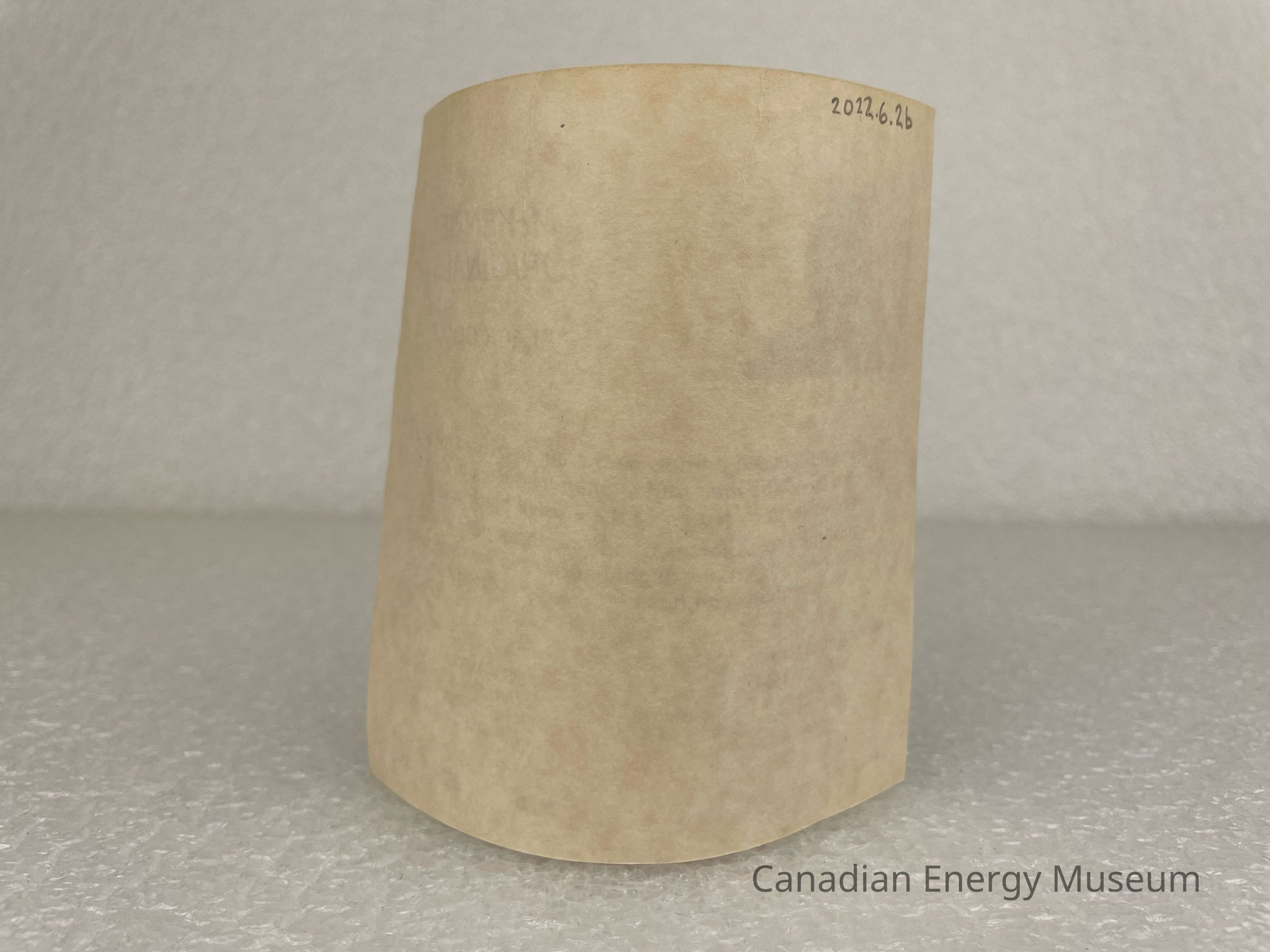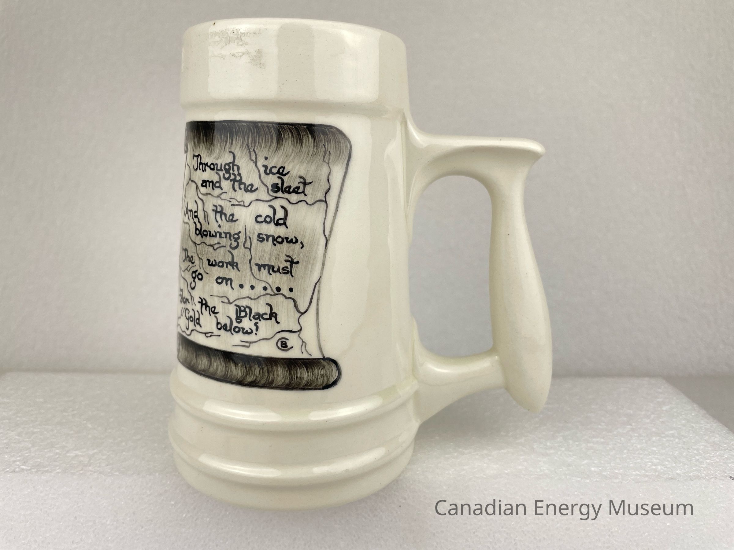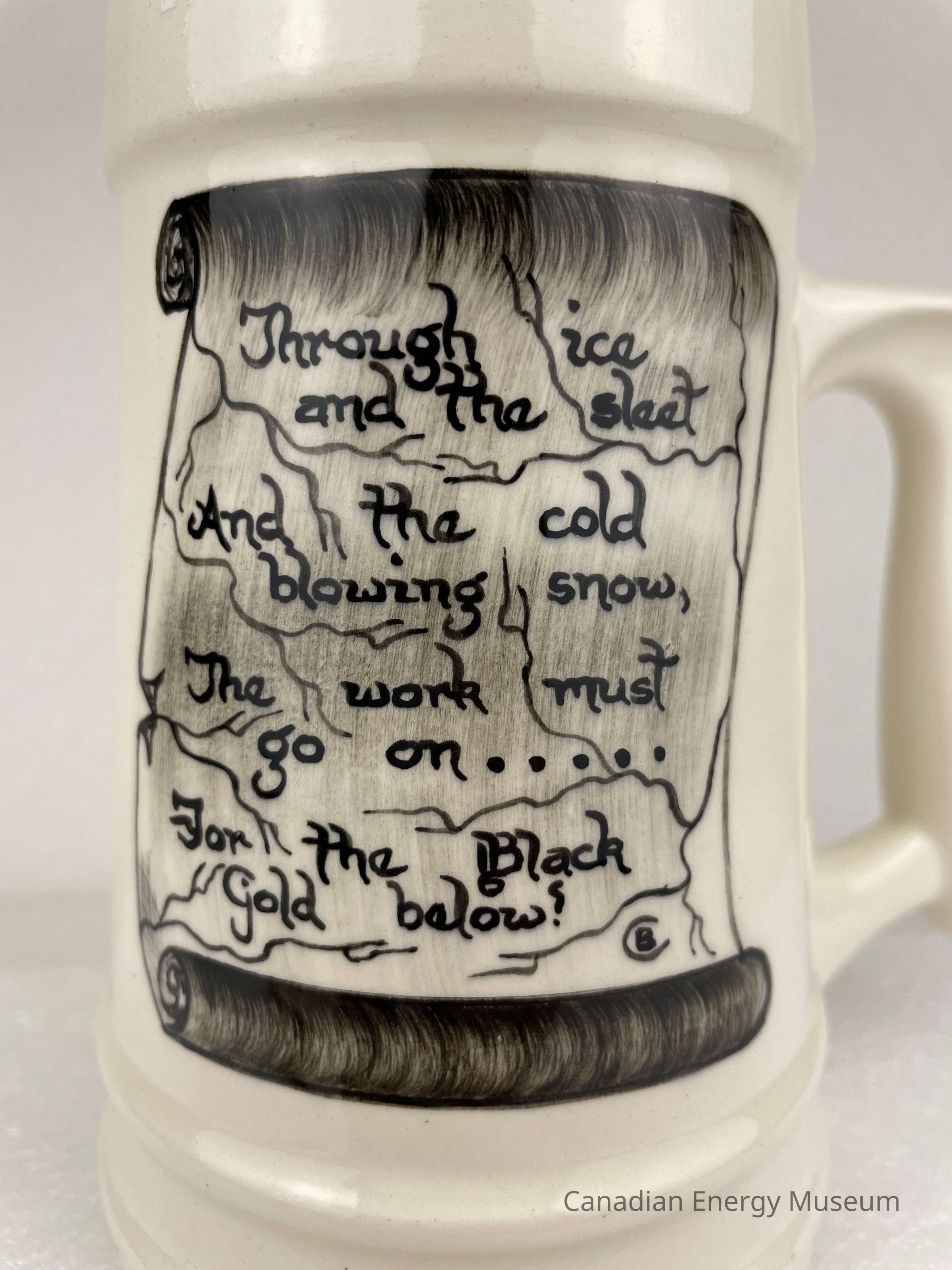 A large ceramic beer tankard hand-painted by McKenzie Originals. The background of the tankard is glazed white with black painted illustrations on either side. On one side of the tankard is a painted image of an oil rig site with multiple buildings, an oil derrick, machinery, a cloudy sky, all resting on a rectangular patch of earth. The other side of the tankard features a painted image of a scroll that has been decorated to look old and cracked. On the scroll is black stylized text reading, "Through ice and the sleet And the cold blowing snow, The work must go on..... For the Black Gold below!"