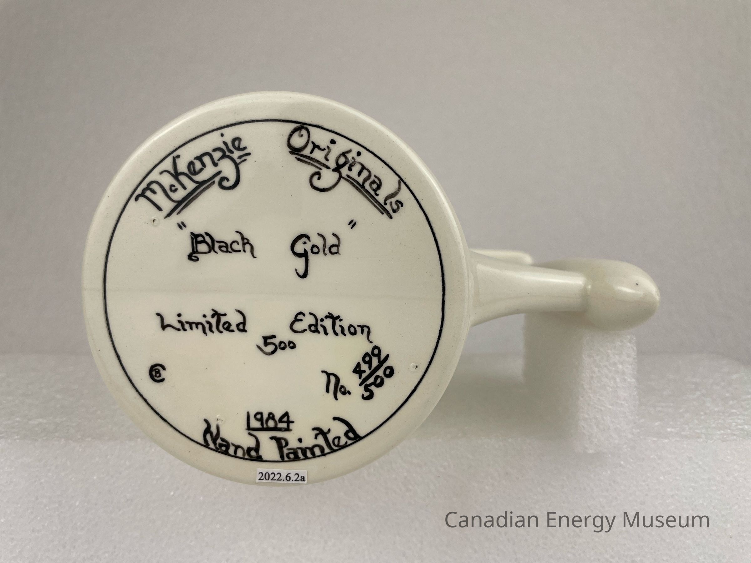 The bottom of the tankard is white with a large black ring close to the border of the base. Inside the ring is black, handwritten, painted text reading from top to bottom, ".McKenzie Originals. / "Black Gold" / Limited Edition / 500 / No. 499/500 / 1984 / ~Hand Painted~".