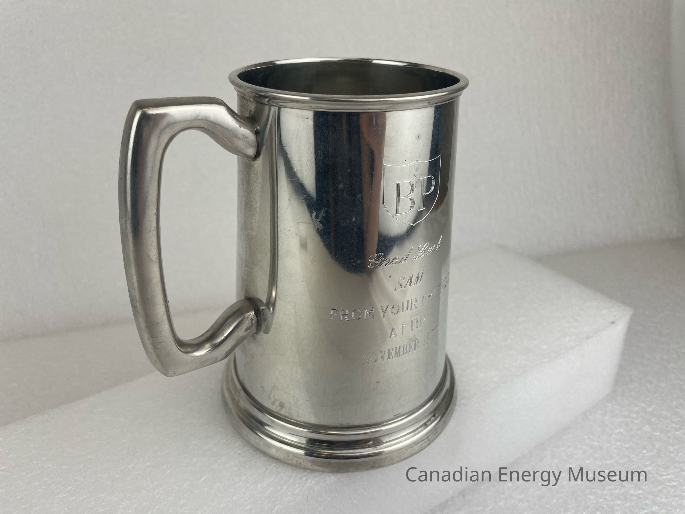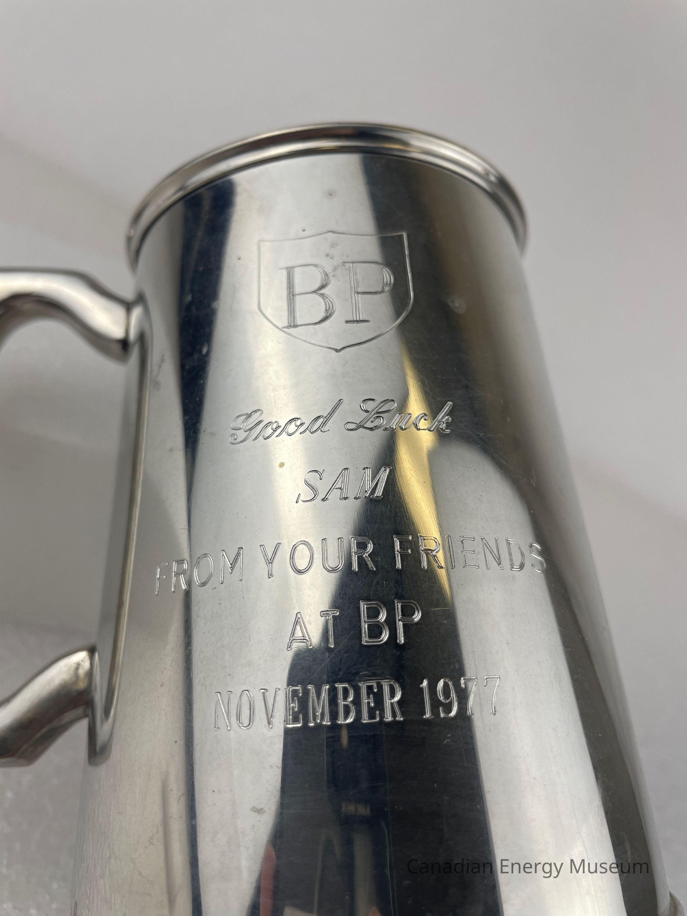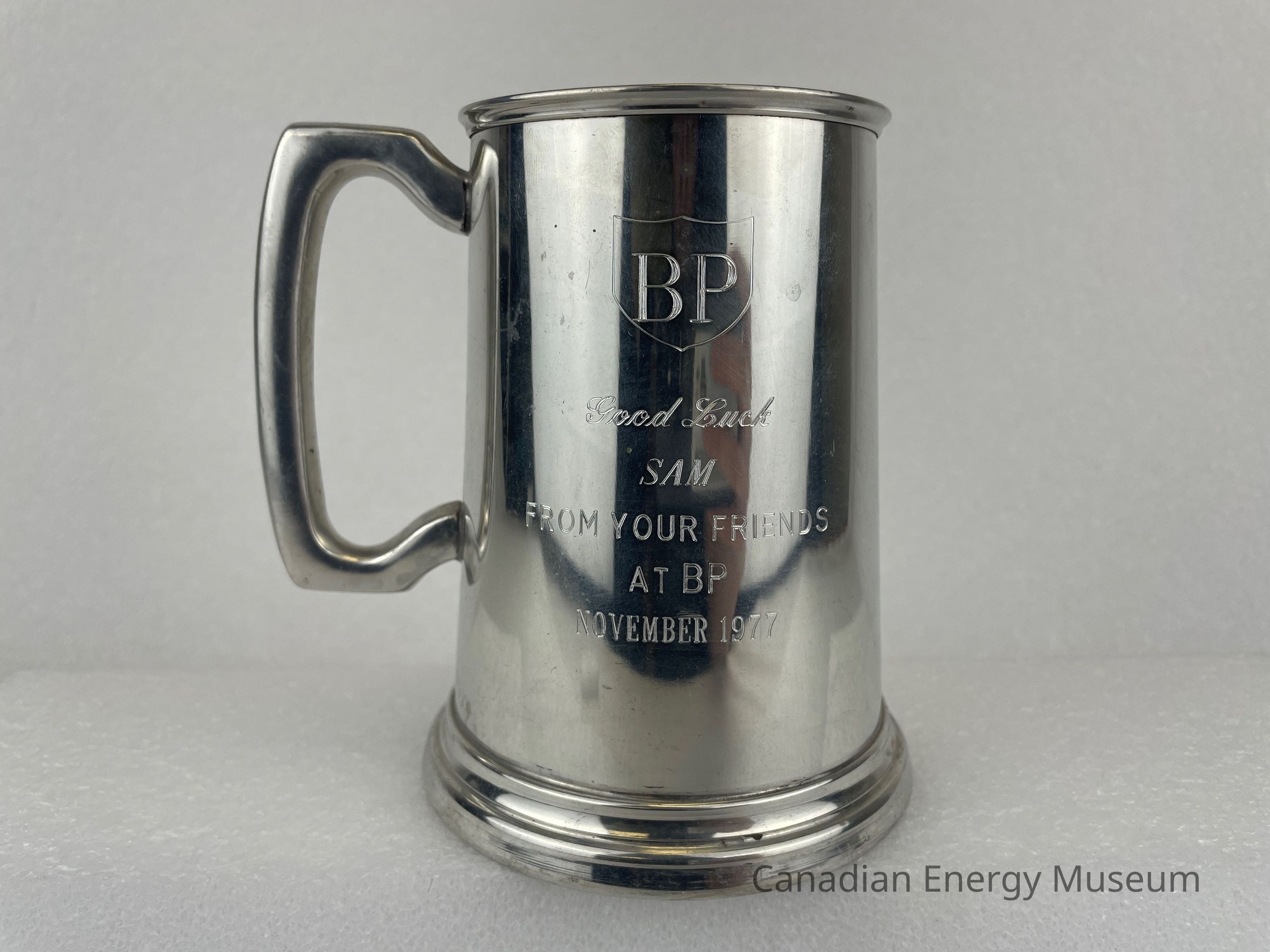 Old Description: Pewter beer tankard with handle and glass bottom. Etched on one side is BP inside a shield. Text below reads: Good Luck / Sam / From Your Friends / At BP / November 1977.Collection