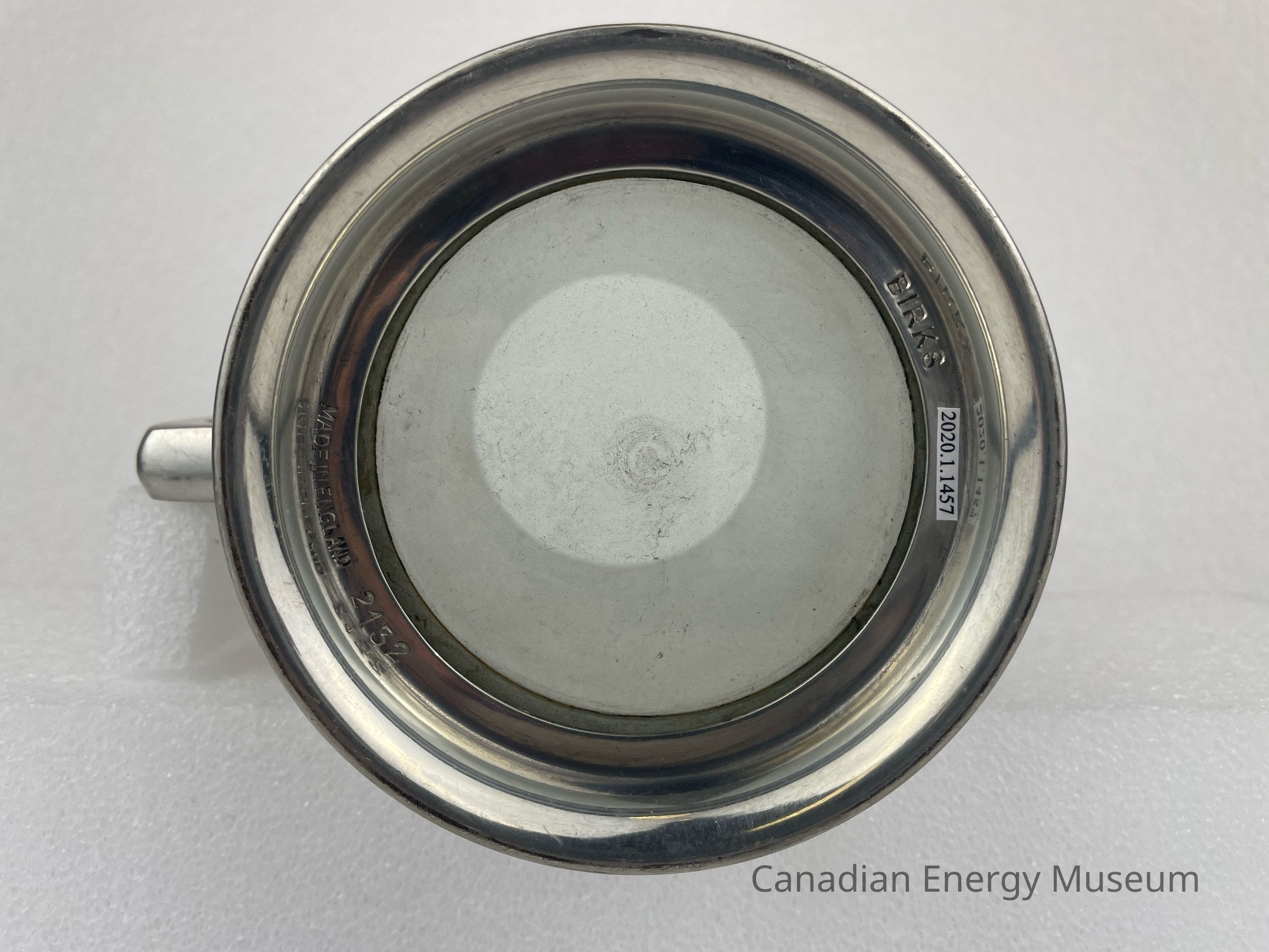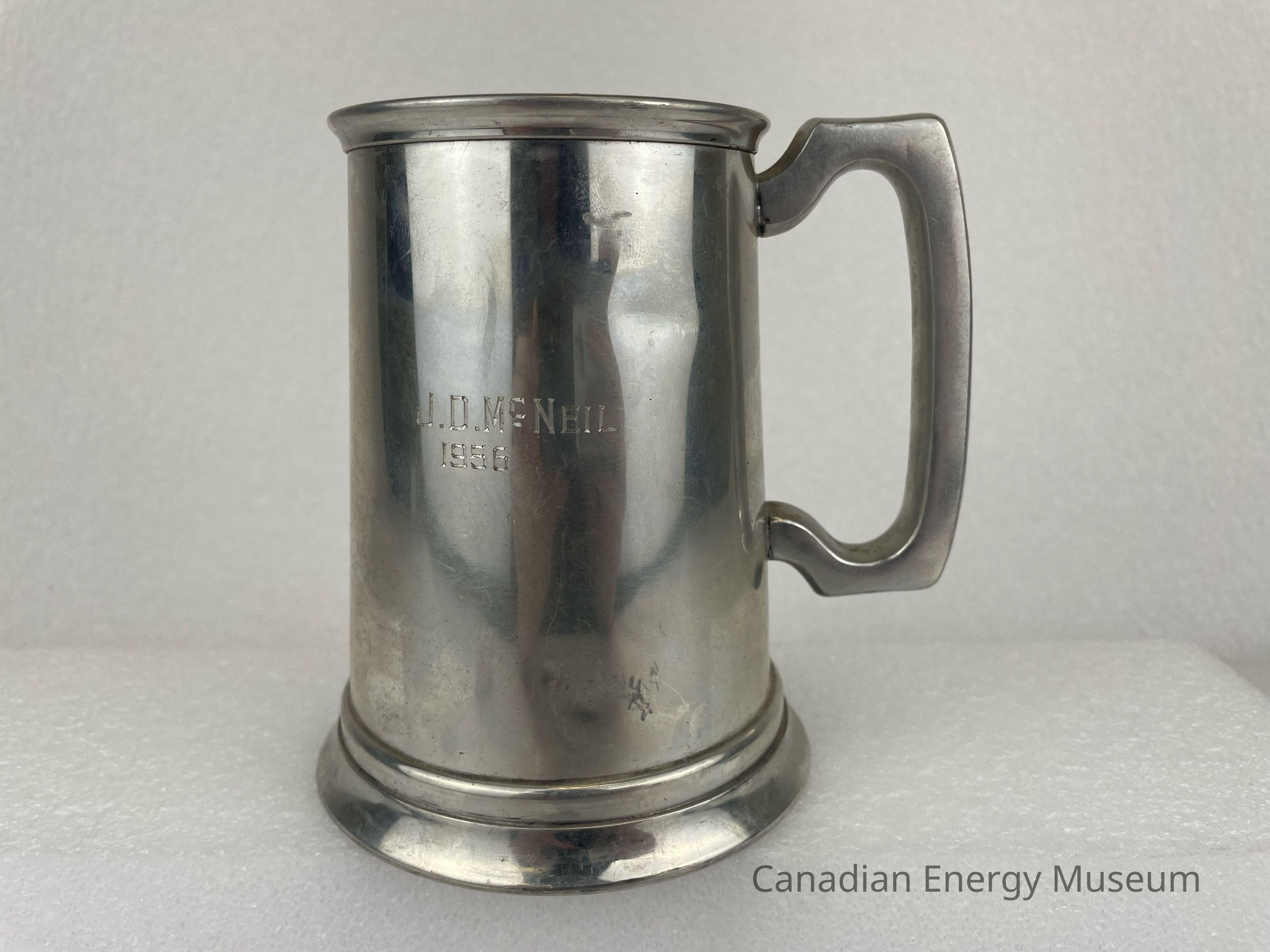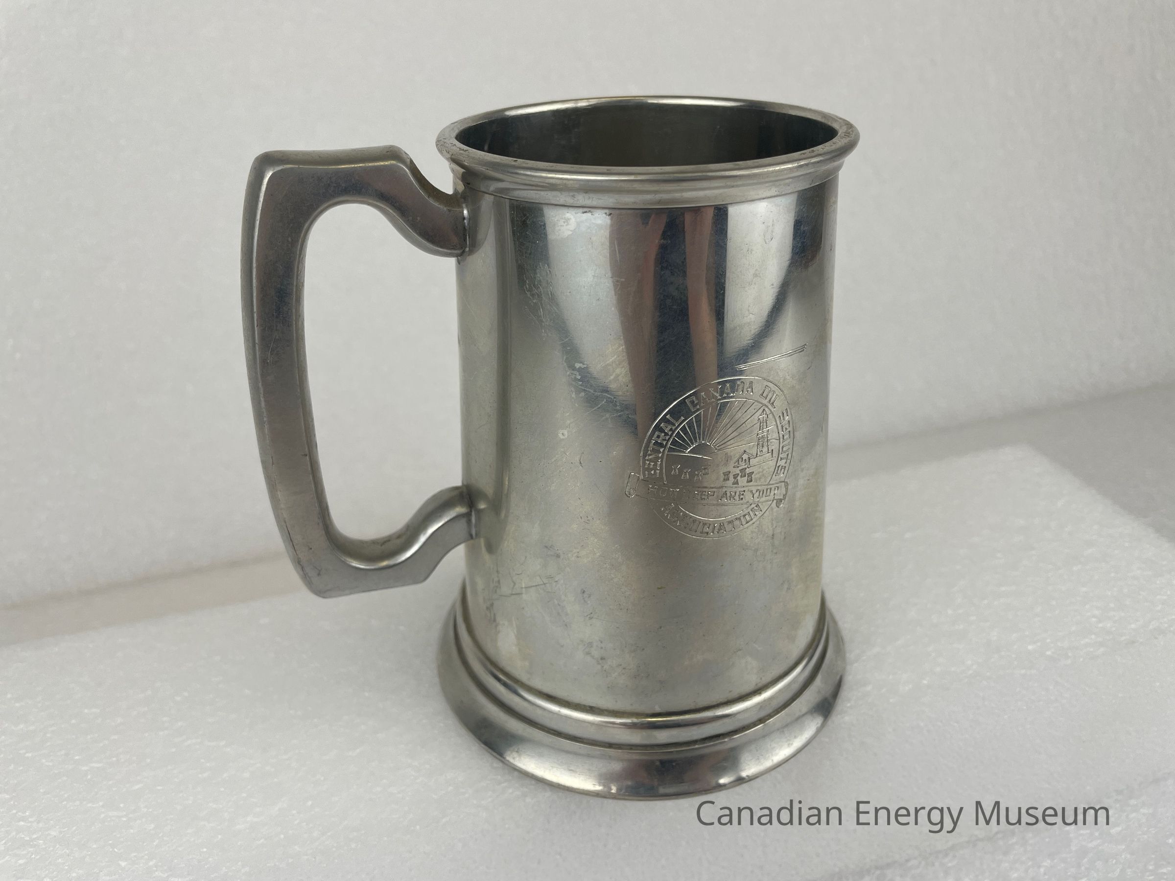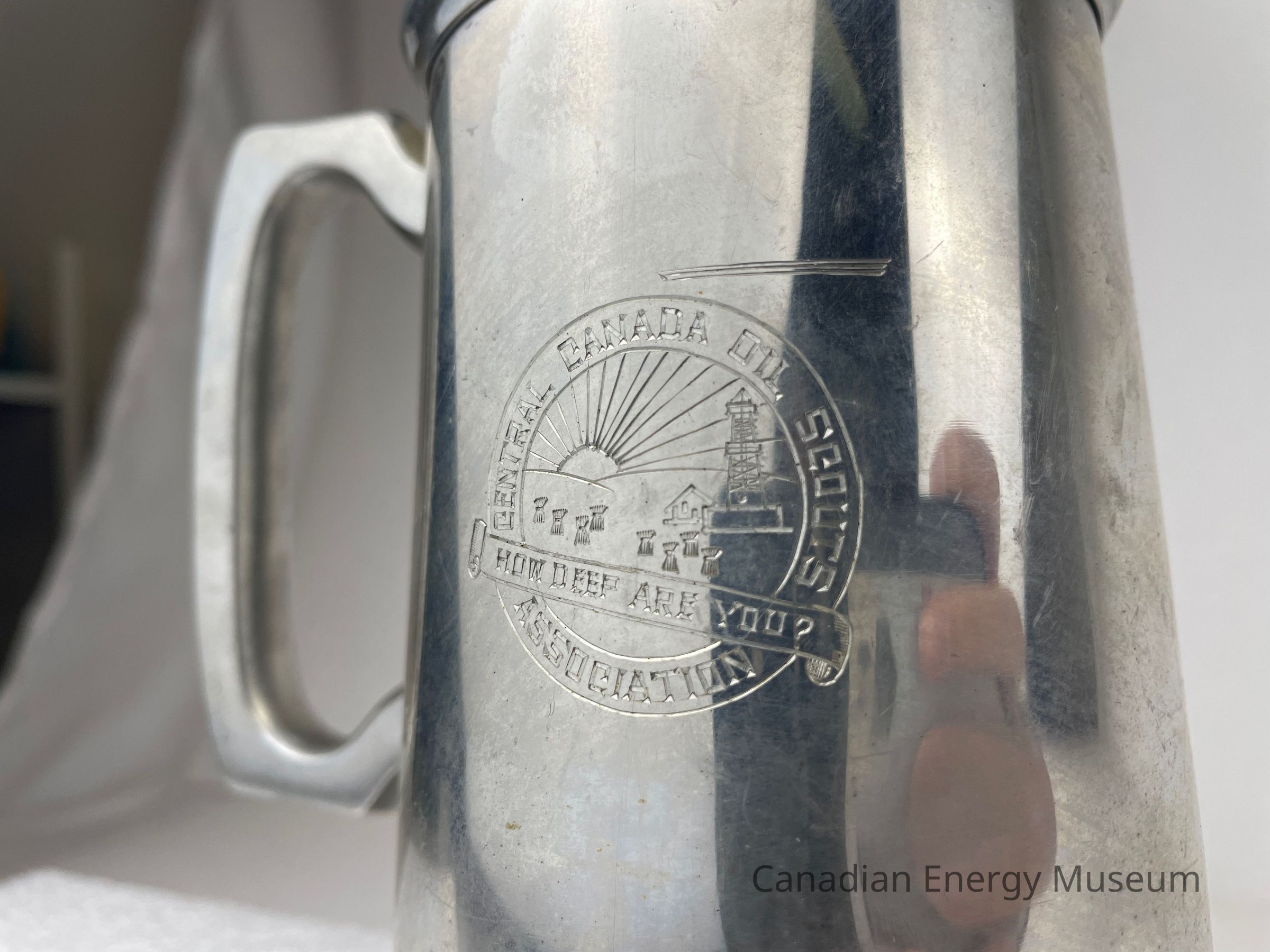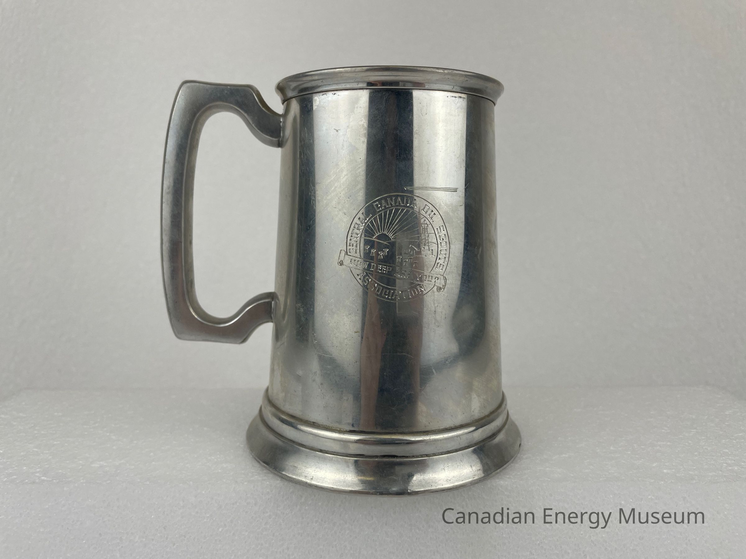 Pewter beer tankard with handle and glass bottom. The front of the tankard features an etched design with a circular border. The centre circle displays a sun with rays over a field of wheat sheaves and an oil derrick. Text along the outside of the inner circle reads, "CENTRAL CANADA OIL SCOUTS ASSOCIATION". A banner spreads across the bottom of the circle with text reading, "HOW DEEP ARE YOU?" The back side of the tankard features etched text that reads, "J.D. McNeil 1956". The bottom of the tankard is a glass bottom, surrounded by a pewter rim. On the rim is text that reads "BIRKS" and "MADE IN ENGLAND 2134".Collection