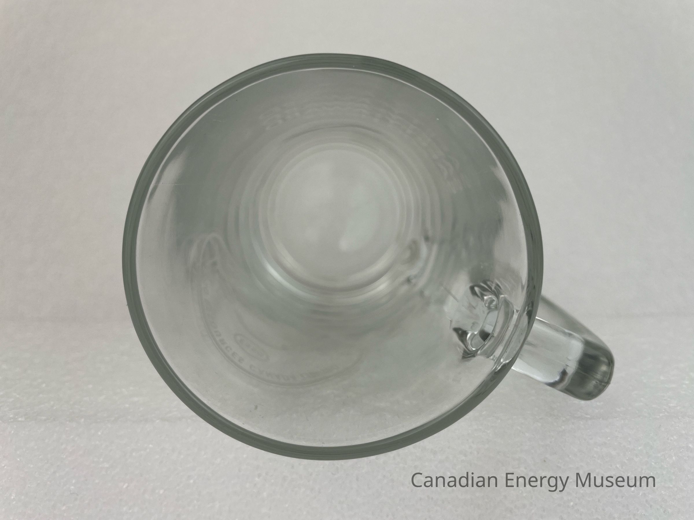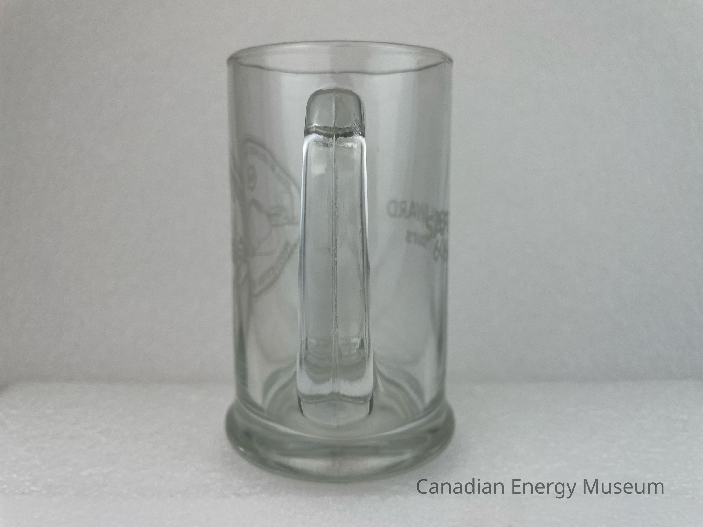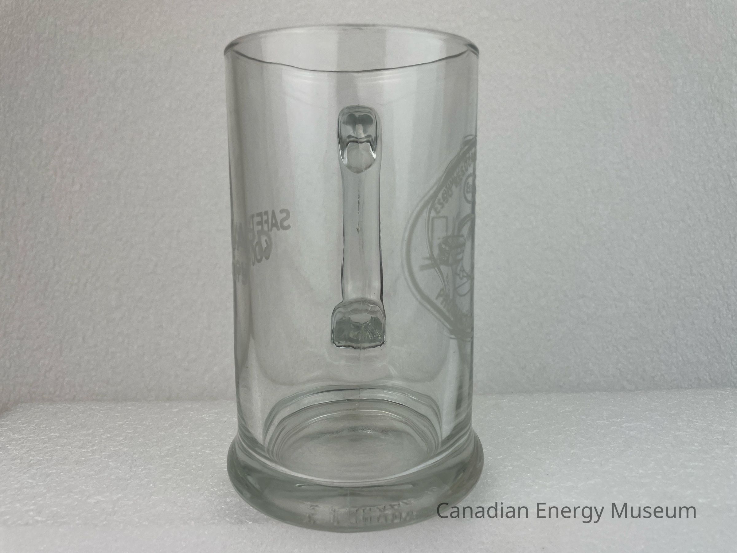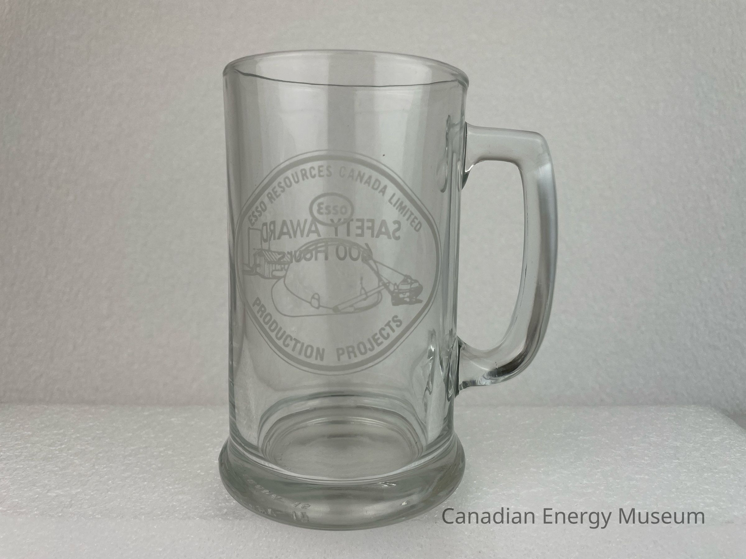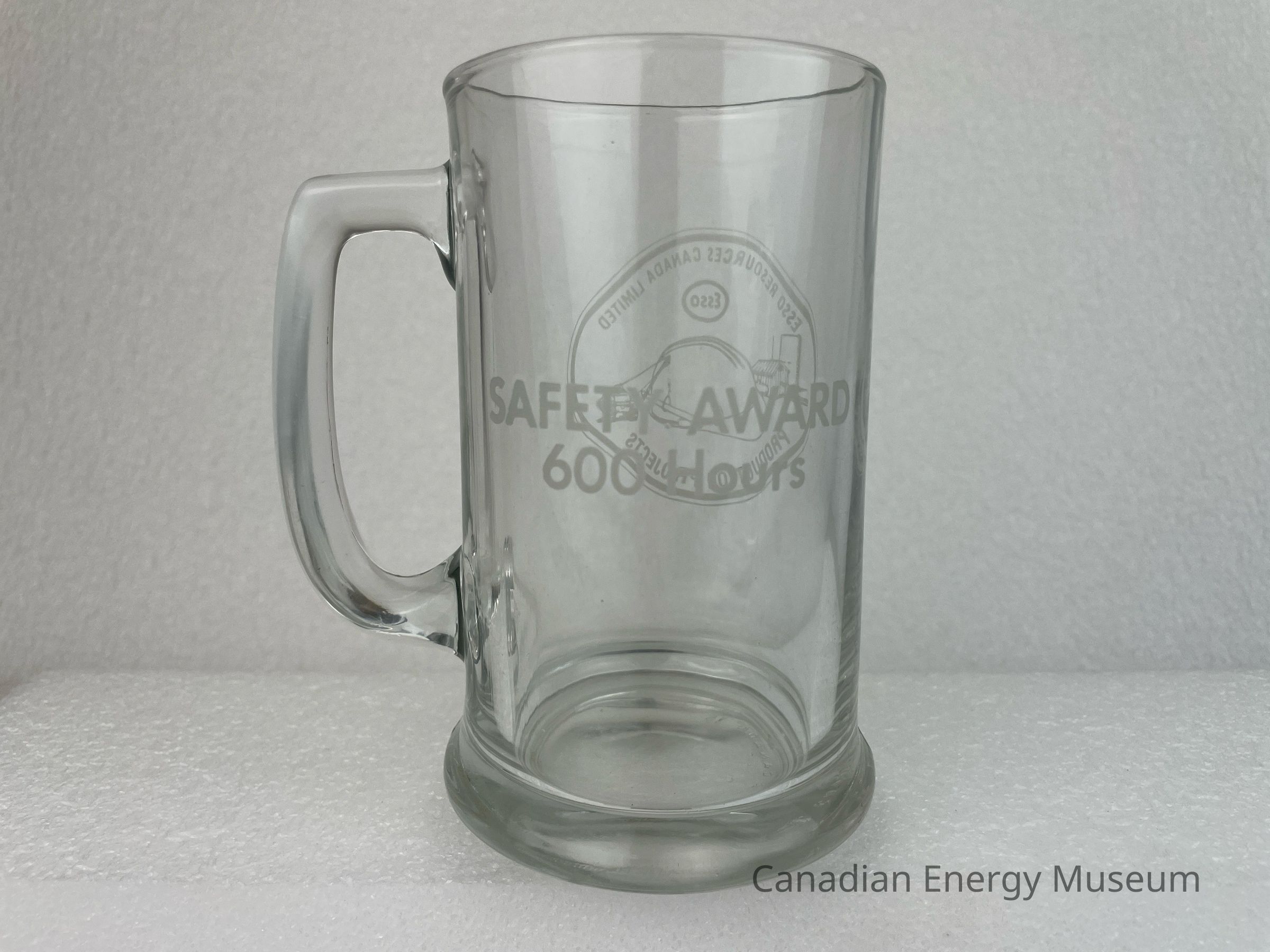 A clear glass tankard with a handle branded to Esso Resources Canada Limited. The front of the glass features a matte oval shape with an illustration of a large hard hat with a smaller illustration of machinery carrying a tree log. Behind the hard hat is a small building, and above the hard hat is an Esso logo. The top and bottom interior of the oval displays matte text reading, "ESSO RESOURCES CANADA LIMITED / PRODUCTION PROJECTS". The back of the tankard features large text reading, "SAFETY AWARD 600 Hours". The bottom of the tankard slants outwards and rests on a smaller base. The bottom of the base has raised text reading, "CANADA 15".Collection