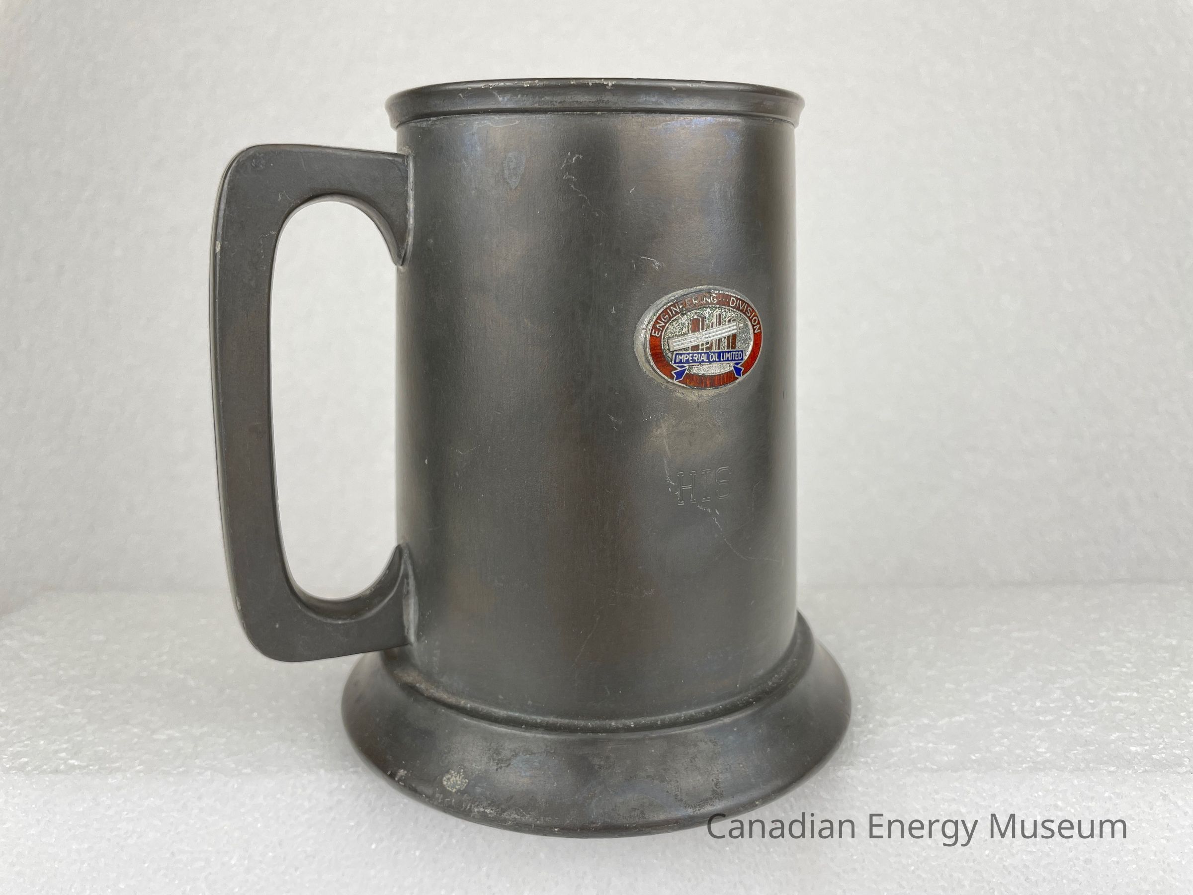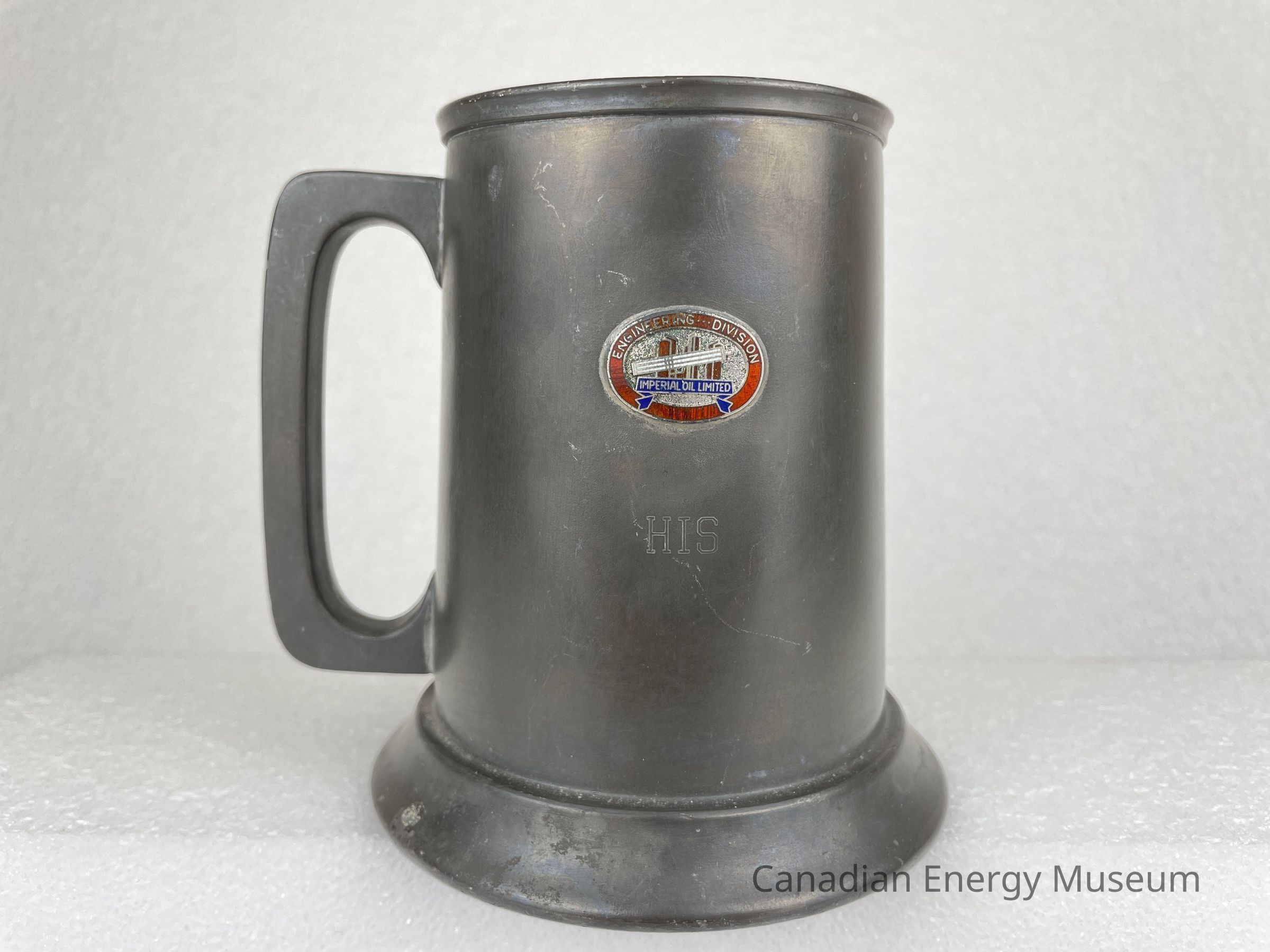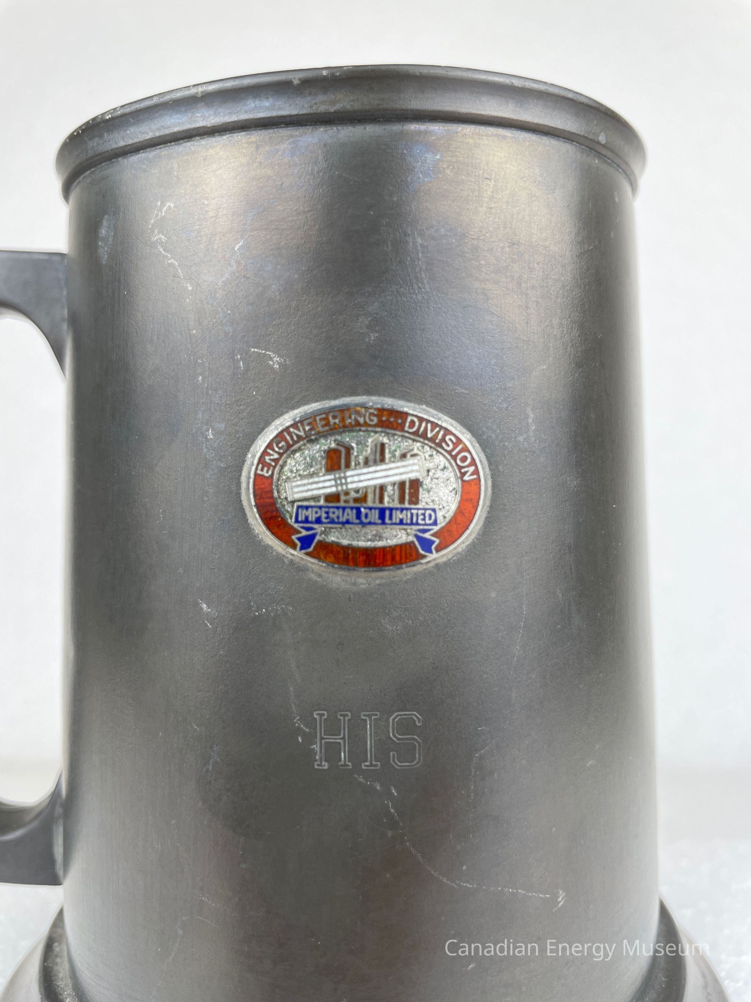 Pewter beer tankard with a rounded-square handle and glass bottom. The front of the tankard features a metal oval, which appears to have been welded on. The metal piece is decorated with red and white rectangle shapes in the centre with a blue ribbon underneath consisting of the text, "IMPERIAL OIL LIMITED". The border of the metal piece is red with text at the top reading, "ENGINEERING ... DIVISION". Below the metal piece is etching of text reading, "HIS". The base of the tankard juts outwards and the bottom rim of the pewter displays etched text reading, "Marlboro PLATE CANADA PEWTER".Collection