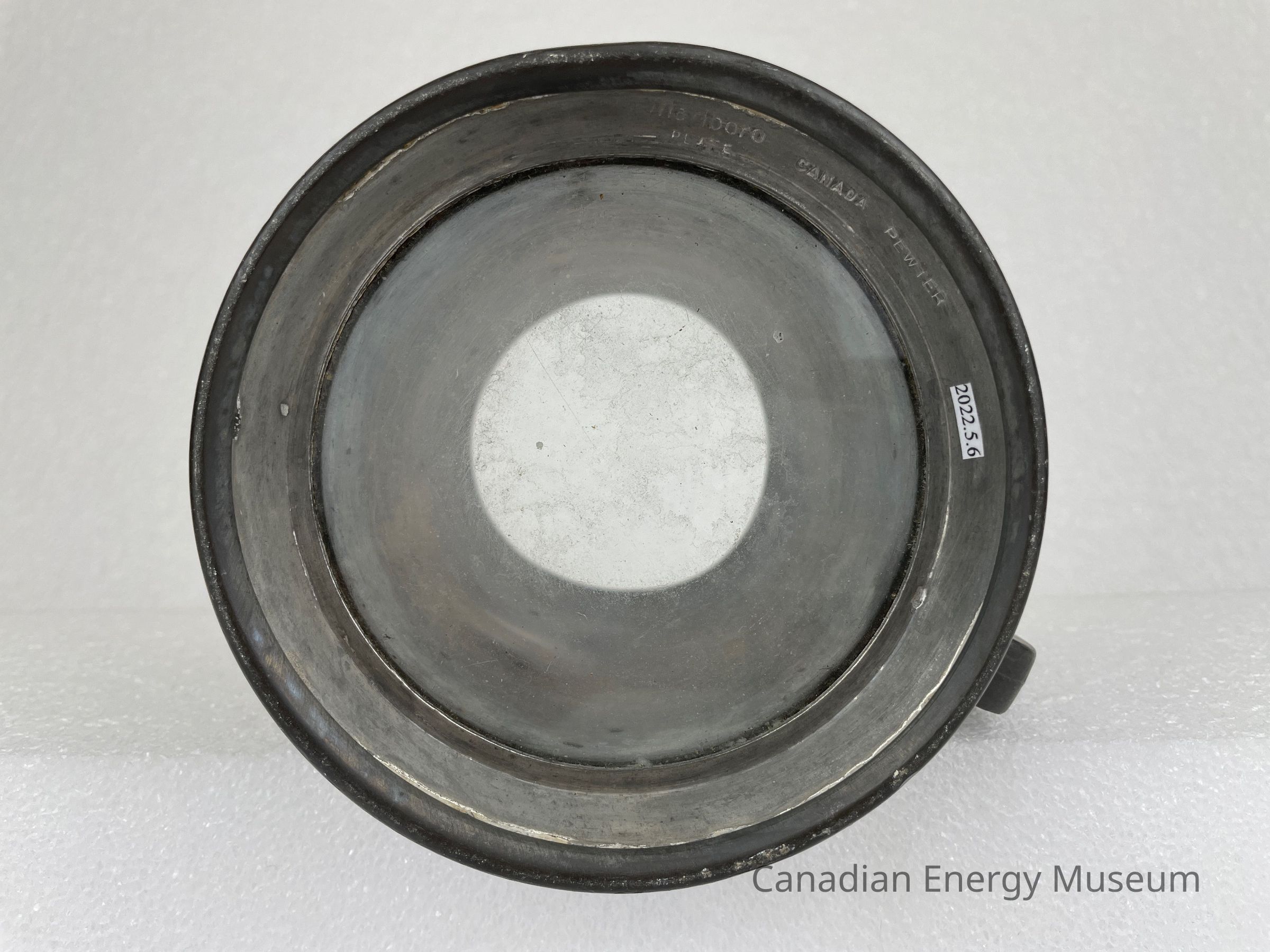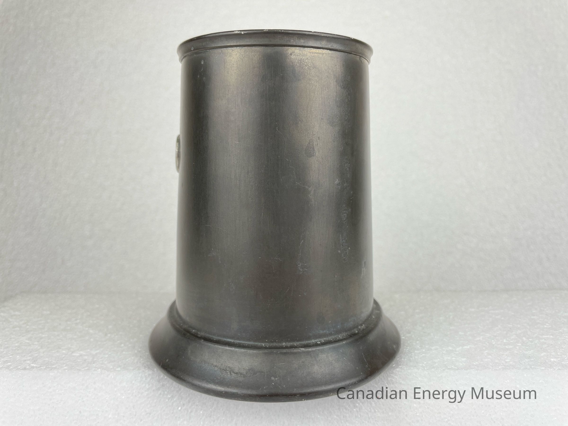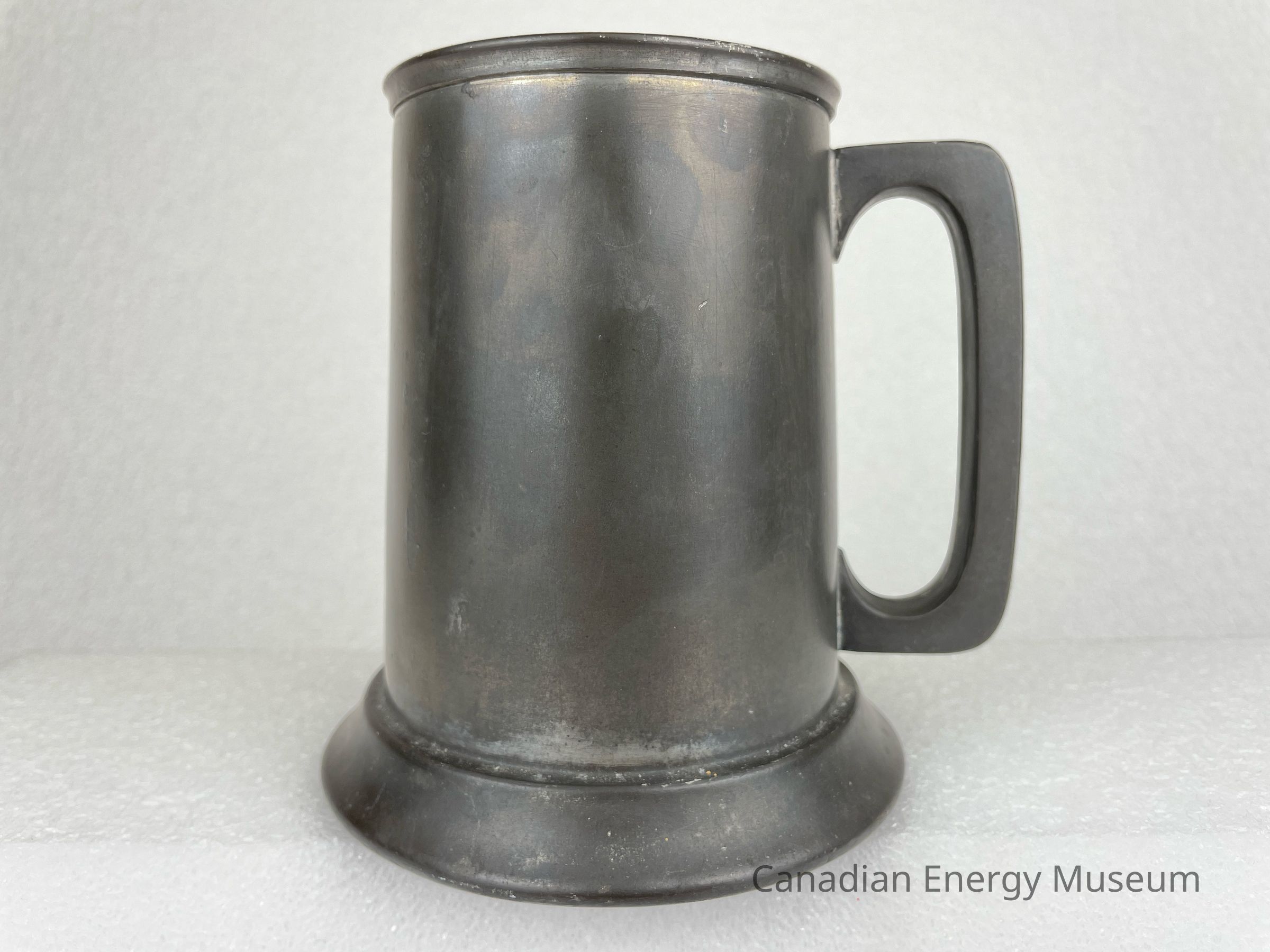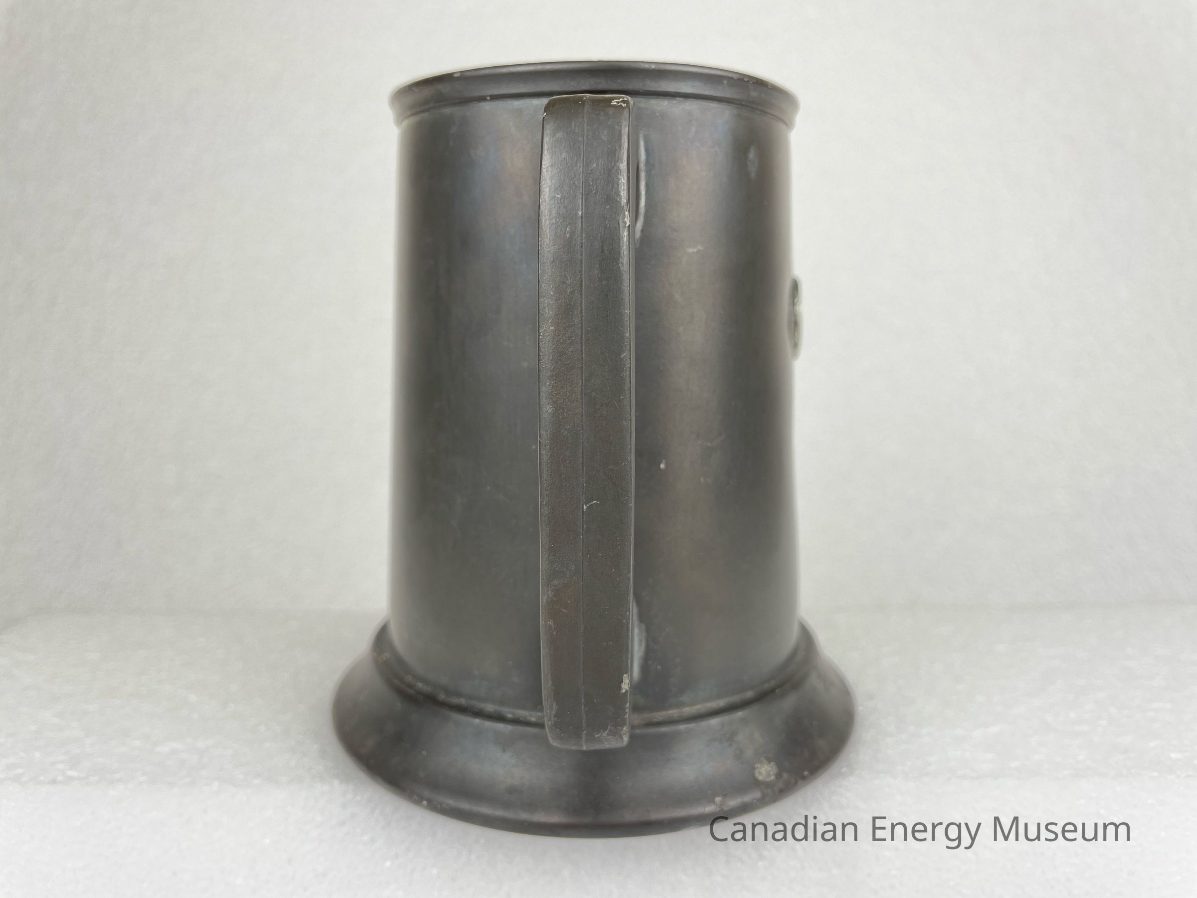 Pewter beer tankard with a rounded-square handle and glass bottom. The front of the tankard features a metal oval, which appears to have been welded on. The metal piece is decorated with red and white rectangle shapes in the centre with a blue ribbon underneath consisting of the text, "IMPERIAL OIL LIMITED". The border of the metal piece is red with text at the top reading, "ENGINEERING ... DIVISION". Below the metal piece is etching of text reading, "HIS". The base of the tankard juts outwards and the bottom rim of the pewter displays etched text reading, "Marlboro PLATE CANADA PEWTER".Collection
