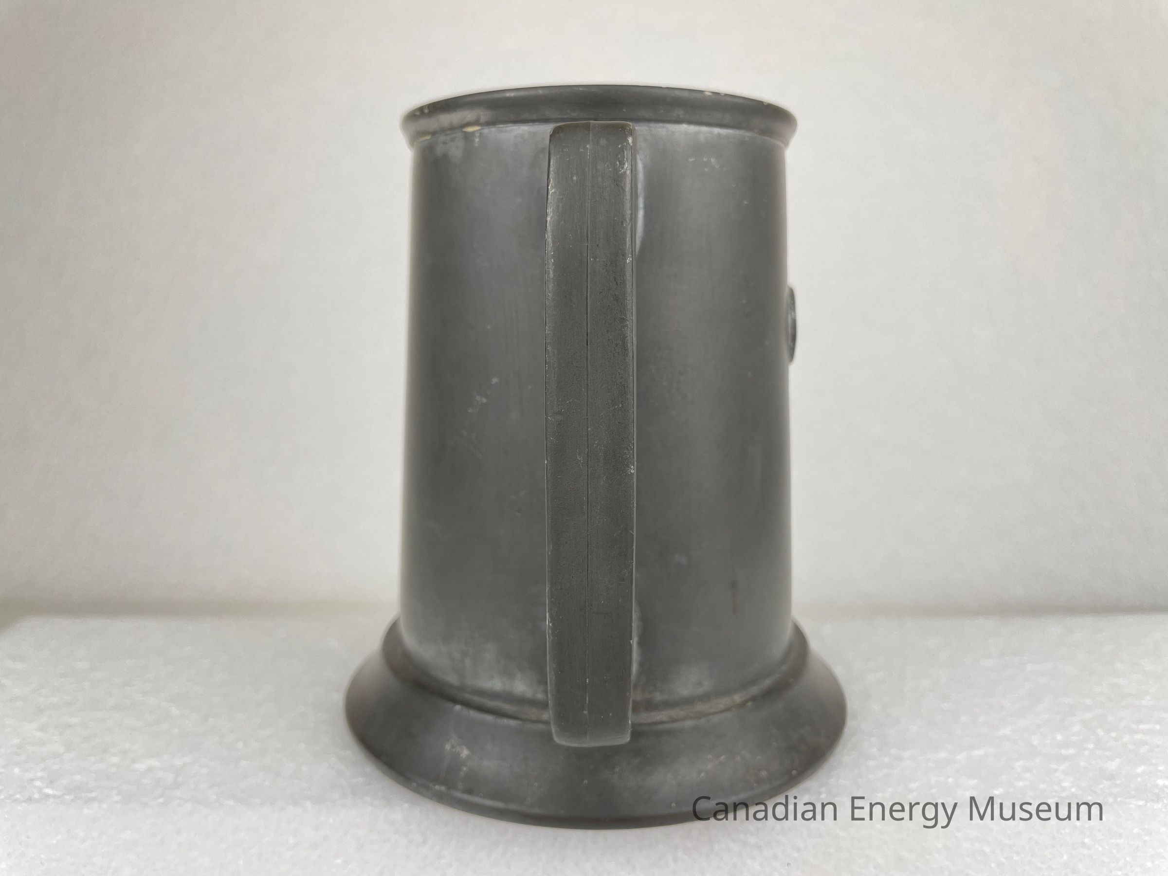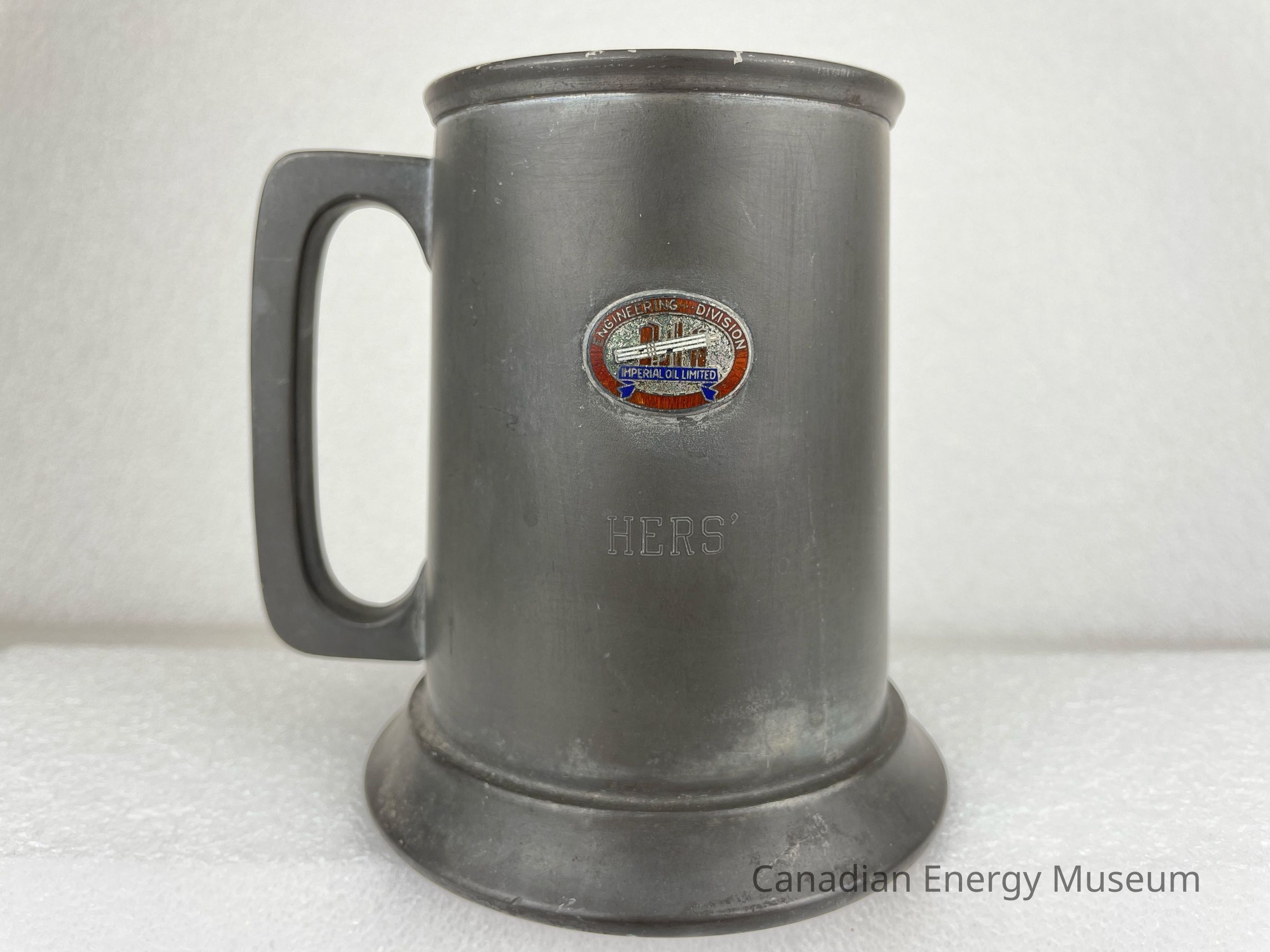Pewter beer tankard with a rounded-square handle and glass bottom. The front of the tankard features a metal oval, which appears to have been welded on. The metal piece is decorated with red and white rectangular shapes in the centre with a blue ribbon underneath consisting of the text, "IMPERIAL OIL LIMITED". The border of the metal piece is red with text at the top reading, "ENGINEERING ... DIVISION". Below the metal piece is an etching of text reading, "HERS'". The base of the tankard juts outwards, and the bottom rim of the pewter displays etched text reading, "Marlboro PLATE CANADA PEWTER".Collection