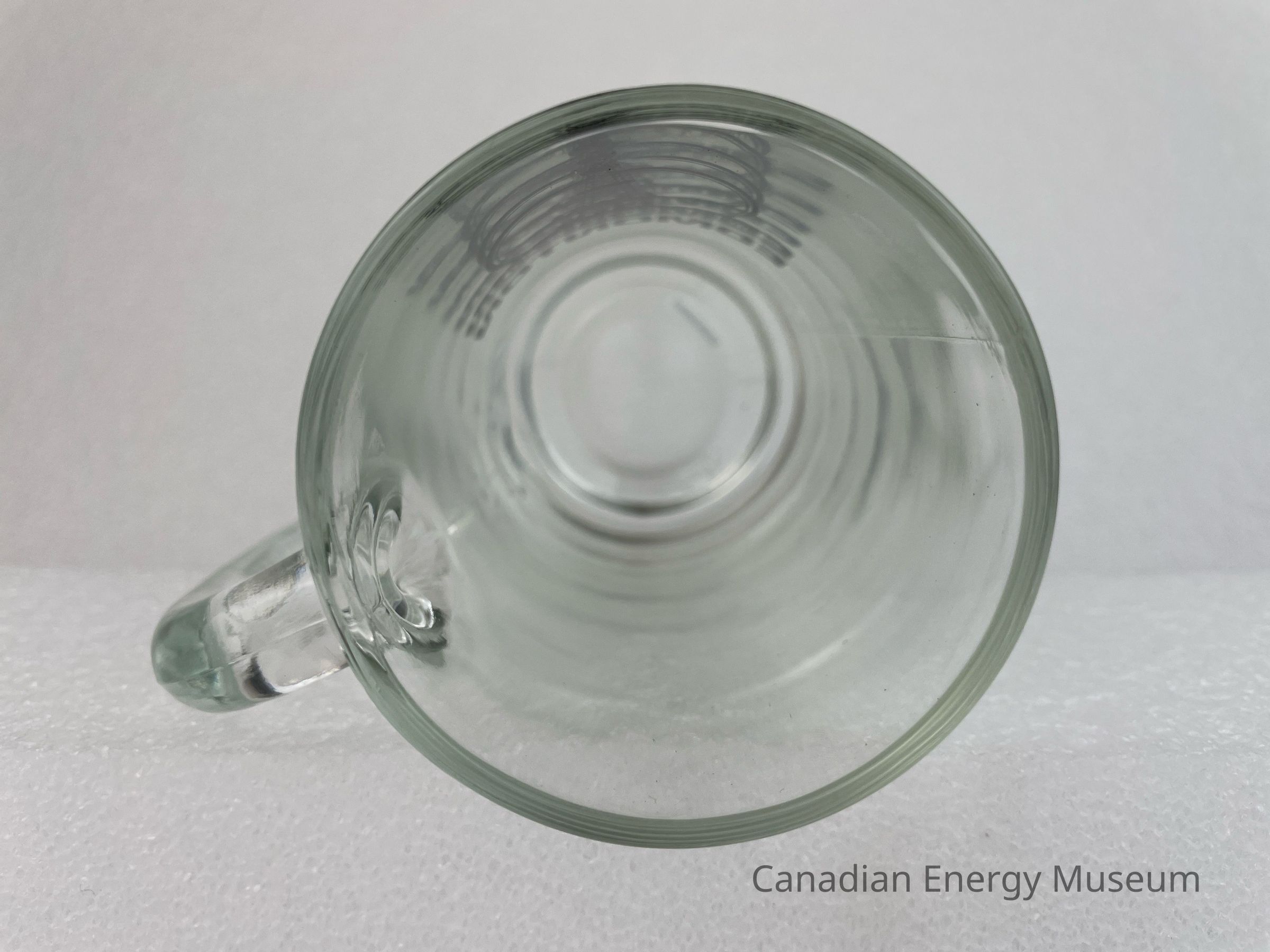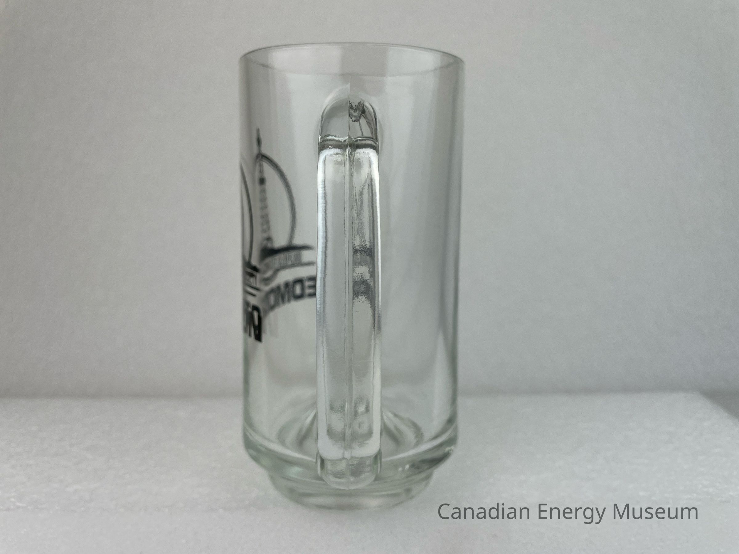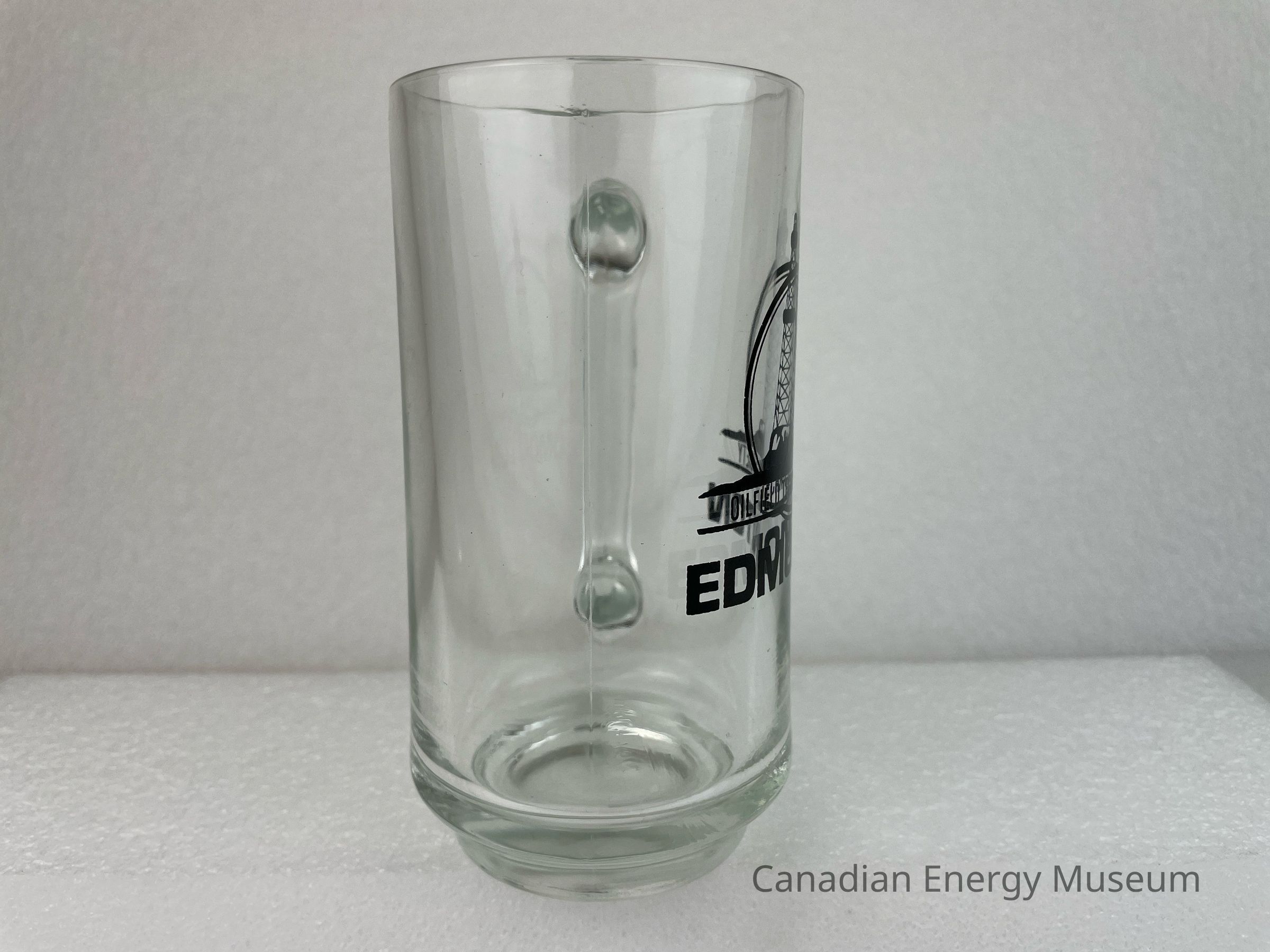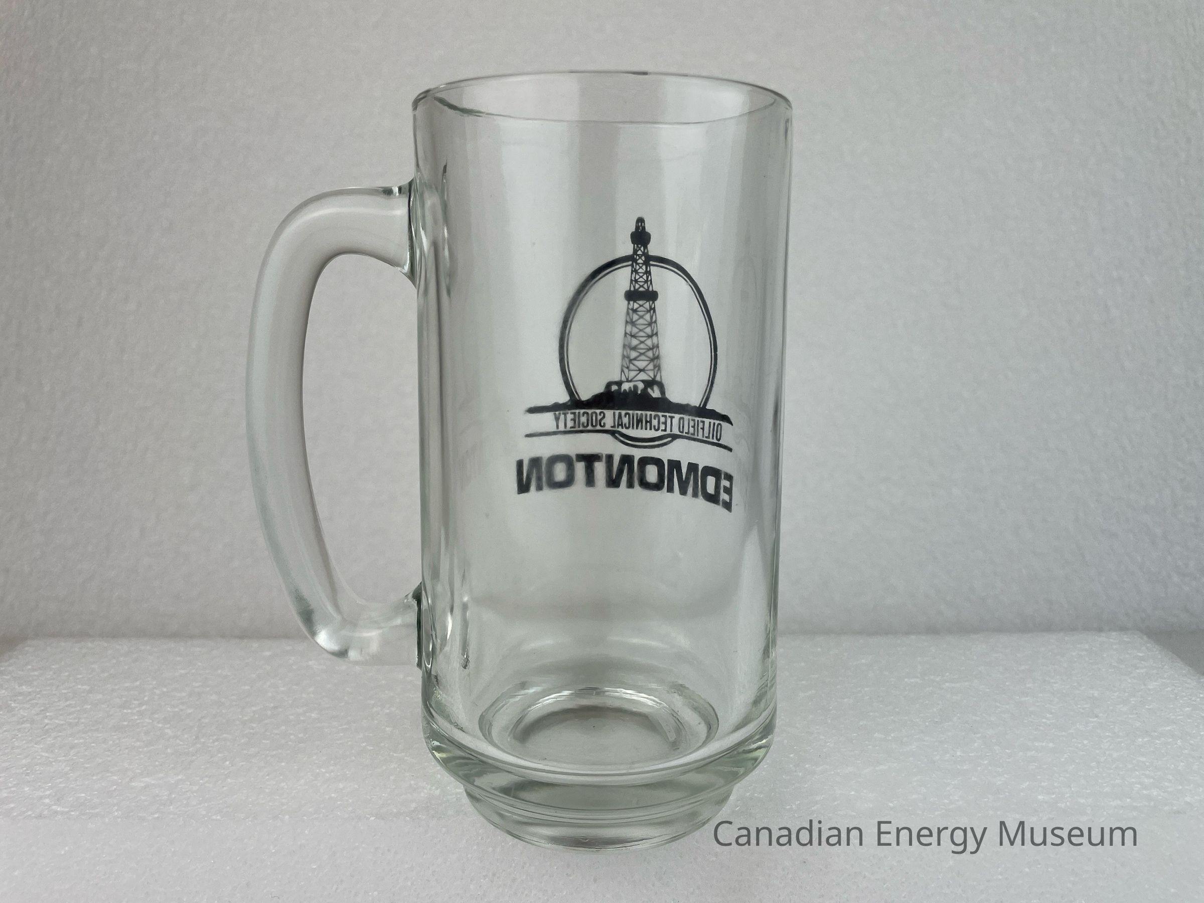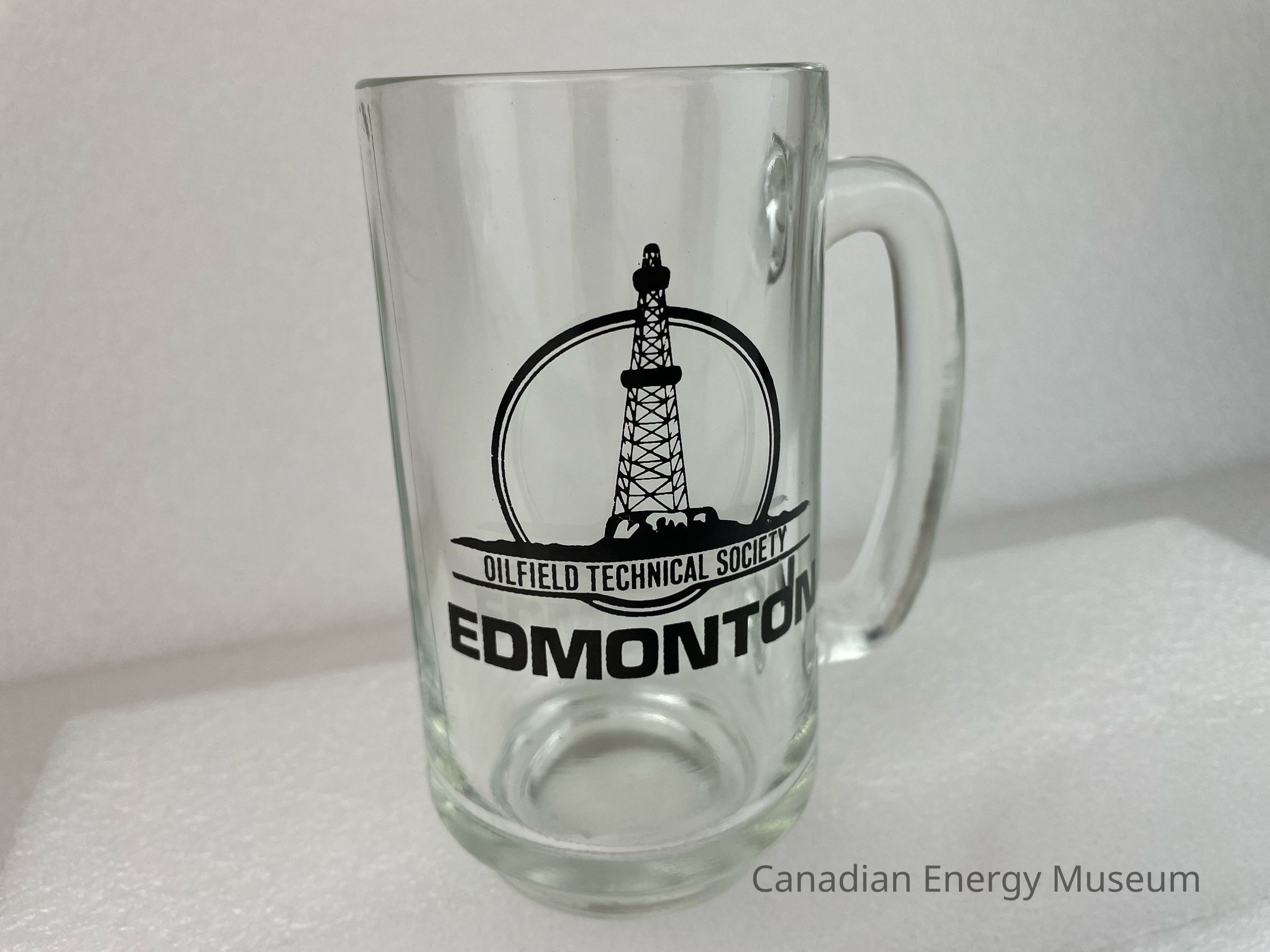 A clear glass tankard with a handle branded to the Oilfield Technical Society. The tankard features a black logo of a circle with another circle inside and an oil derrick at the centre. The oil derrick sits on a line of earth with text underneath reading, "OILFIELD TECHNICAL SOCIETY" and is encase by another black line. Below the circle is large, bold text reading, "EDMONTON". The body of the glass rests on a smaller base.Collection