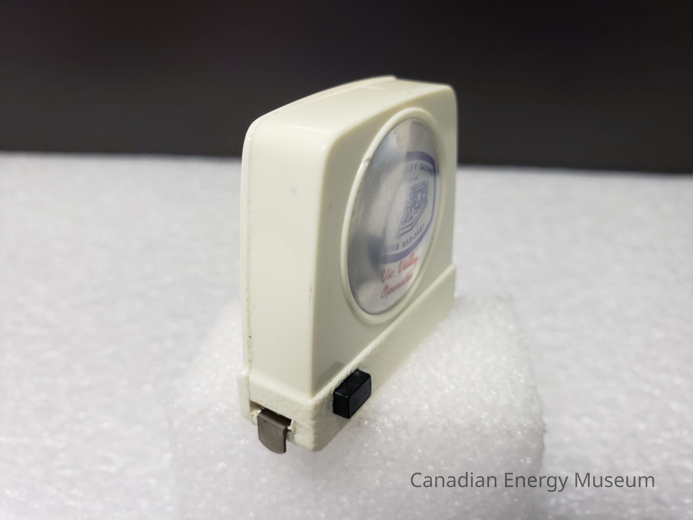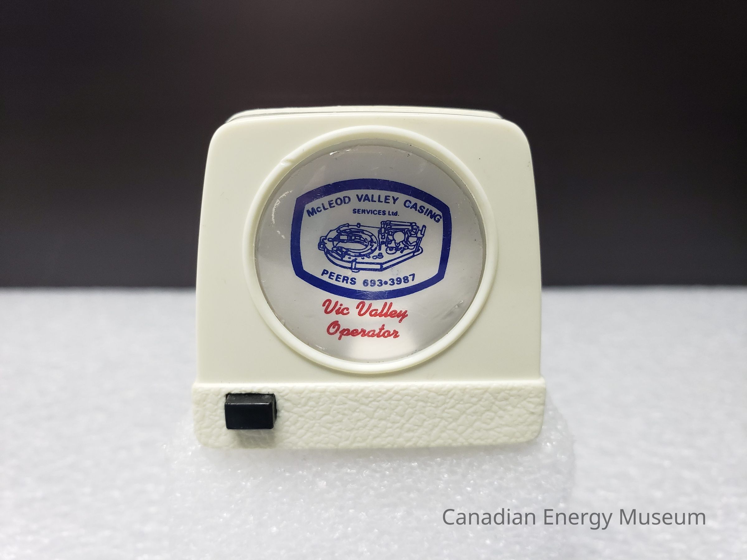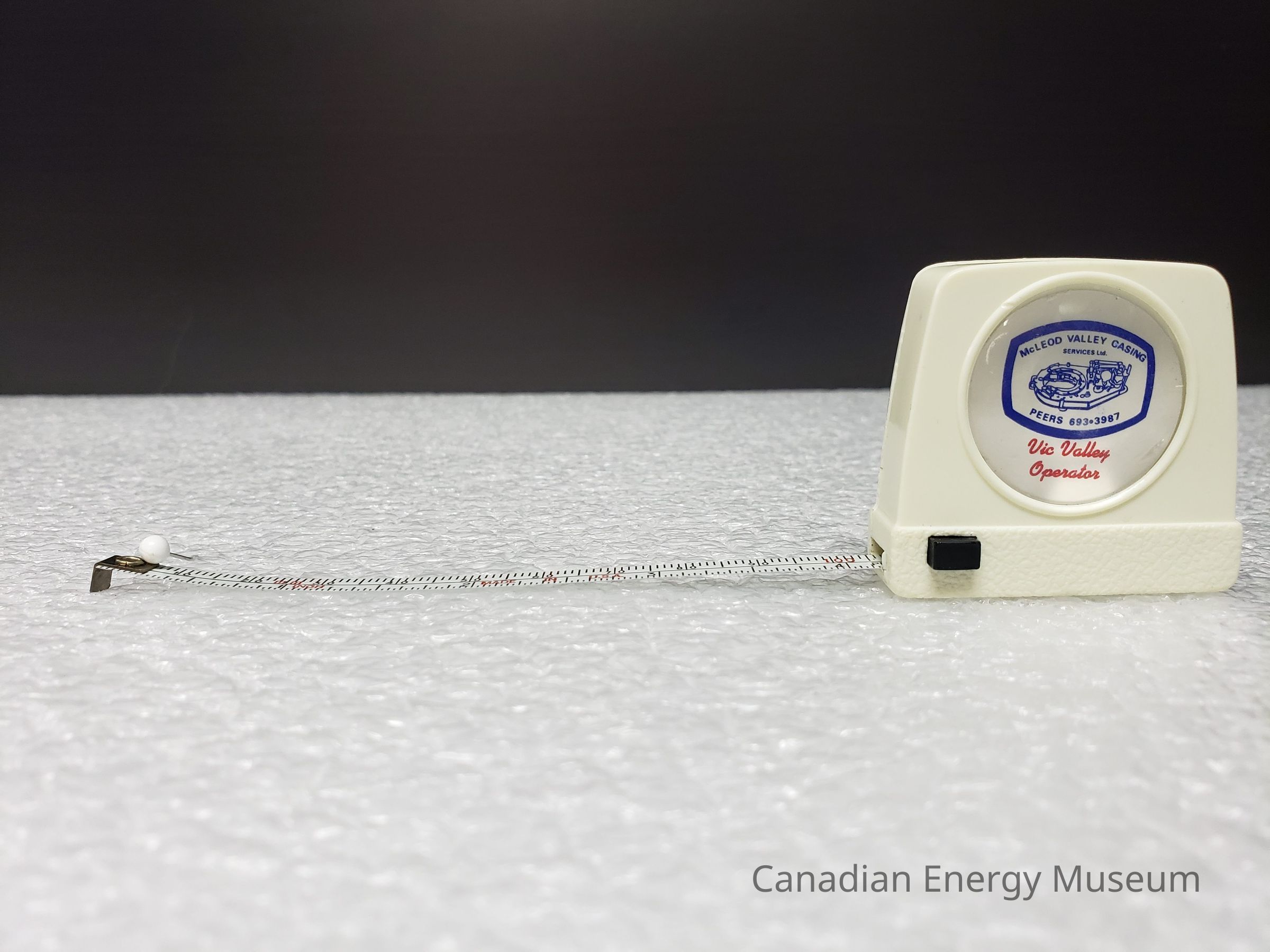 Old Description(Kelsey Steil, 5/24/2022): Small white tape measure. Advertisement in plastic window on one side. Blue illustration of power tongs and text: McLeod Valley Casing Services Ltd. Below in red text reads: Vic Valley Operators.Collection