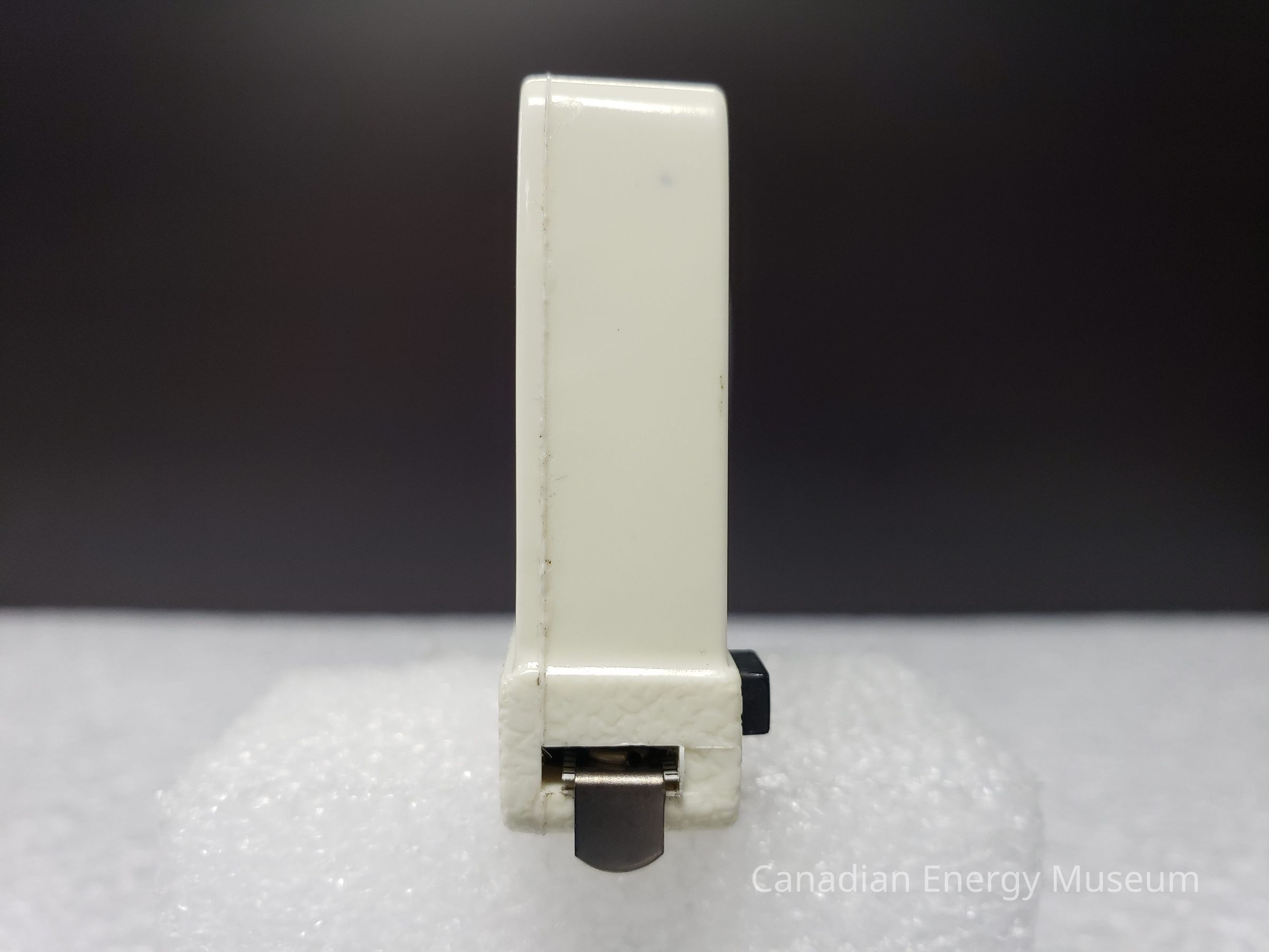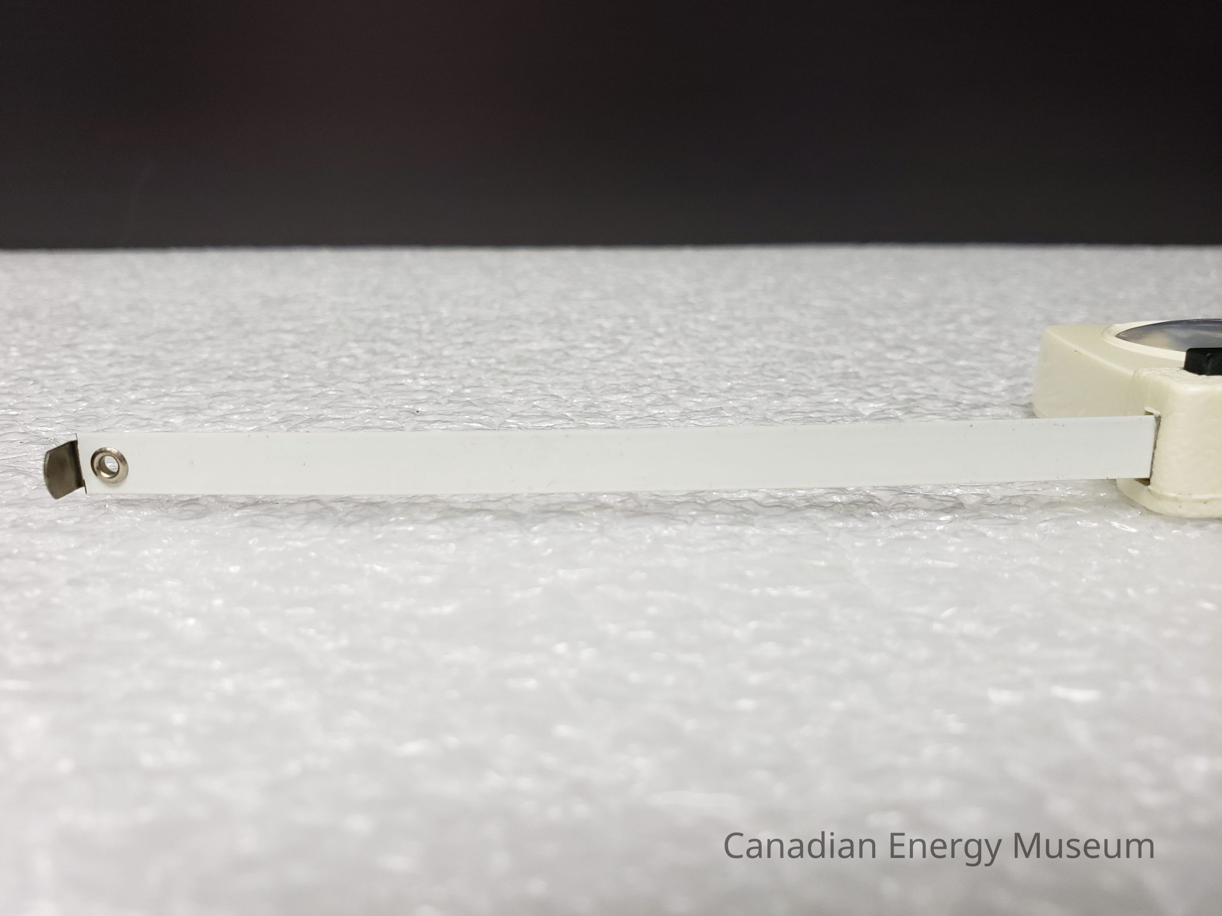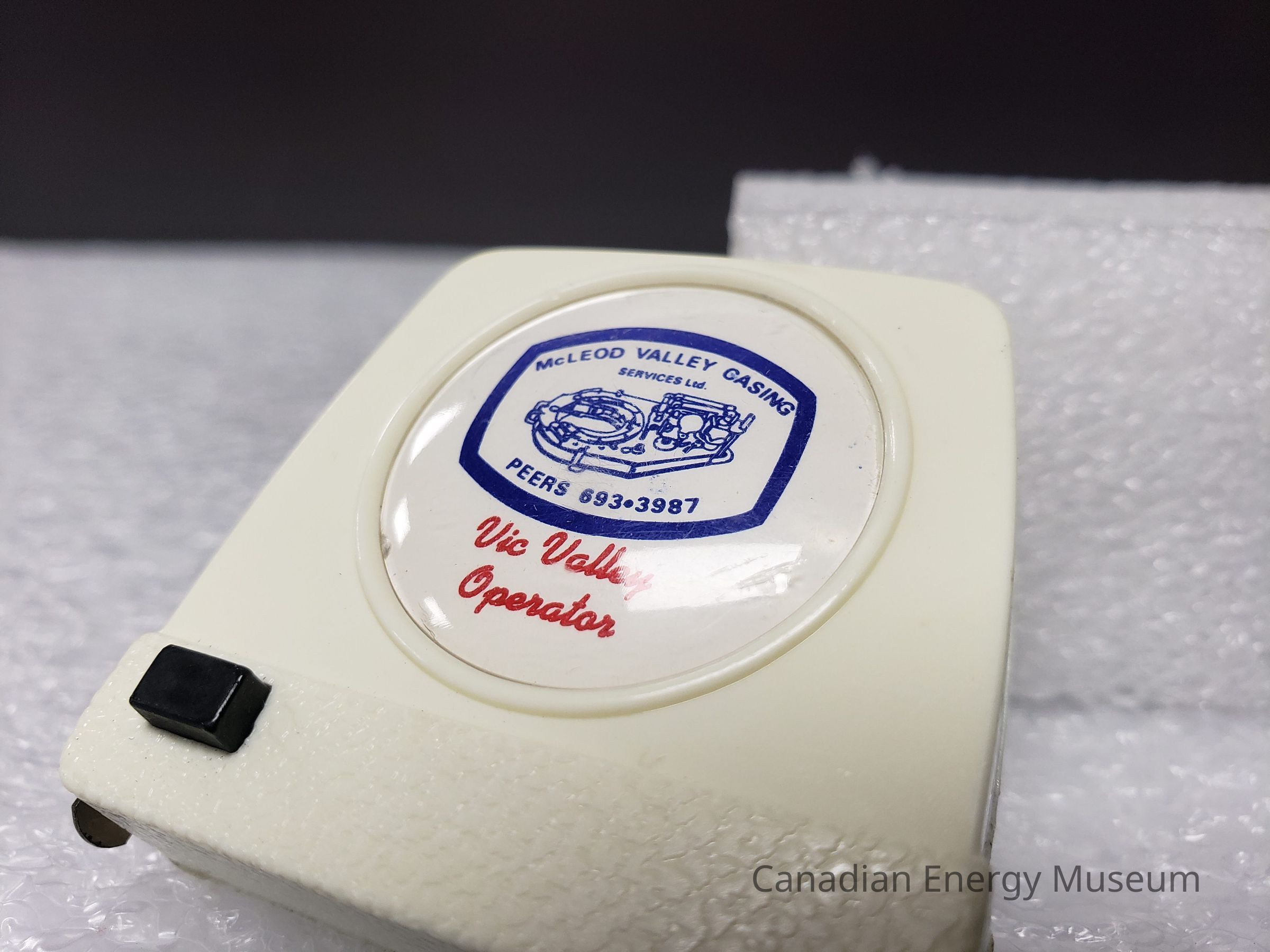 Old Description(Kelsey Steil, 5/24/2022): Small white tape measure. Advertisement in plastic window on one side. Blue illustration of power tongs and text: McLeod Valley Casing Services Ltd. Below in red text reads: Vic Valley Operators.Collection