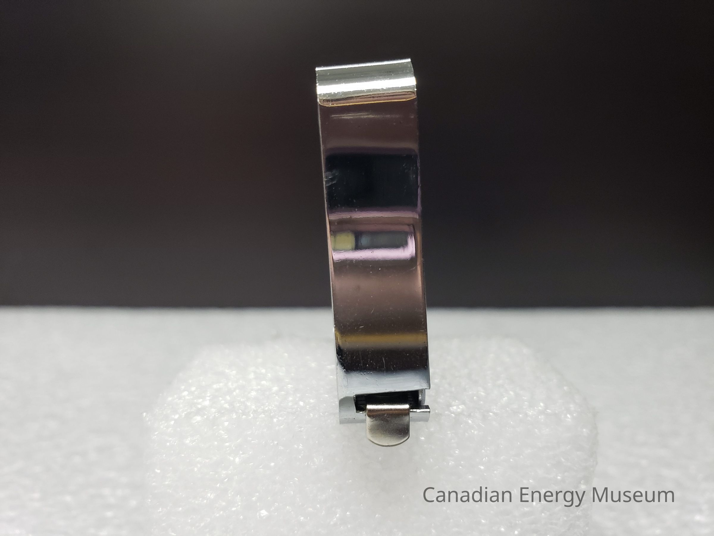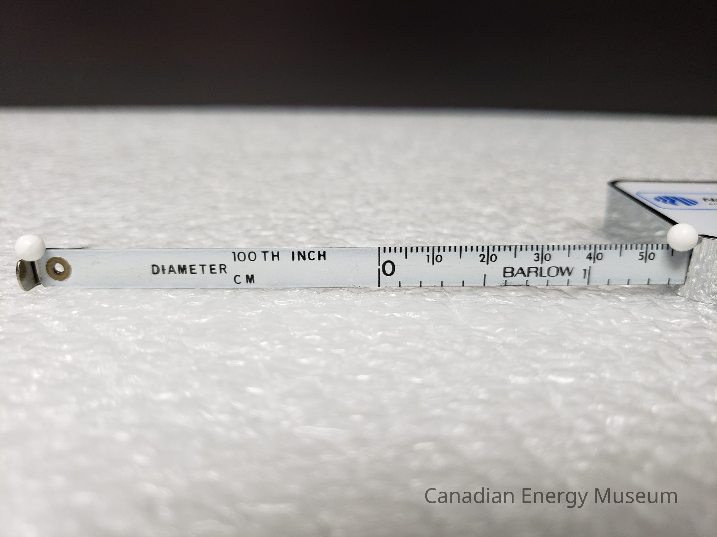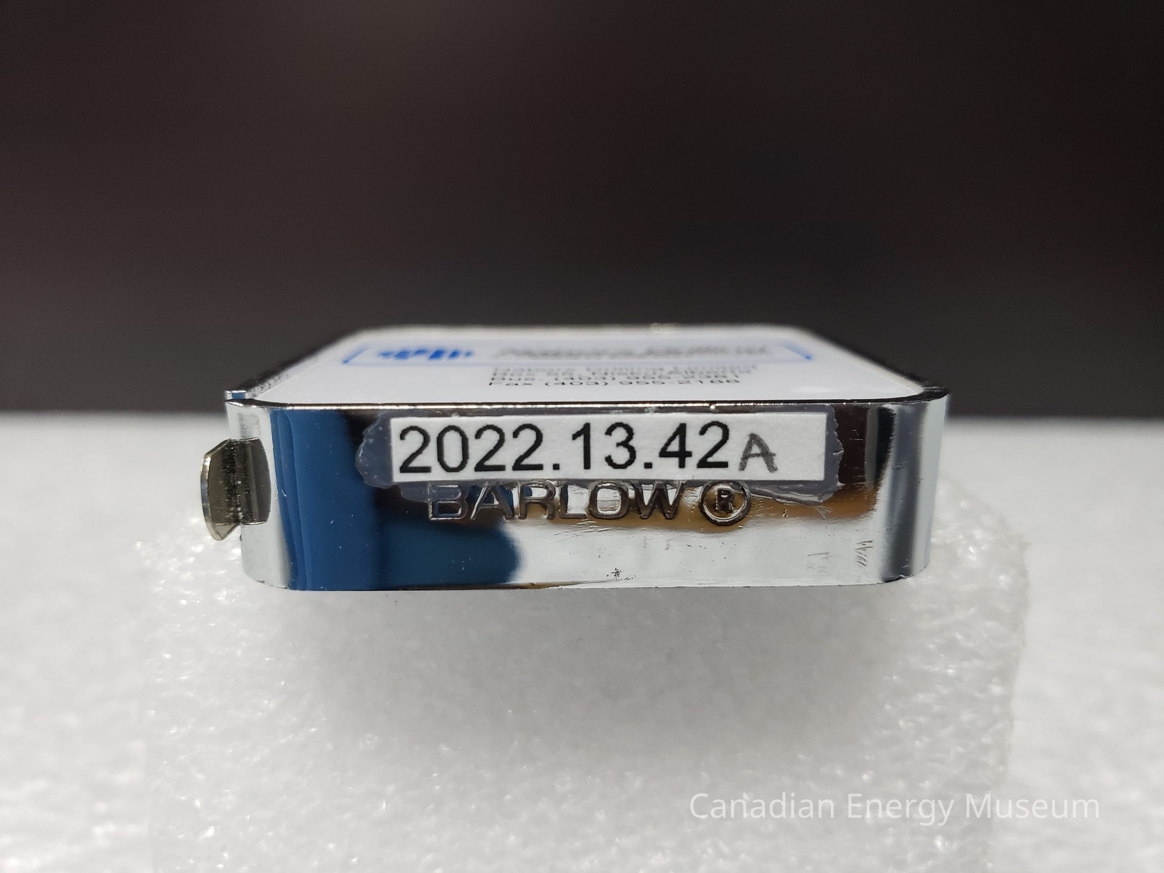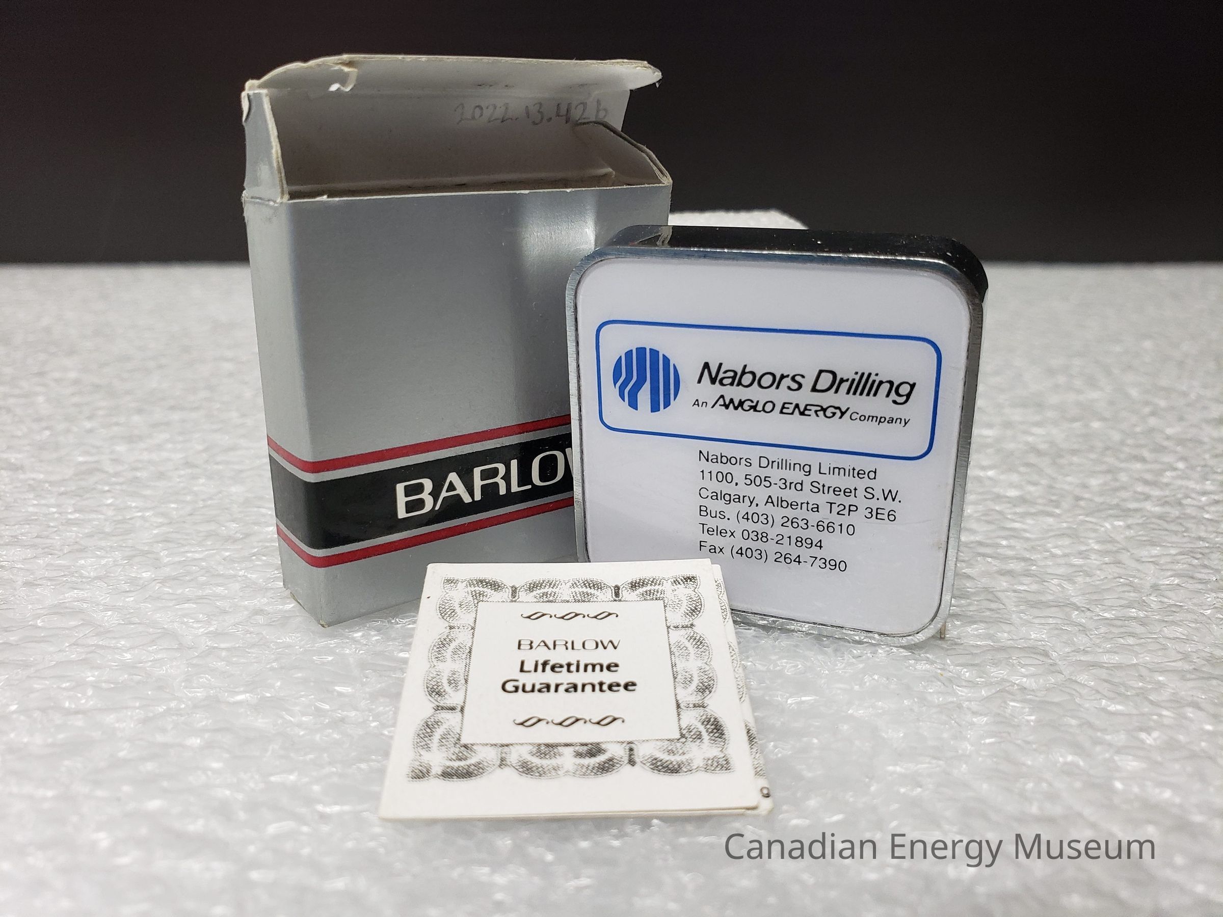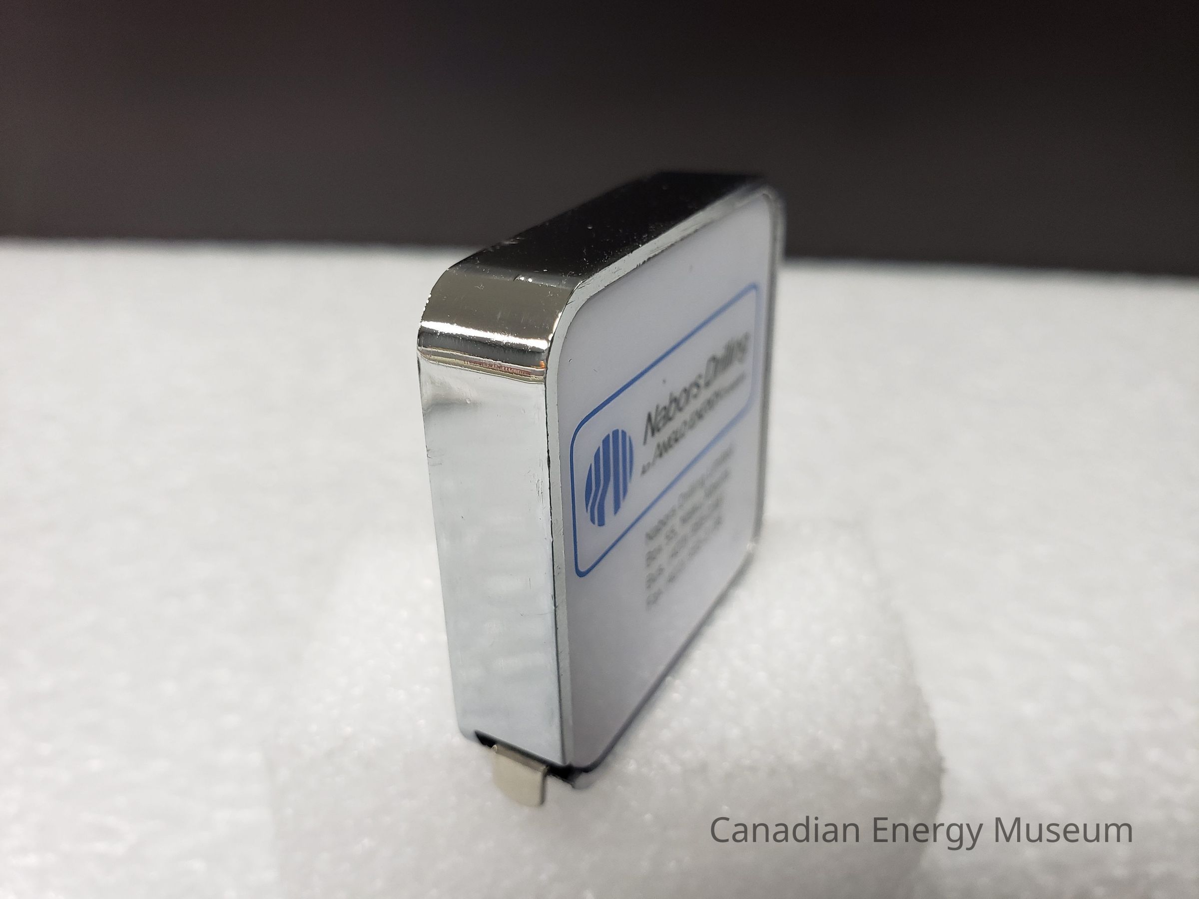 Old Description: (Kelsey Steil, 5/24/2022) Small tape measure (a) in original box (b) with lifetime warranty (c). Tape measure is silver with white advertisement on both sides for Nabors Drilling Limited. Box is gray with black and red horizontal stripes.Collection