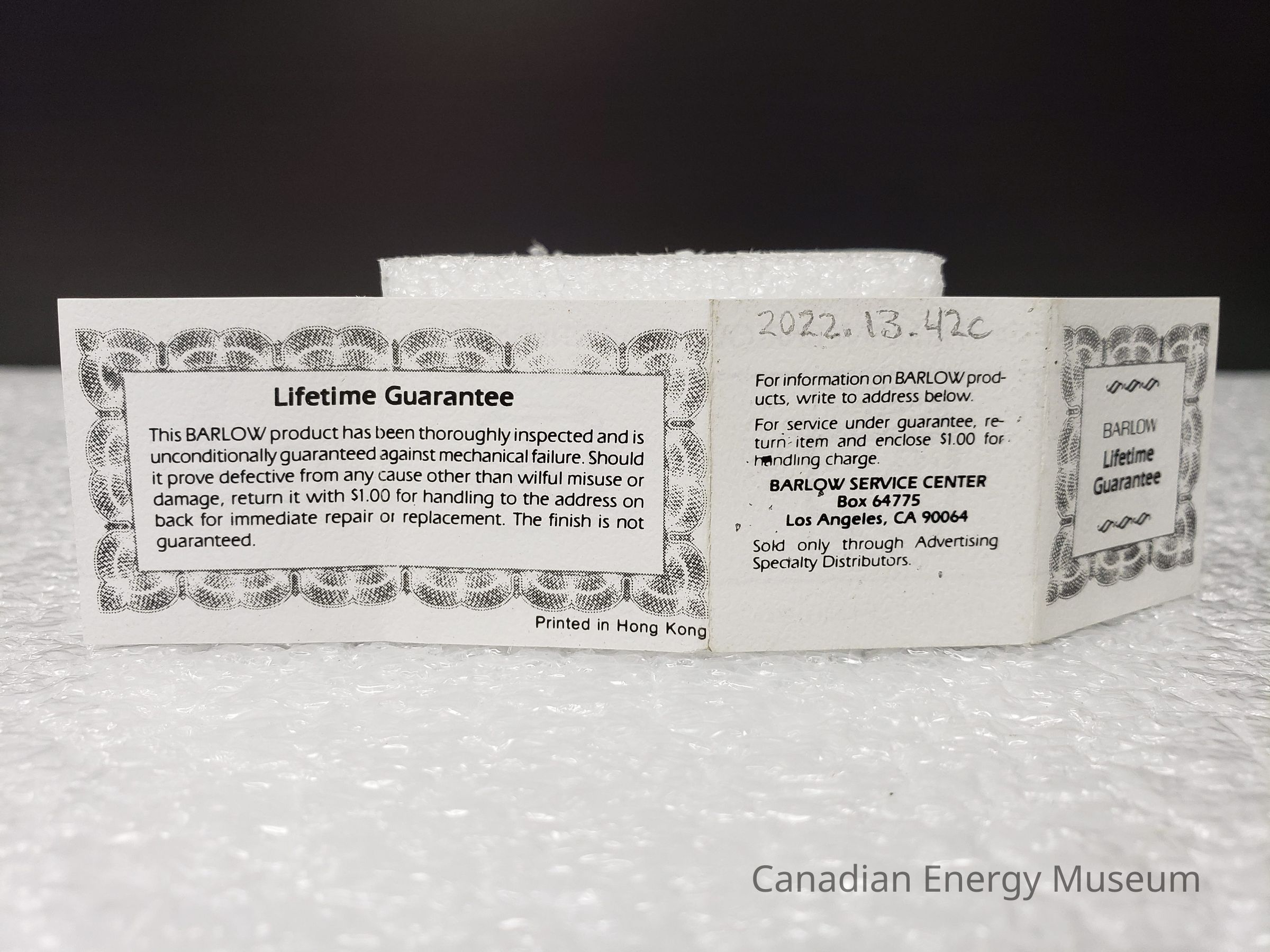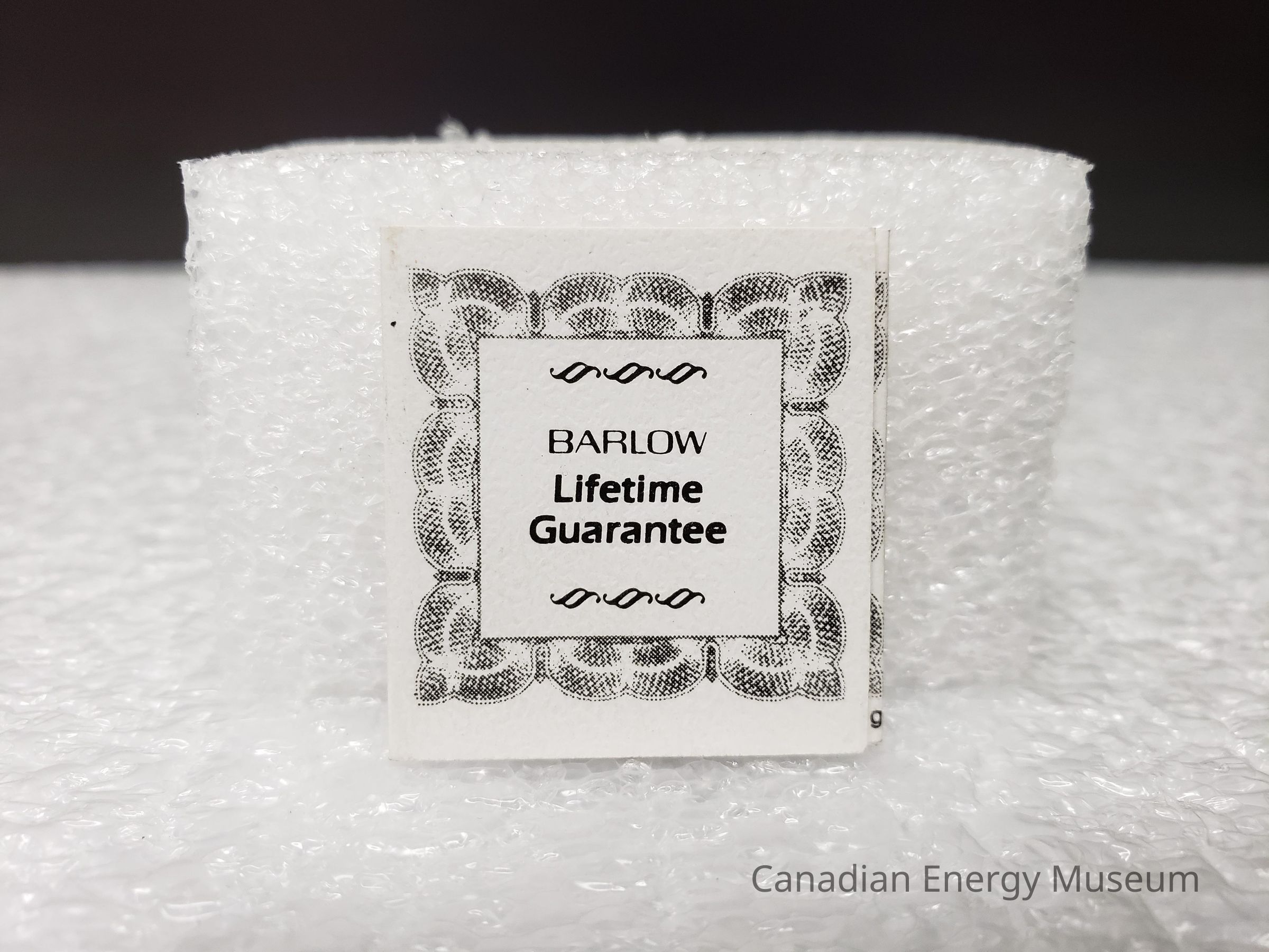 "This BARLOW product has been thoroughly inspected and is unconditionally against mechanical failure. Should it prove defective from any cause other than wilful misuse or guaranteed damage, return it with $2.00 for handling to the address on back for immediate repair or replacement. The finish is not guaranteed."