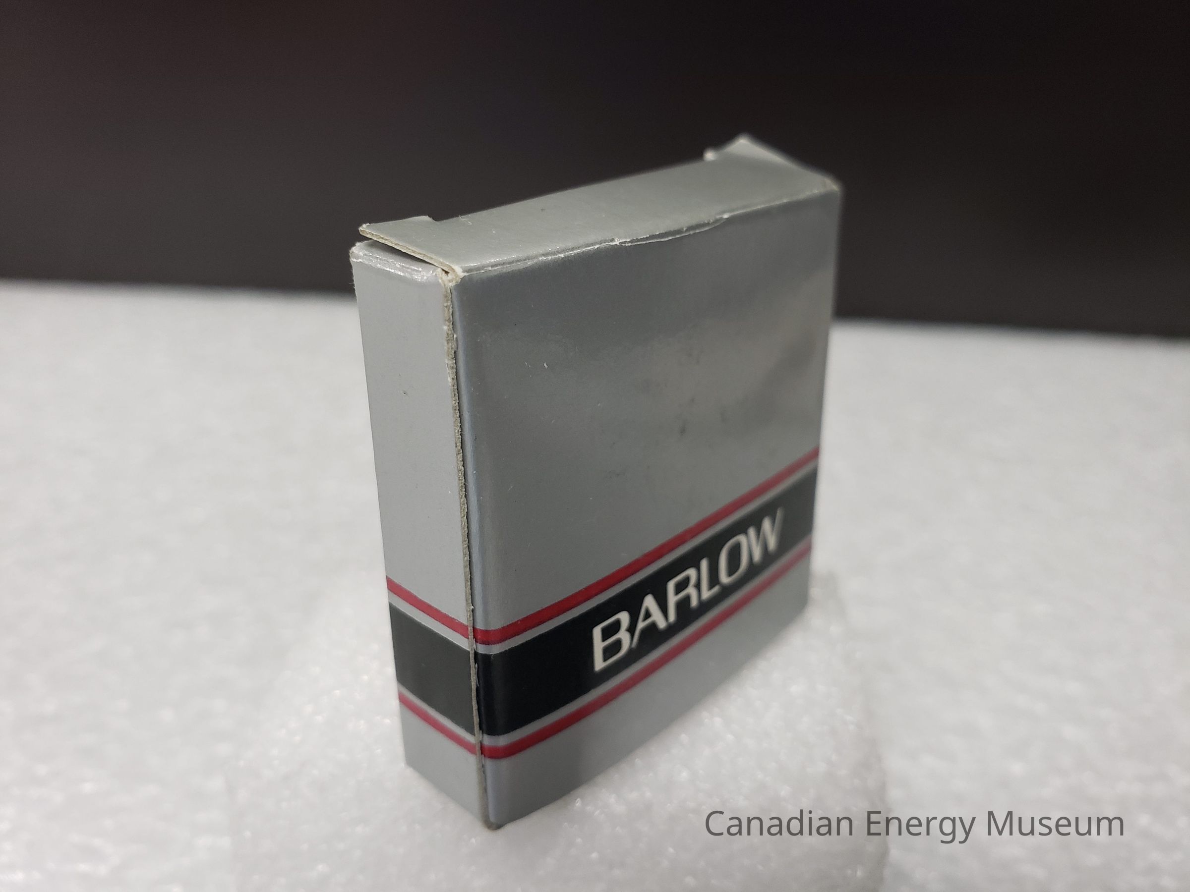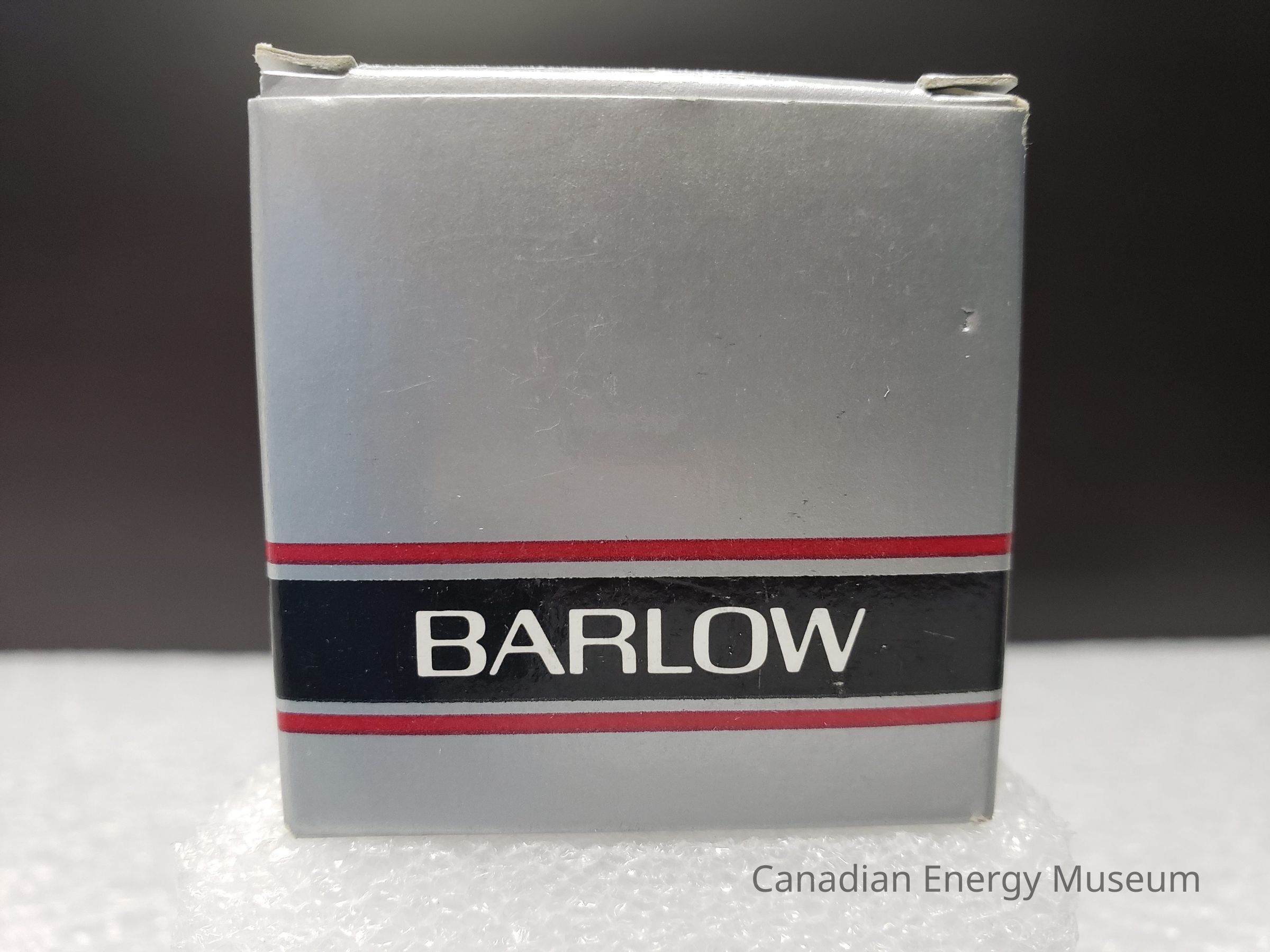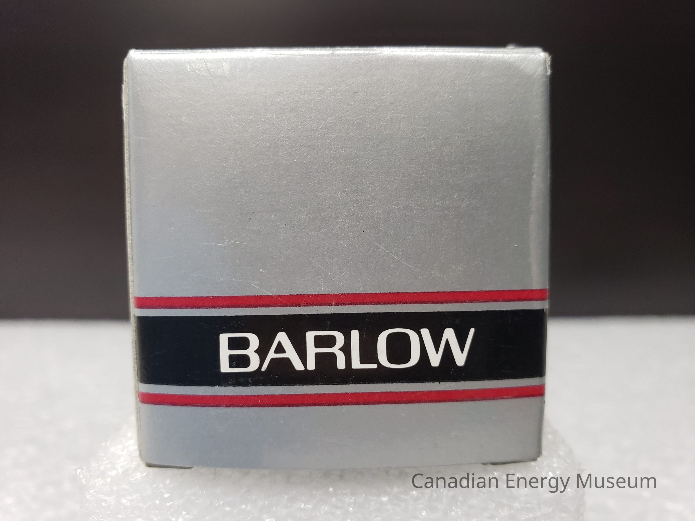Box: Box is original to the maker of the tape measure, branded to Barlow. Box is a thin cardboard and open on both sides to make flat. The box is a metallic dull silver as the main colour and has three stripes parallel to each other running the whole way round the box on the bottom half. The top strip is thin and red the black stripe is thick, roughly a 1 cm wide and the bottom is also a thin red stripe. All the stripes are separated by the same muted metallic silver. The text "BARLOW' is inside the black stripe on either square face, running the same directions as the stripes. Inside of the box is white.