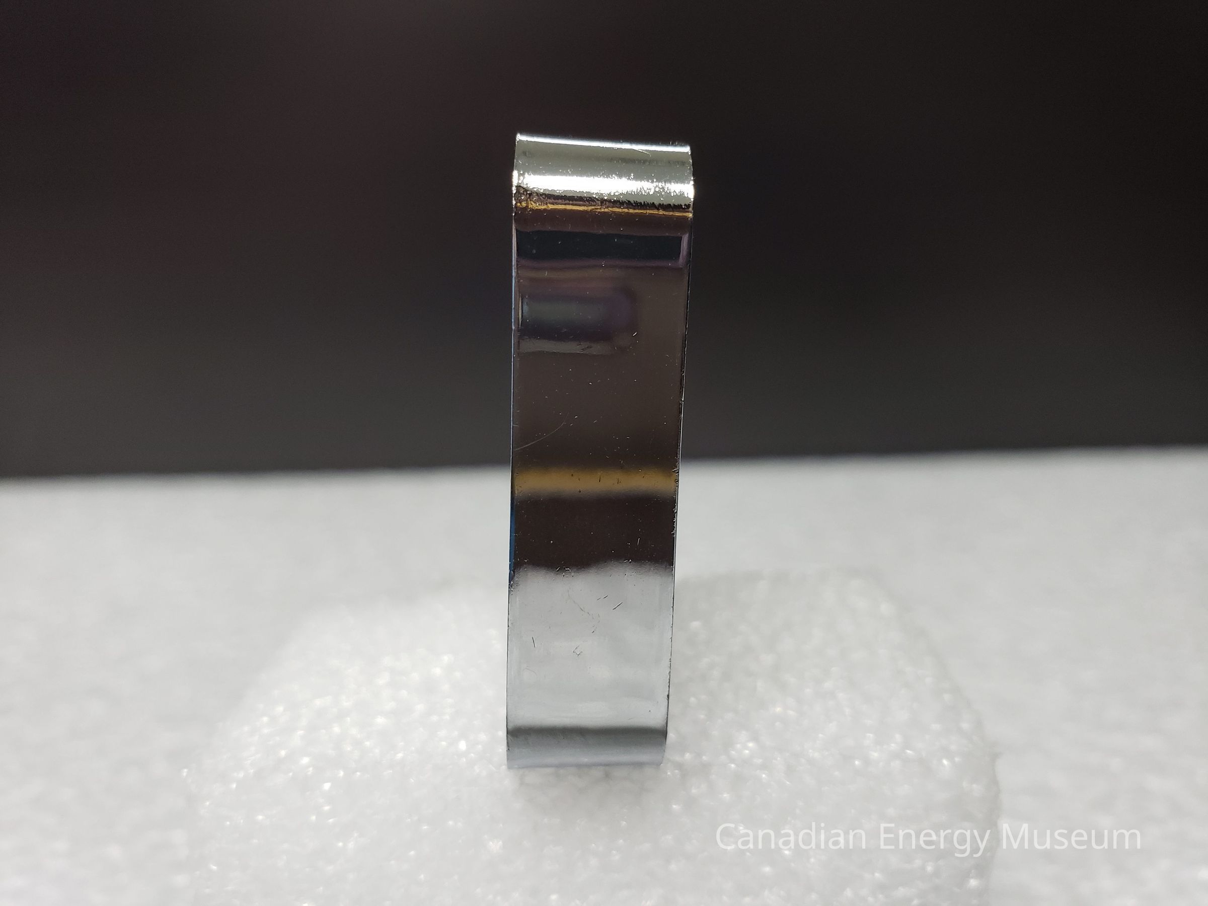 Tape Measure Body: A rectangular prism consisting of 4 flat rectangular sides that round off to connect and two rounded square faces. These faces are labelled as 1 and 2 in attached photos. The main body of the measure is an unknown metal that makes up the entirety of the main structure. The metal is flat and mirrored on the outer rectangle sides and appears to have a patterned texture on the square faces made to hold a sticker for the contracted company. The bordered edge of the square face is slightly raised to work in combination with the sticker for a flat surface. The inner portion of the square faces consist of a white enamel sticker placed inside the borders of the main face body. The sticker Consists of a blue bordered rounded rectangle contain the text "Nabors Drilling" in large italicized sans serif text. Just under in the rectangle is the italicized text "A NABORS INDUSTRIES Company". To the left of the text is a circular logo consisting of a blue circle cut in 6 sections with the left 3 section bent like pipes and the right 3 section staying straight.