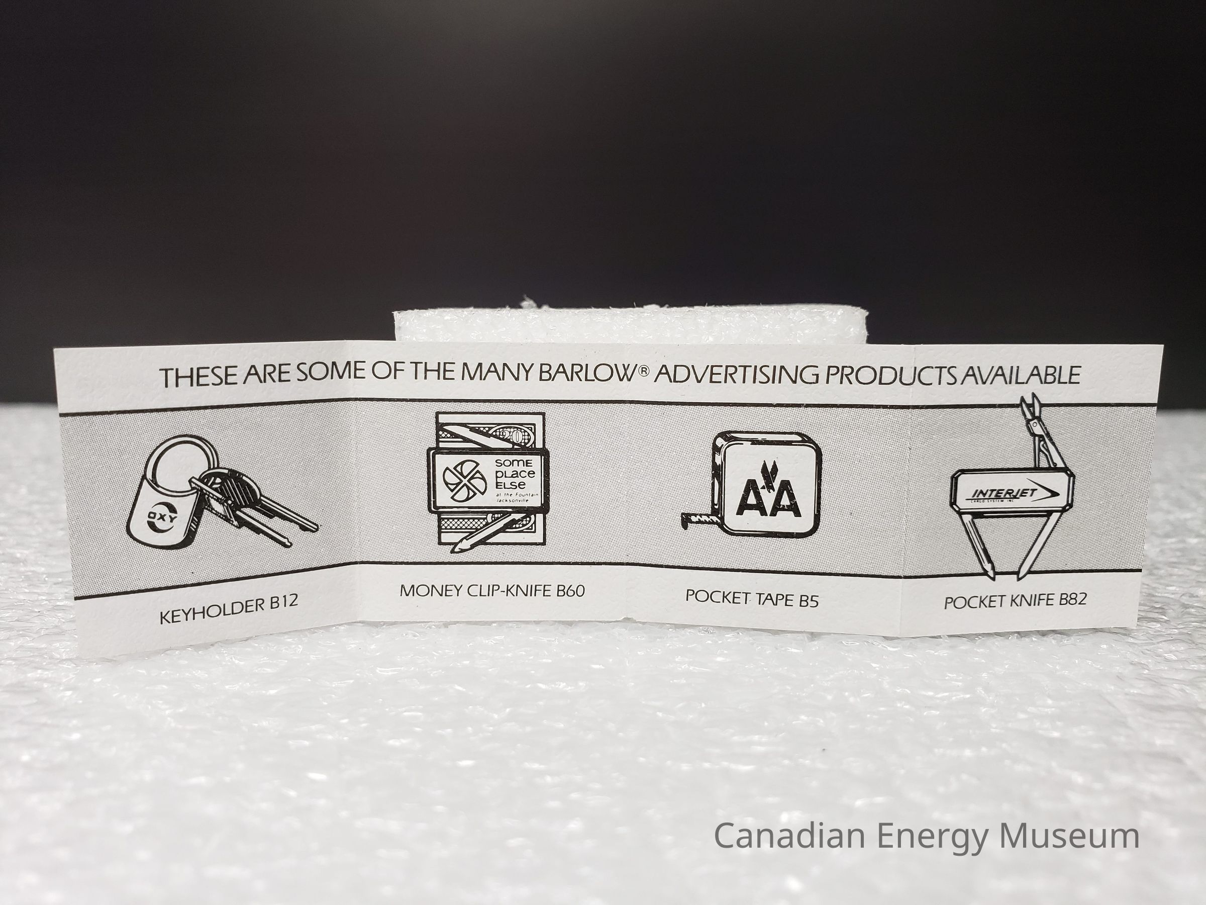 Side B consist of a advertisement of other possibilities for branded products made by Barlow. A gray rectangle runs the length of the paper showing that they make Key holders, Money CLIPS pocket takes and pocket knives.