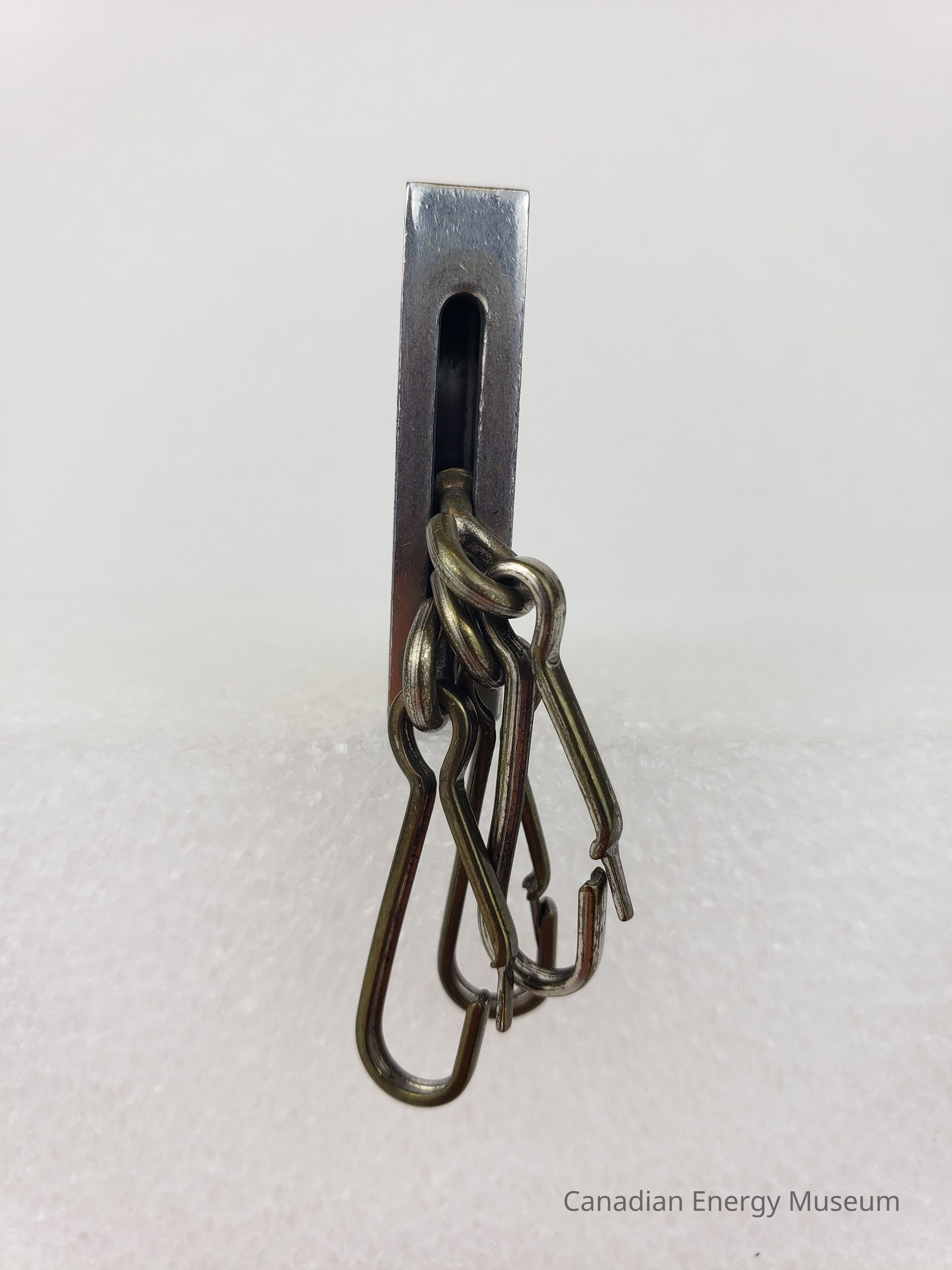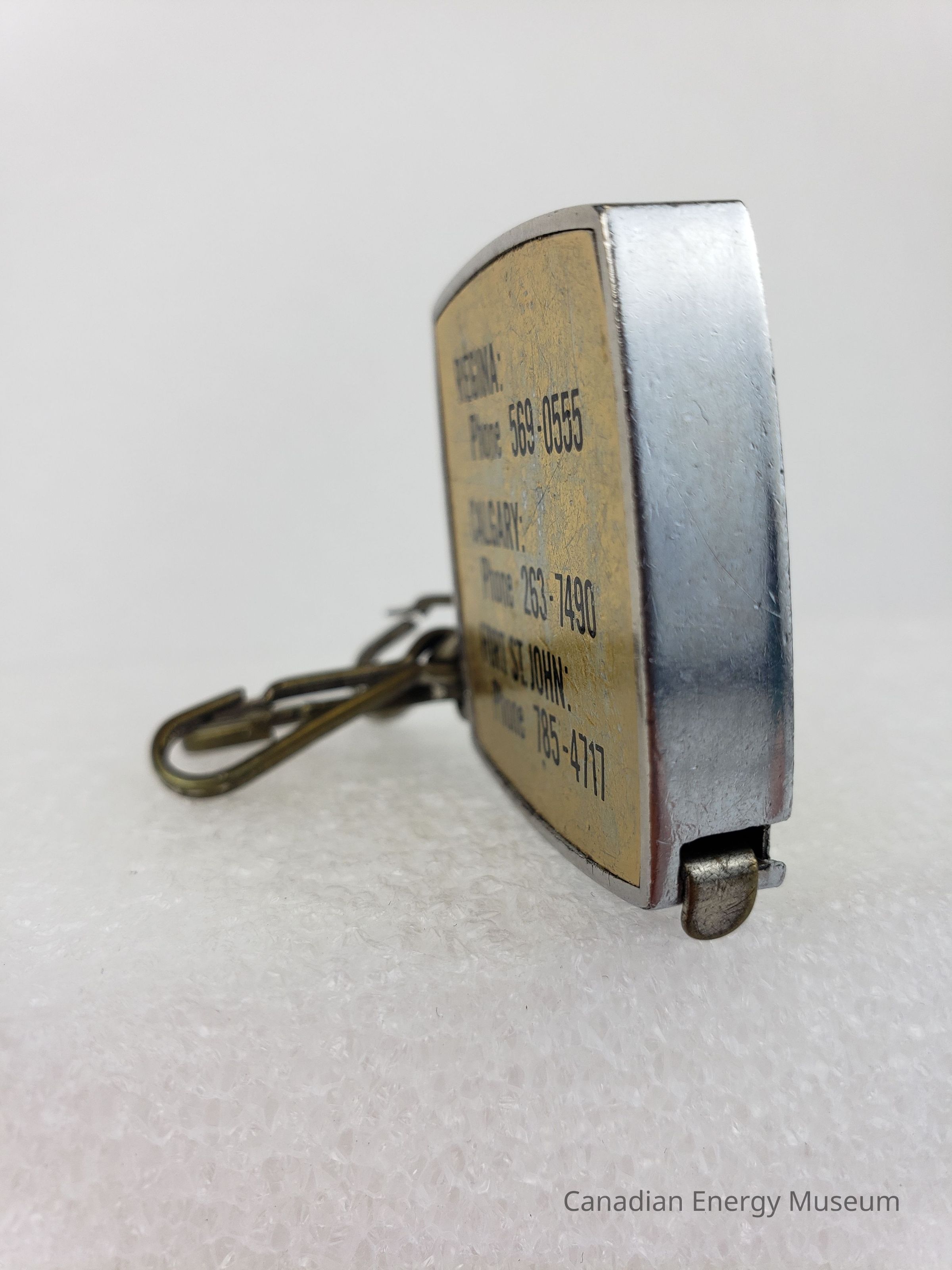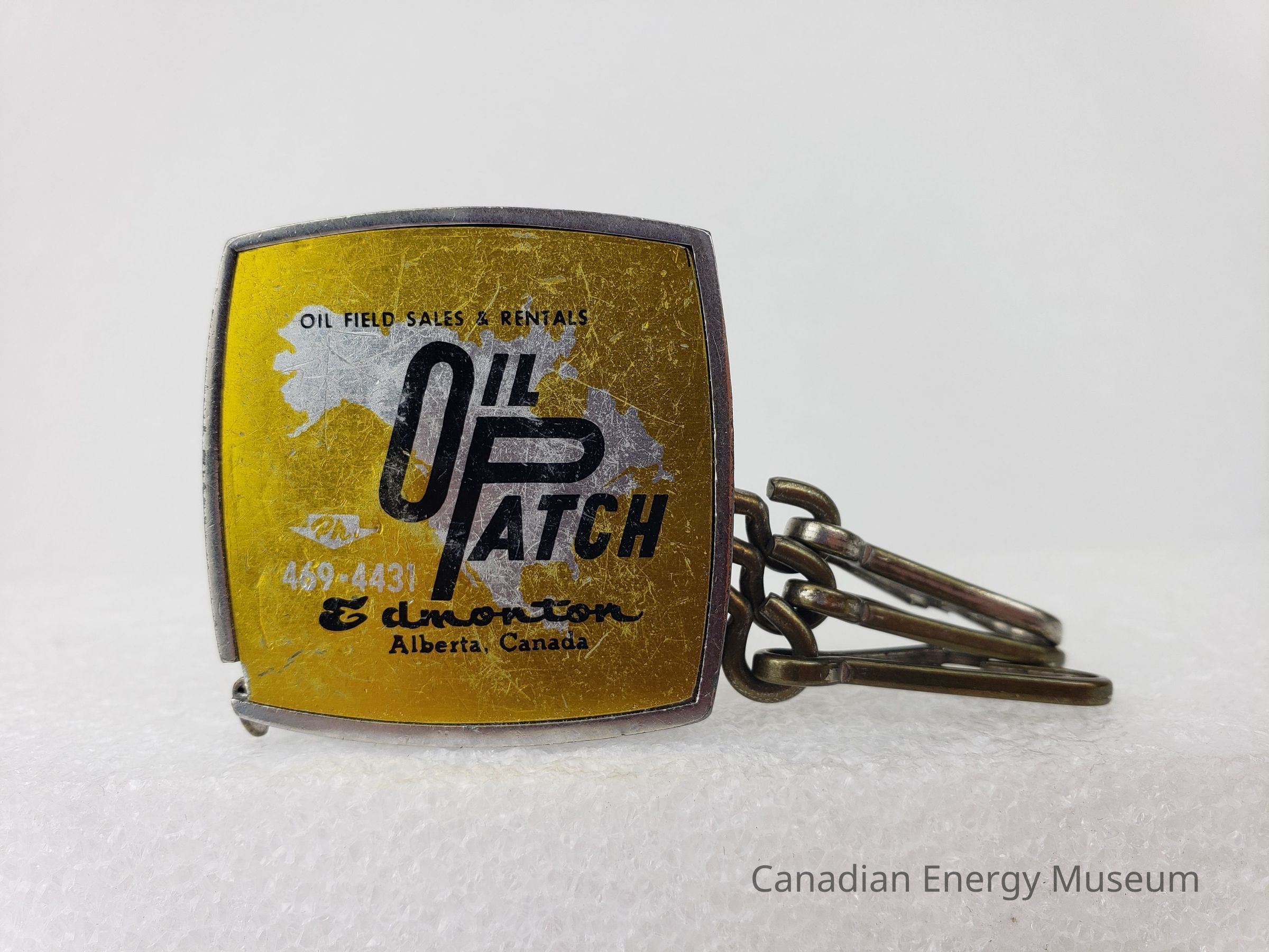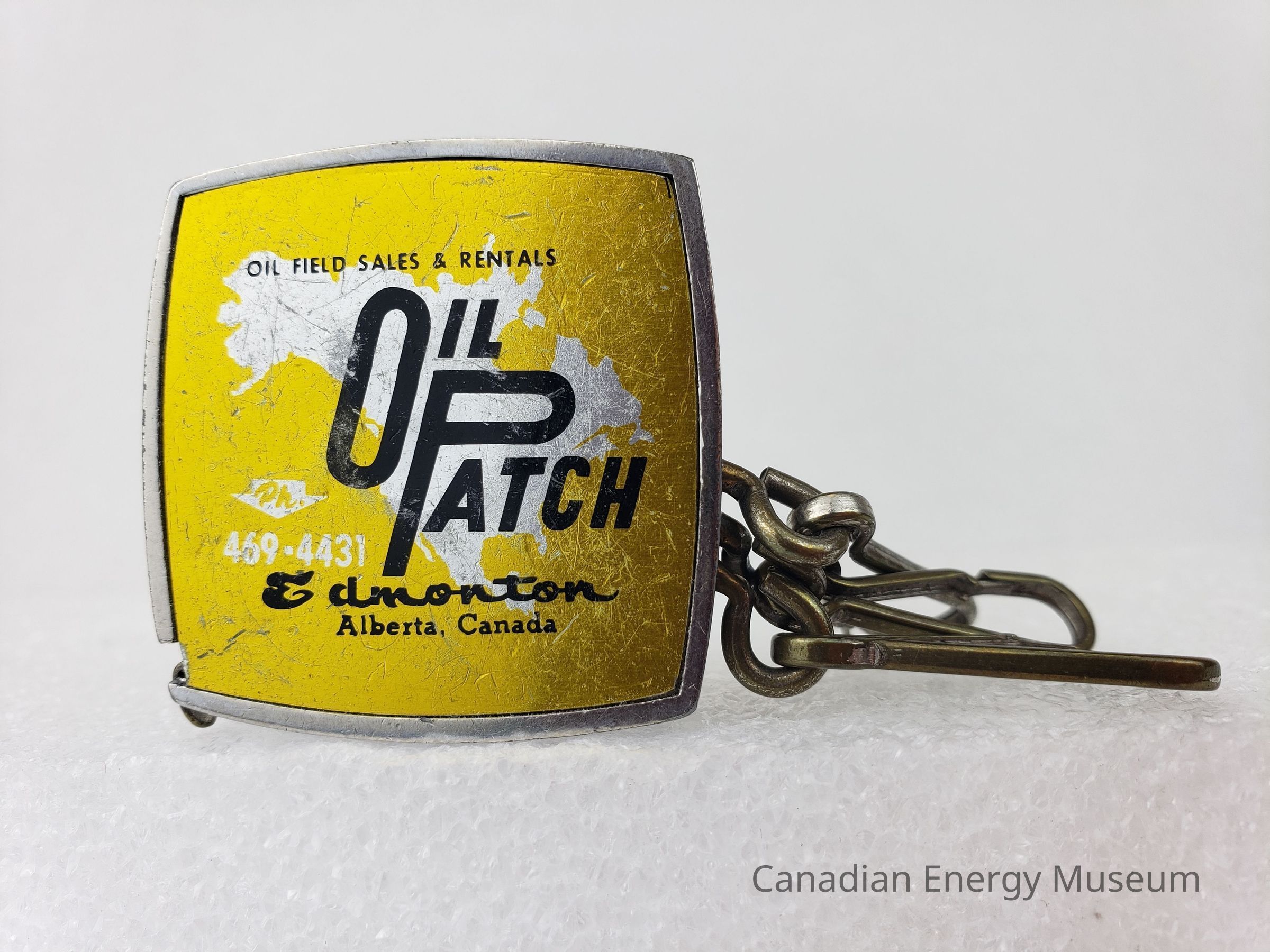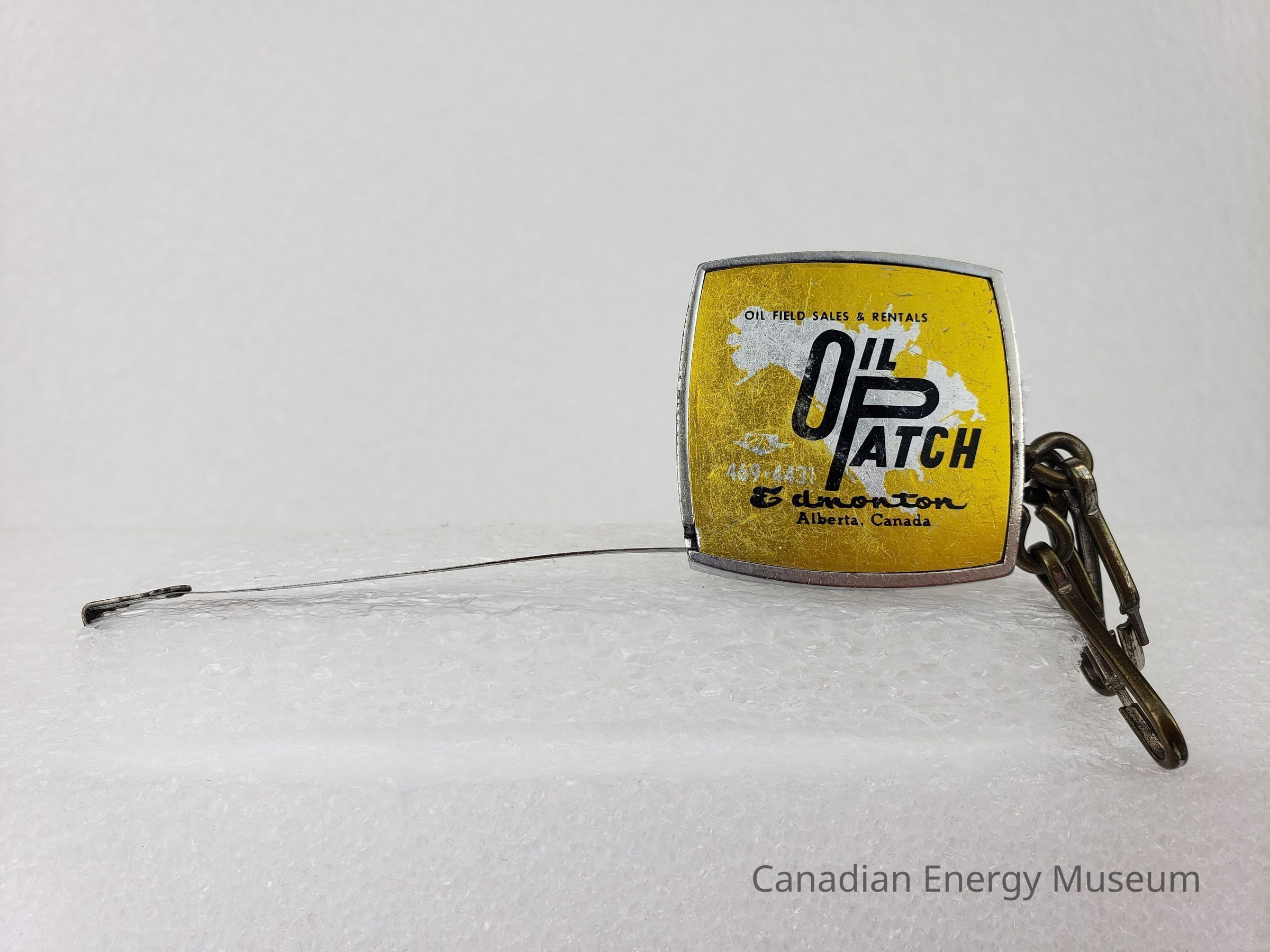 Description: A rounded square mini tape measure, with three snap-hook clasps attached. On the front surface is a label with a metallic yellow-gold base with metallic silver silhouette of North America. Over this, in black, is printed "OIL FIELD SALES & RENTALS; OIL PATCH; Edmonton; Alberta, Canada". On the reverse, over a metallic gold base, is printed "REGINA; Phone 569-0555; CALGARY; Phone 263-7490; FORT ST. JOHN; Phone 785-4717".Collection