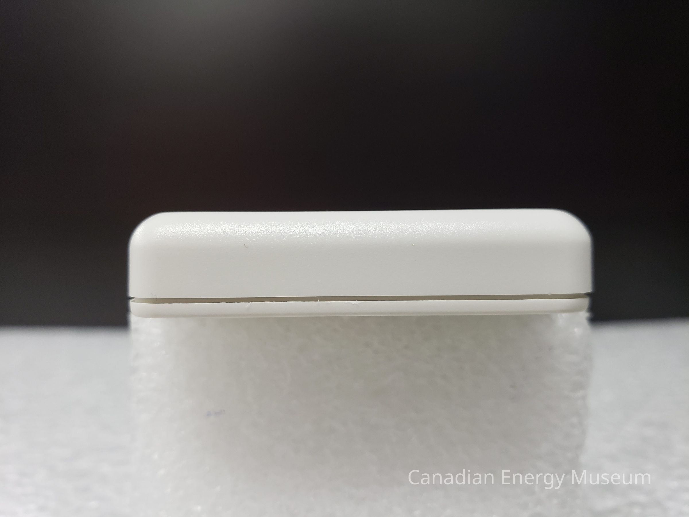 The thermometer is made of a white plastic and it shaped like a rectangle with rounded edges.