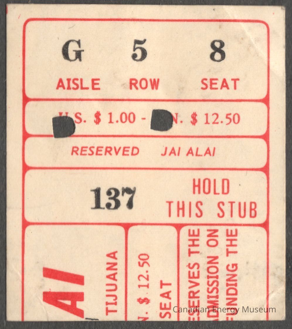 Ticket stub from a jai alai game. Ticket is number 137, and the holder had the following assigned seat: Aisle G, Row 5, Seat 8. Item is connected to the 1972 Association of Desk and Derrick Clubs of North America's 20th Annual Convention in San Diego. It is assumed that Lillias Ferguson and other convention attendees attended the match.