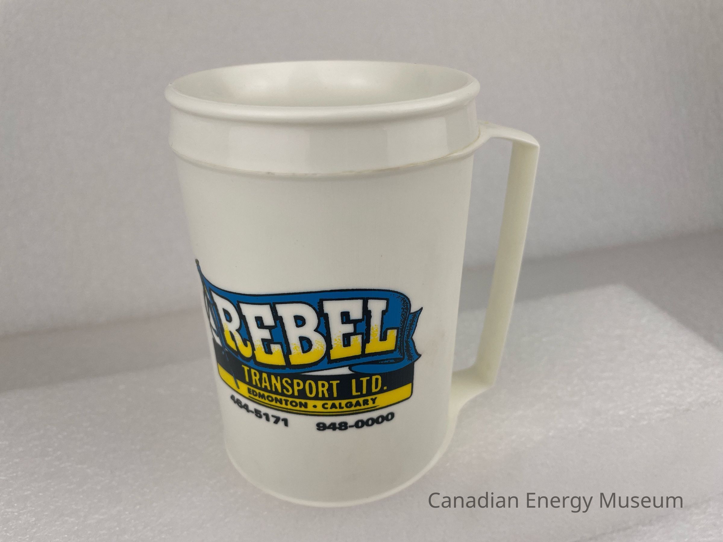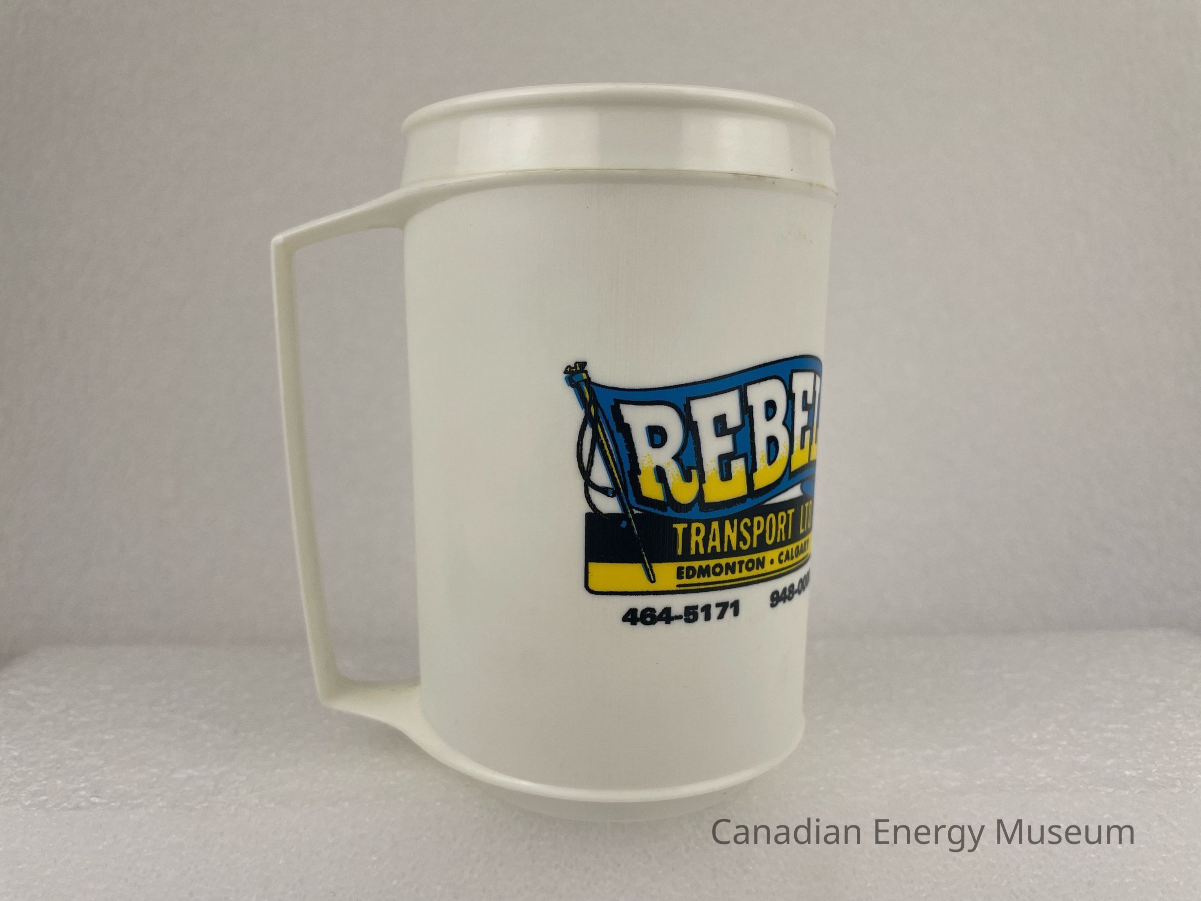 A tall, plastic, white travel mug with a handle and no lid. The front and back of the mug feature a blue, white, black, and yellow design. The design is of a blue flag with black outlined and white and yellow gradient text reading, "REBEL". Underneath, a black rectangle with yellow text, "TRANSPORT LTD.", followed by a thinner yellow rectangle and black underlined text reading, "EDMONTON . CALGARY". At the bottom are two phone numbers in black, "464-5171" and "948-0000".