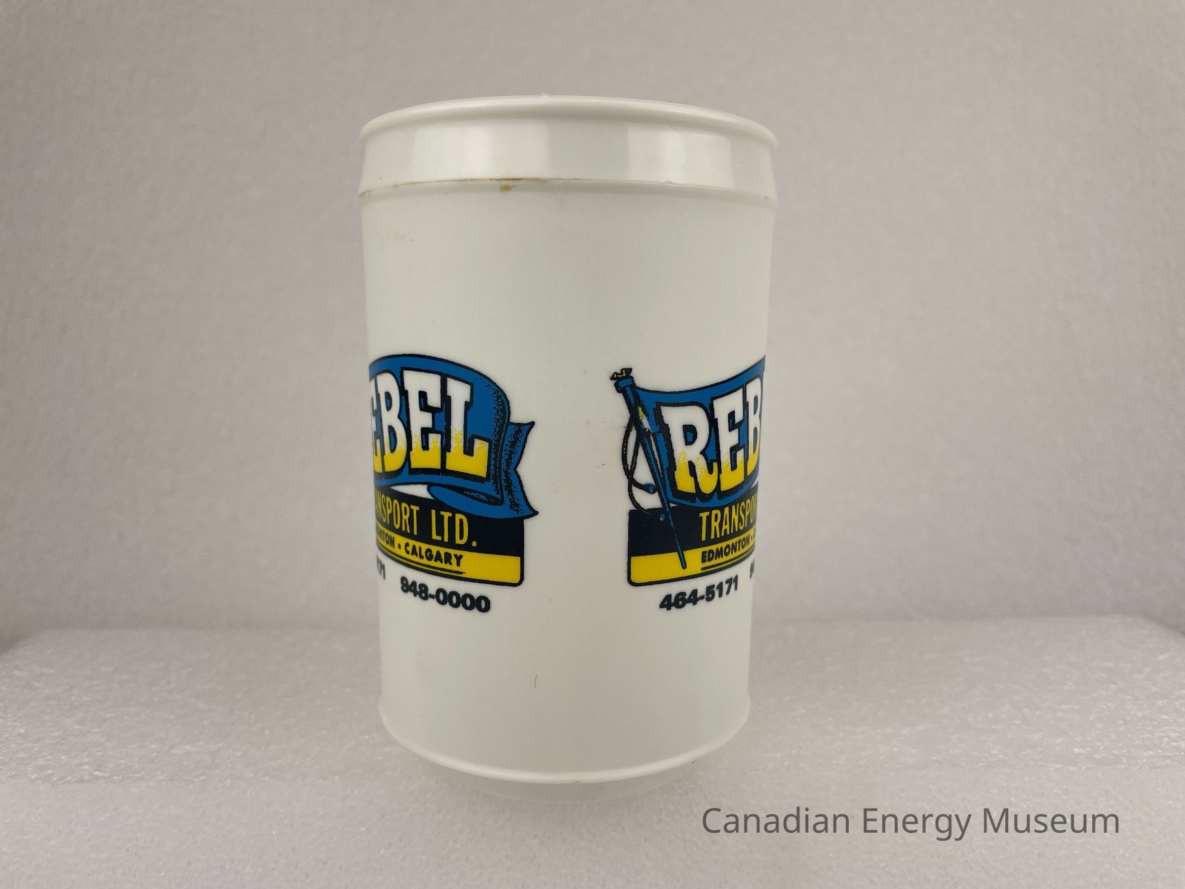 [Travel Mug] Rebel Transport Ltd., Edmonton, Calgary, Plastic, White Blue YellowEntry/Object ID