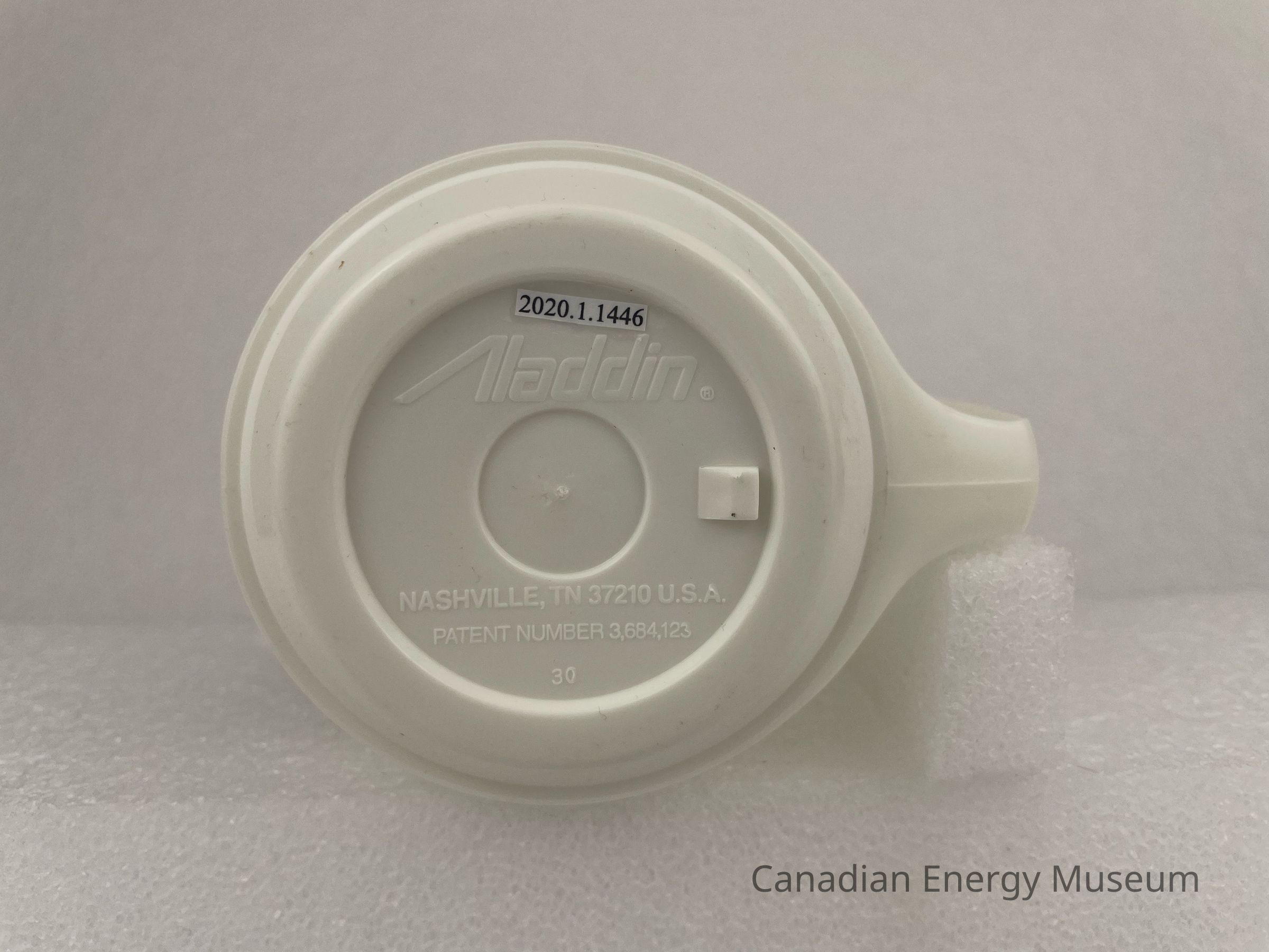 The bottom of the mug concaves into a smaller circle with raised text reading from top to bottom, "Aladdin; NASHVILLE, TN 37210 U.S.A.; PATENT NUMBER 3,684,123; 30". Another smaller circle concave rests in the center of the base.Collection