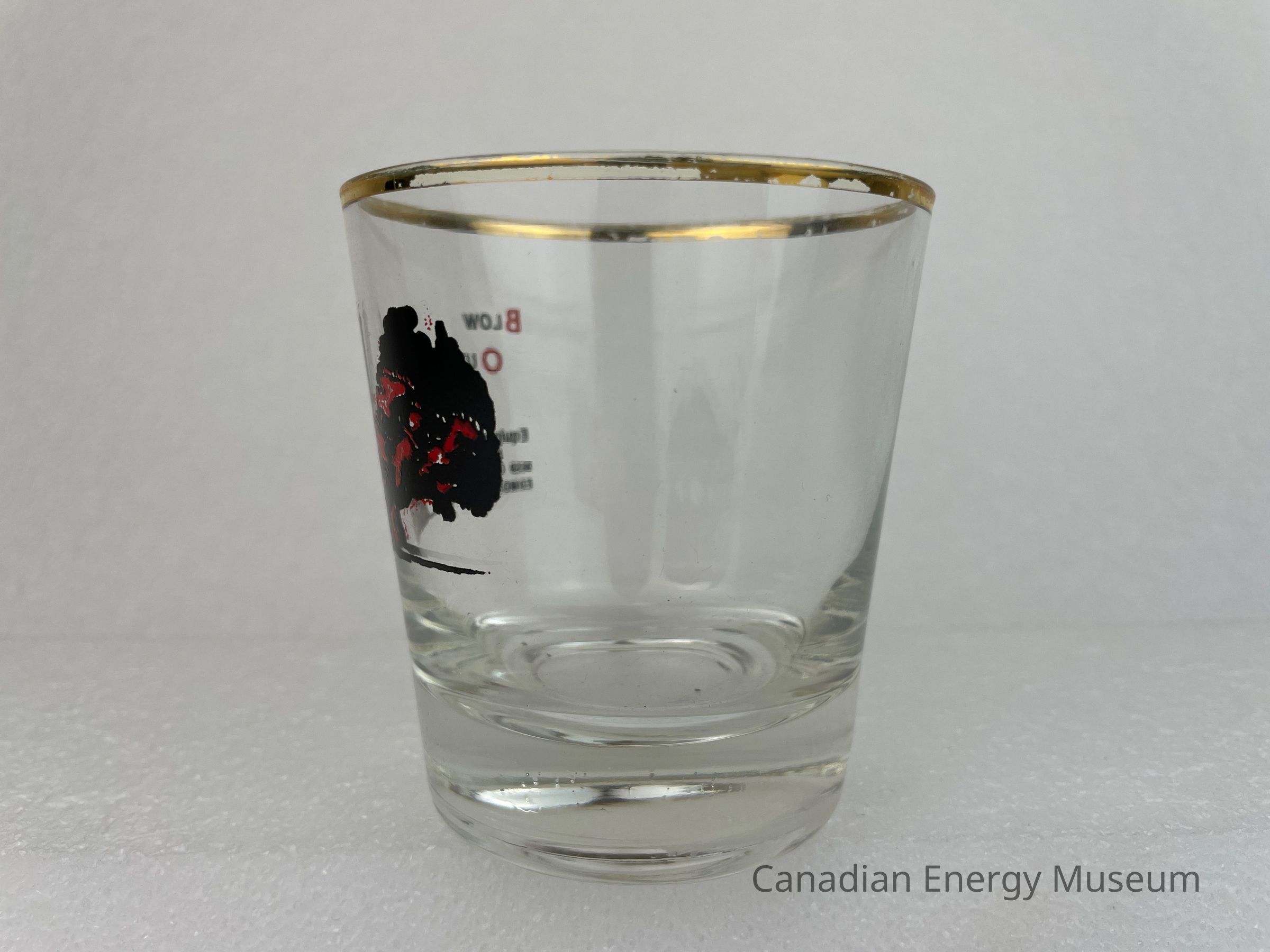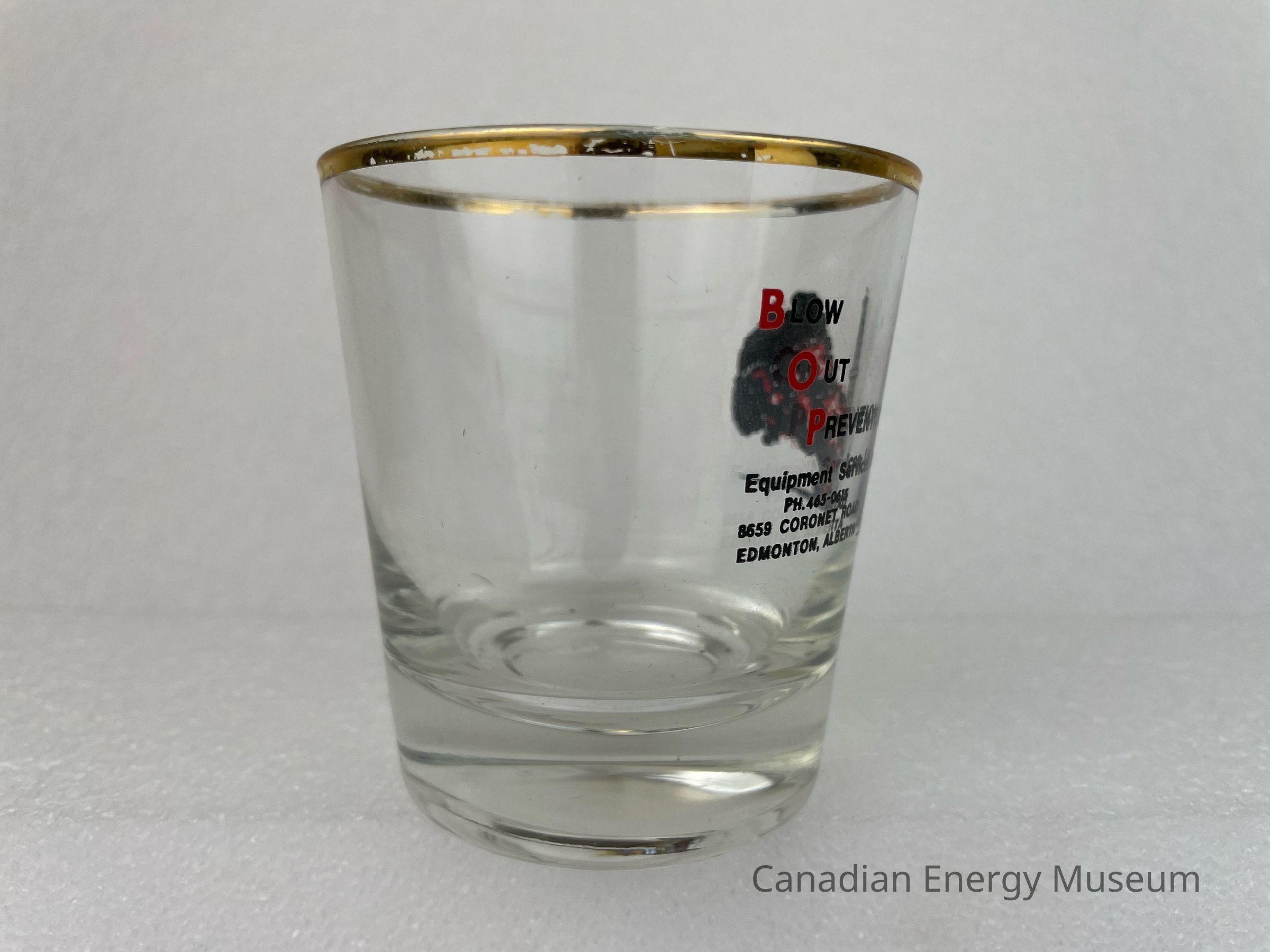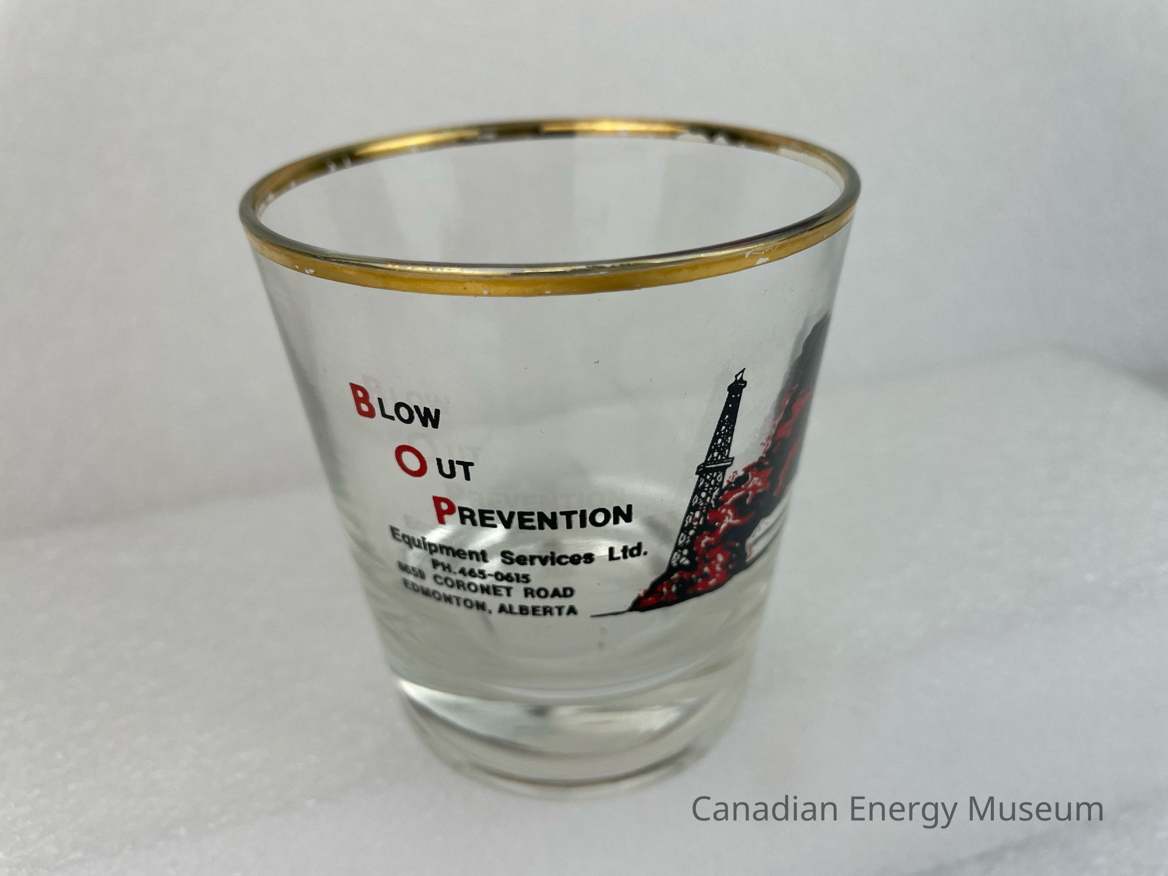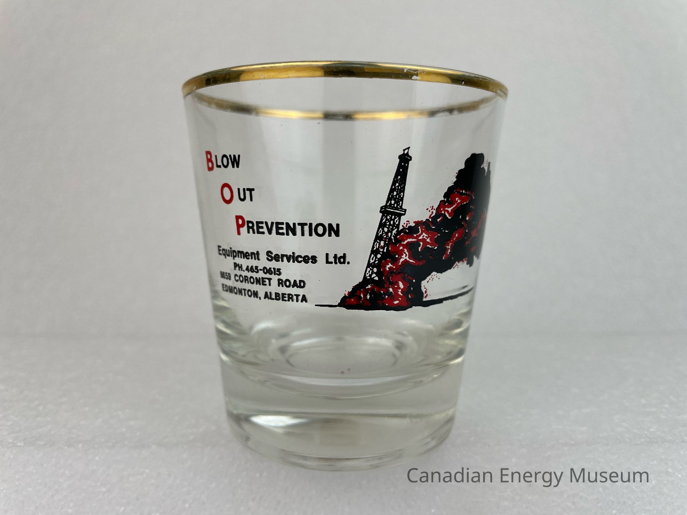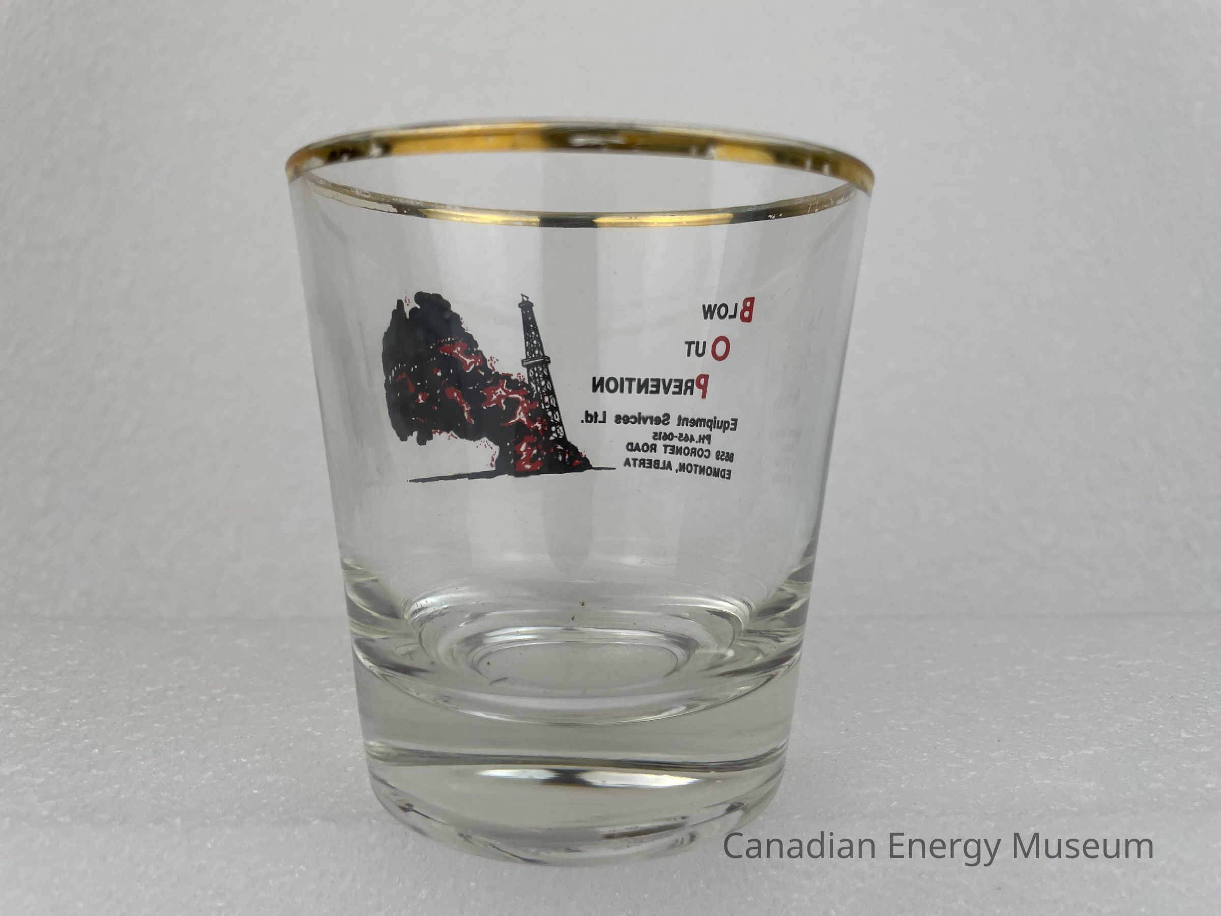 A clear whisky glass with a gold rim branded to Equipment Services Ltd. The glass is wider at the rim and slants inwards to a slightly thinner base. The front of the glass features a black and red illustration of an oil derrick with smoke billowing out from the bottom. Text is displayed to the left of the illustration. In black text (except the first letter in each word is red), each word is staircased reading, "BLOW OUT PREVENTION". Underneath in small black text reads, "Equipment Services Ltd. / PH. 465-0615 / 8659 CORONET ROAD / EDMONTON, ALBERTA".Collection