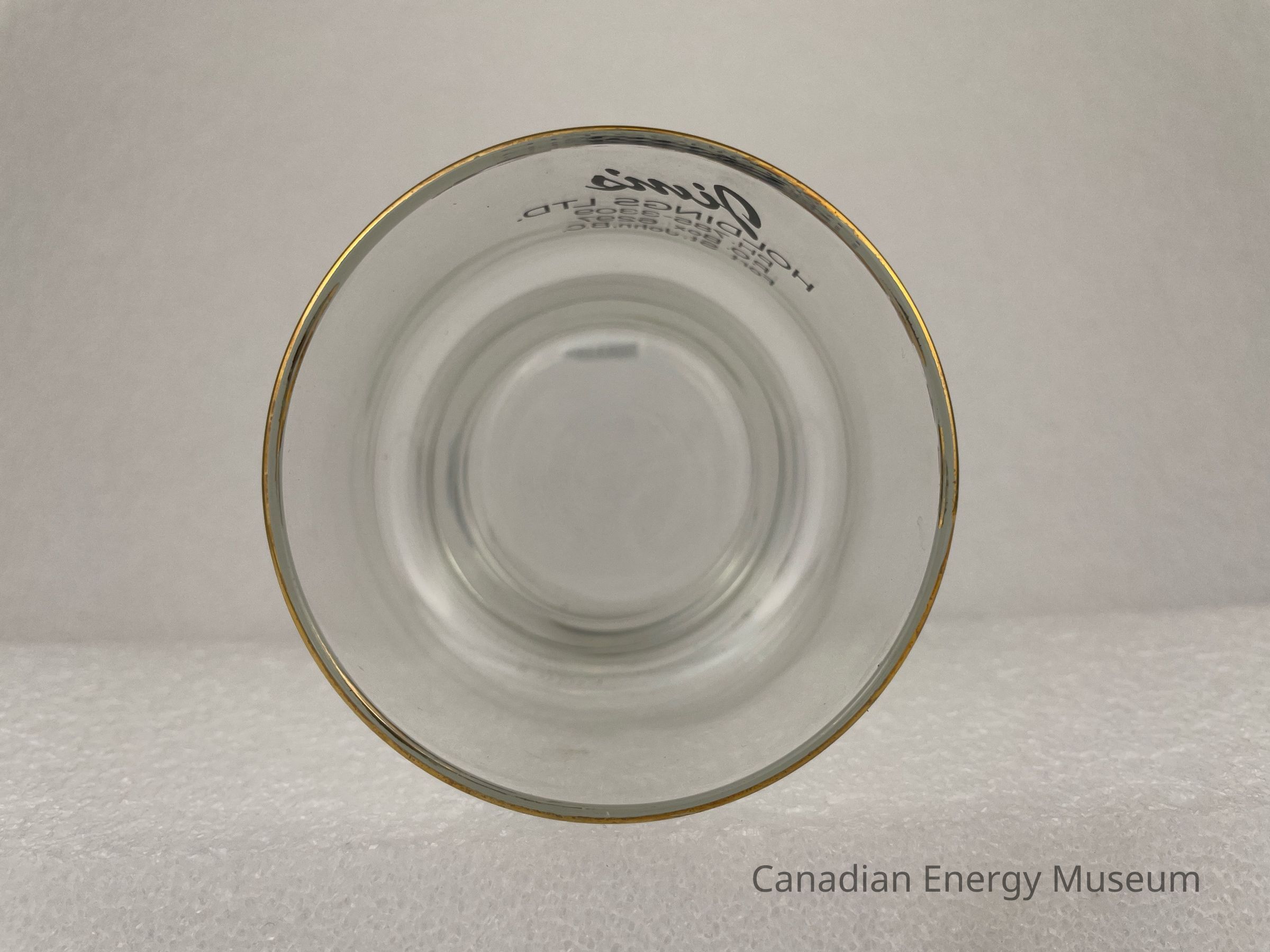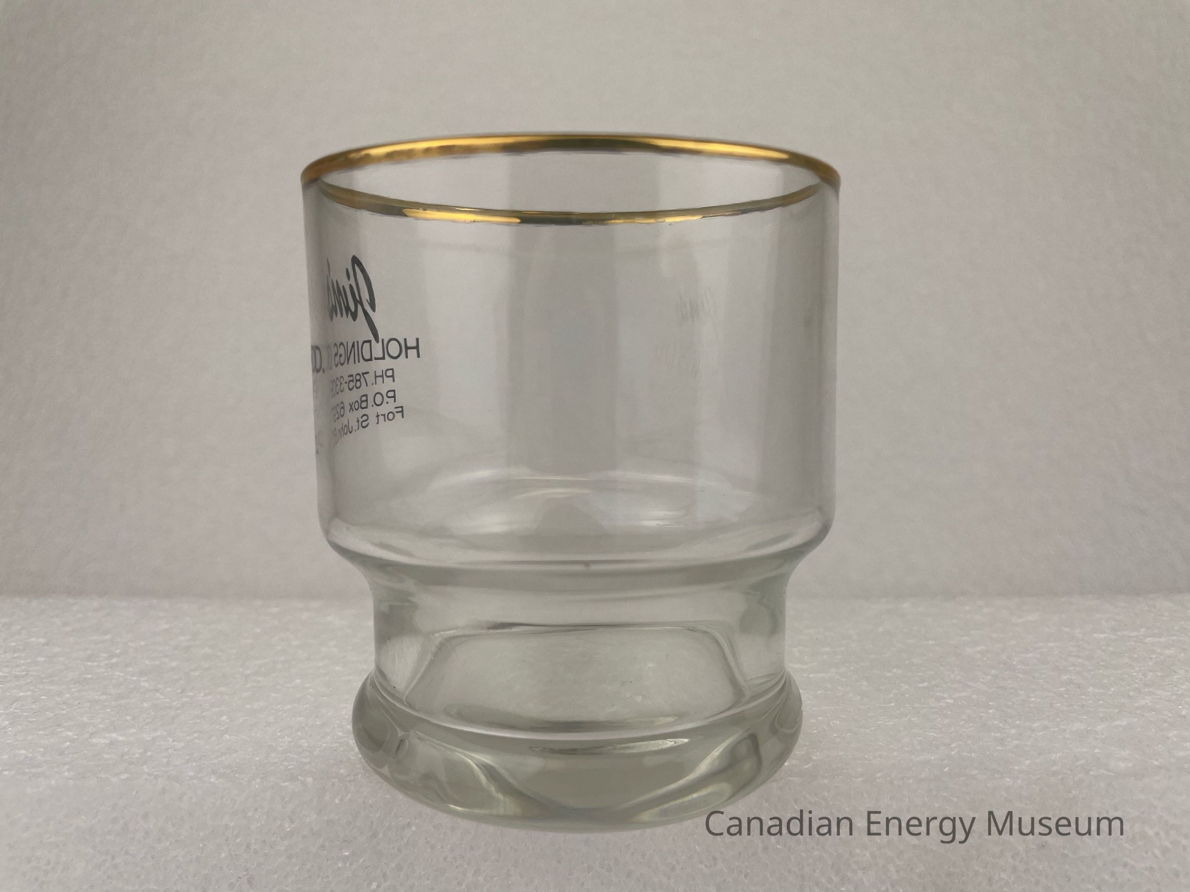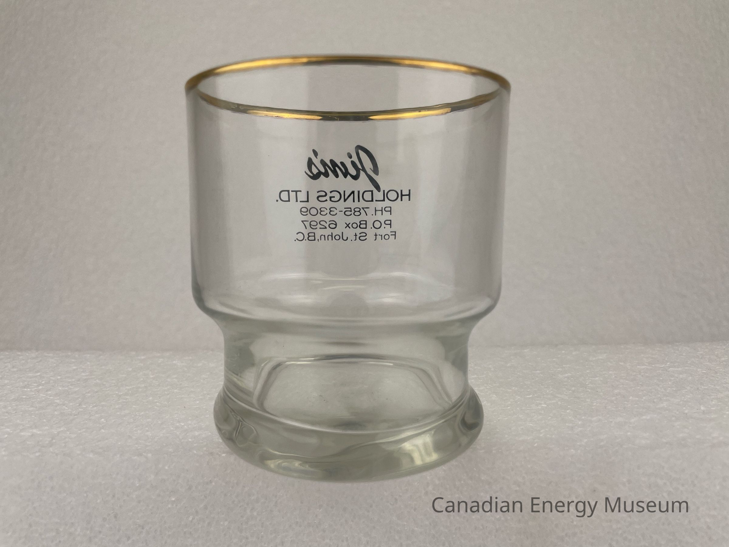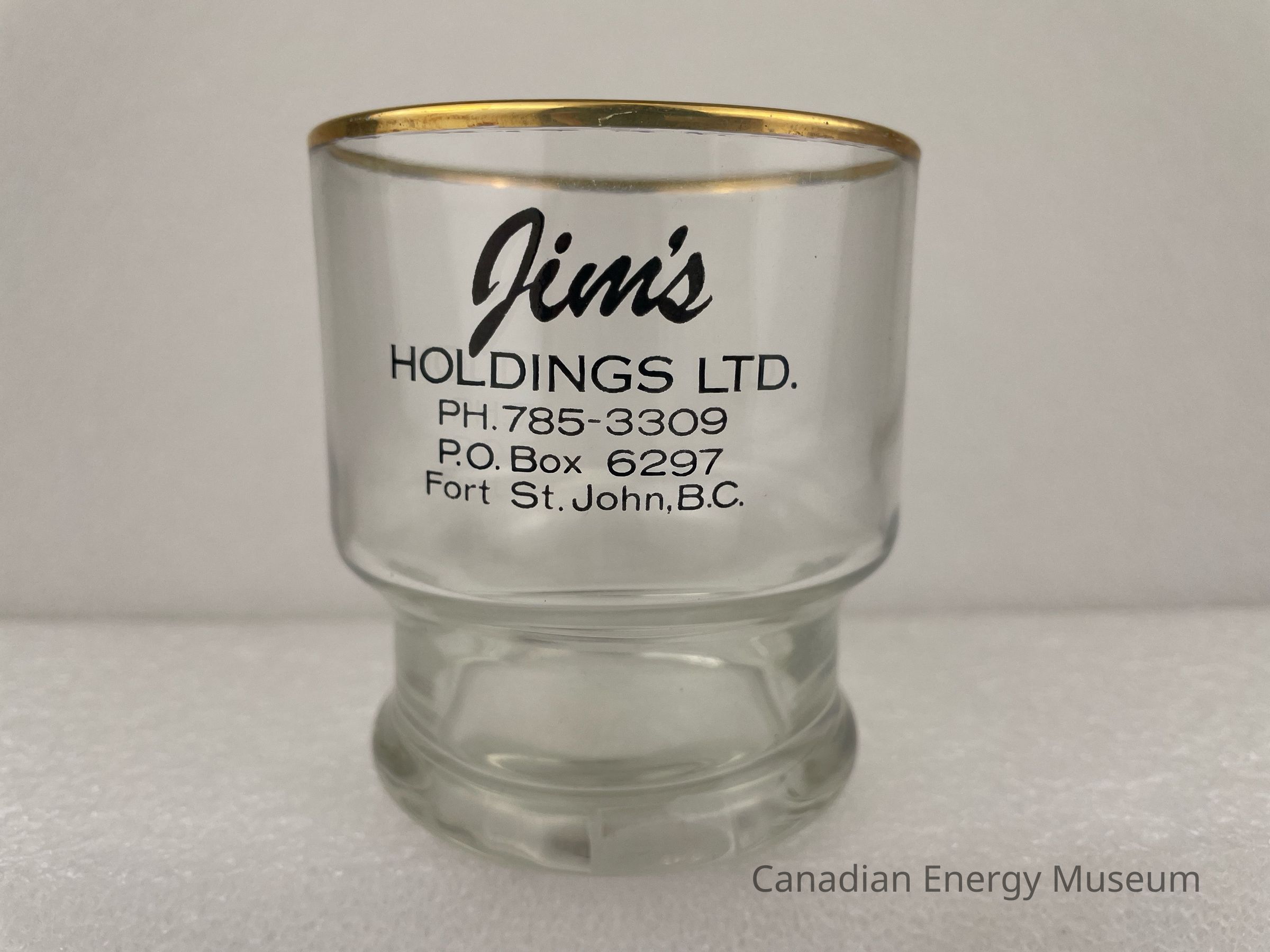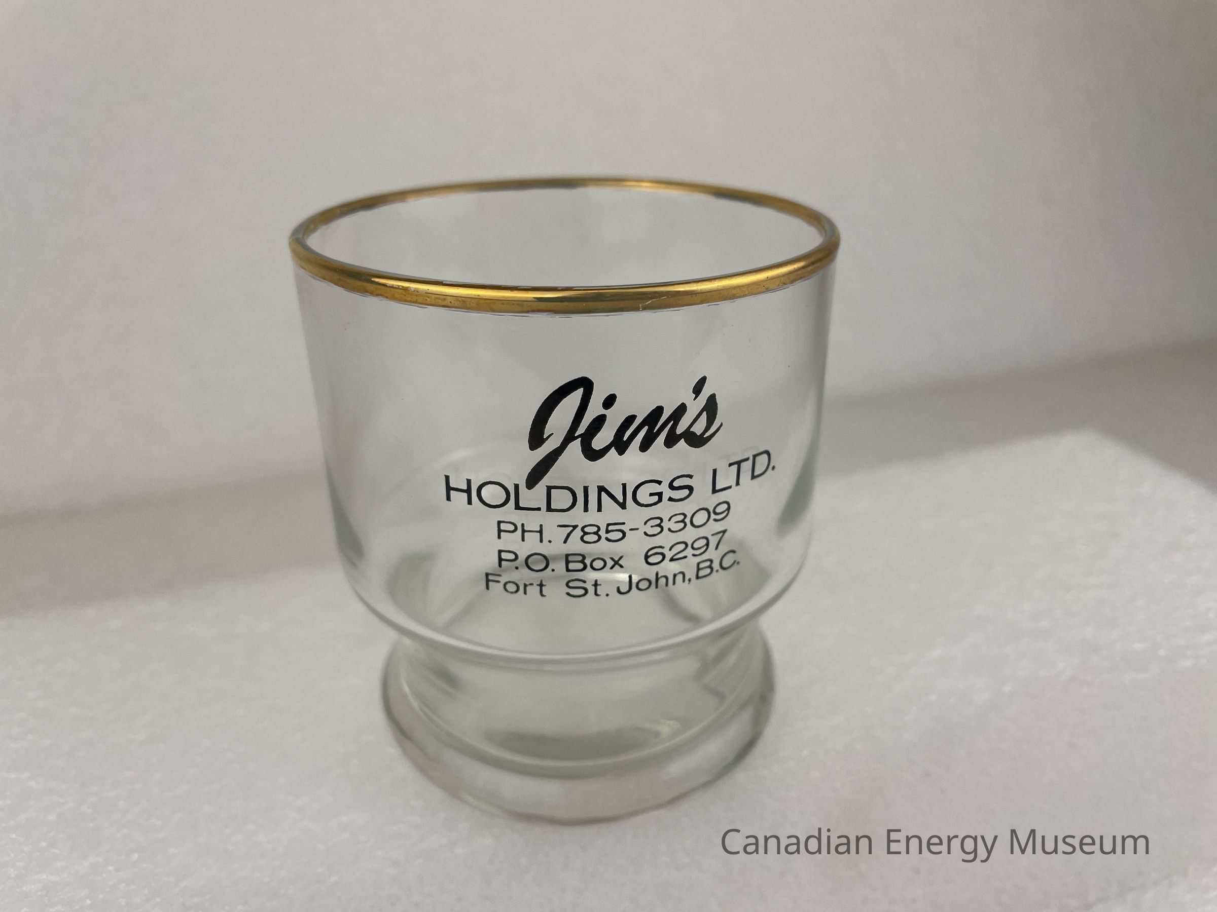 A clear whisky glass with a gold rim branded to Jim's Holdings Ltd. The body of the glass is slightly curved and has a smaller footed base. The design features cursive black text, "Jim's", and smaller, black, sans-serif text underneath that reads, "HOLDINGS LTD. / PH. 785-3309 / P.O. Box 6297 / Fort St. John, B.C."Collection