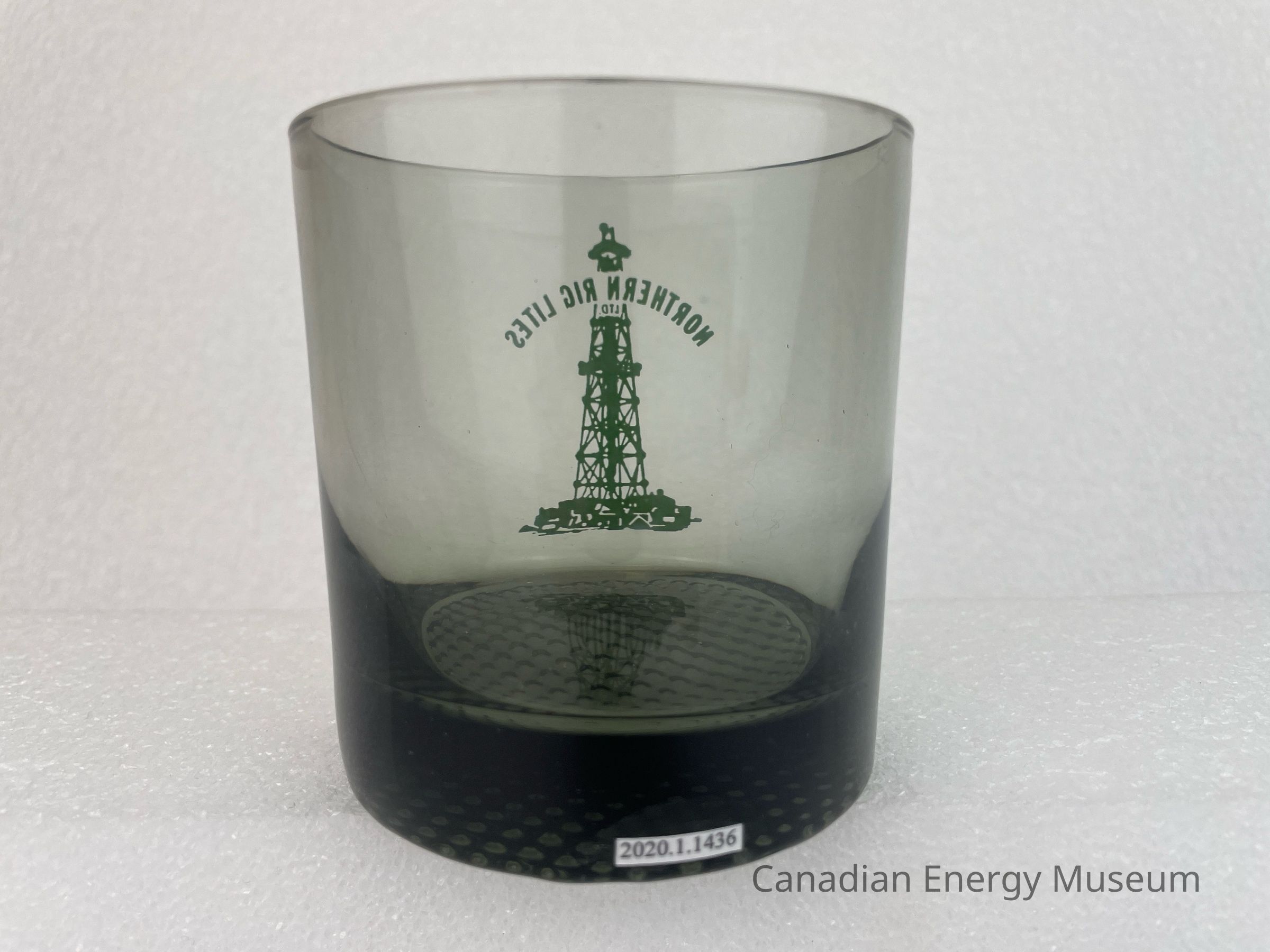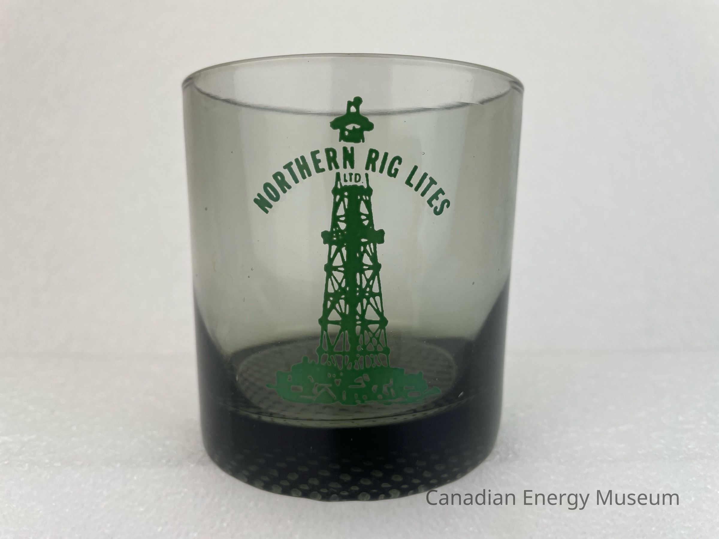 A black, translucent whisky glass branded to Northern Rig Lites Ltd. The front of the glass features a green illustration of an oil derrick. Running through the top of the derrick is arched green text reading, "NORTHERN RIG LITES LTD". The bottom of the glass is textured with small circular indents.Collection