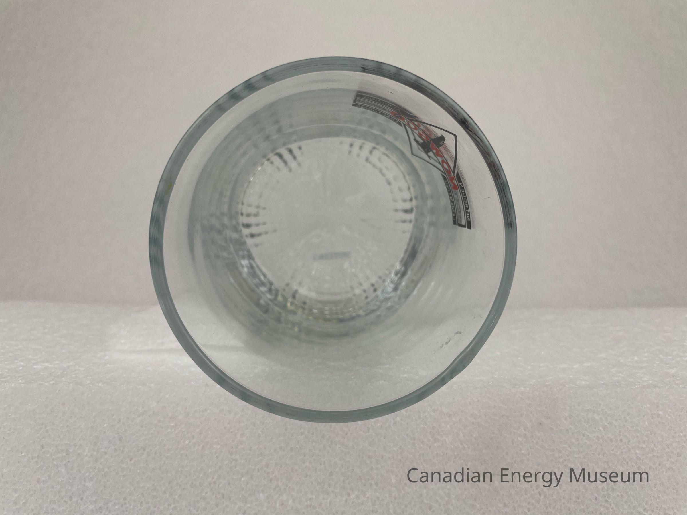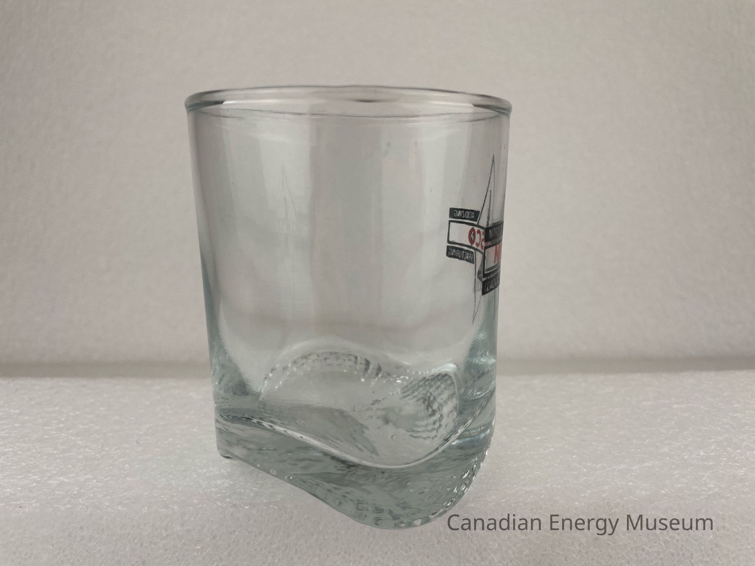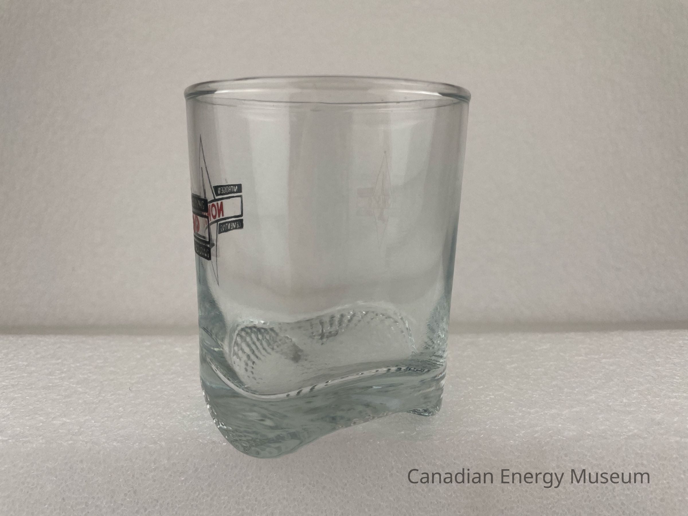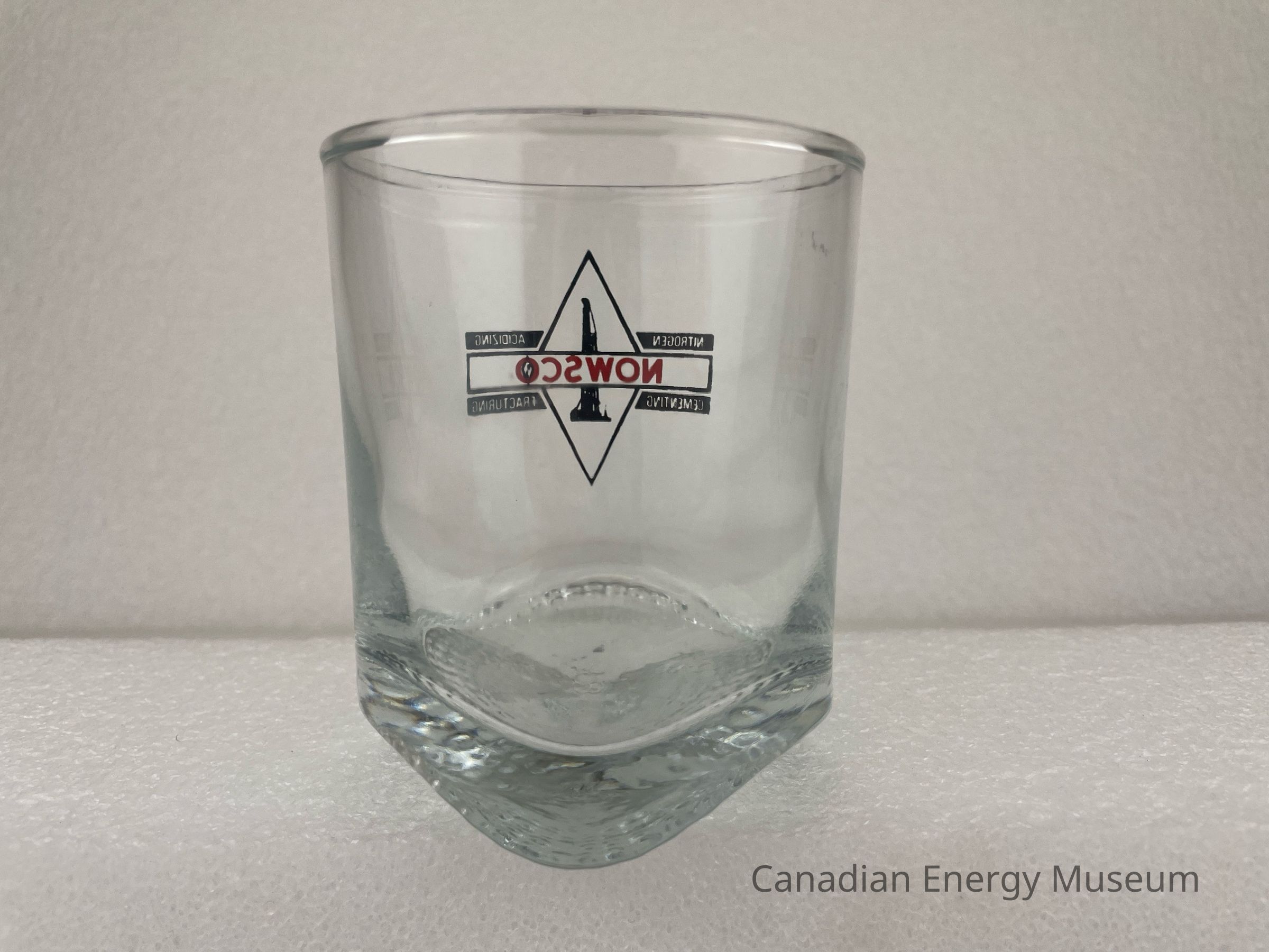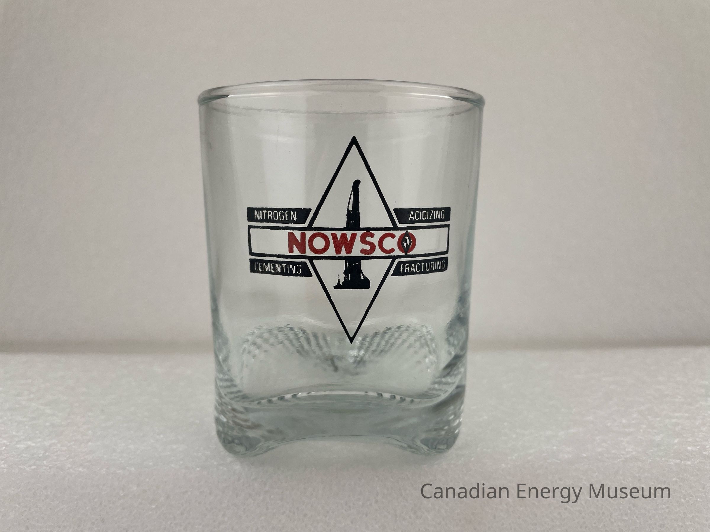 A footed, clear Whiskey glass branded to Nowsco. The printed design features a black outlined diamond with a black illustration of a drill rig in the centre. A black outlined rectangle runs through the centre of the diamond horizontally with red text, "NOWSCO". Four small, black rectangles surround the centred rectangle with text reading from top to bottom and left to right, "NITROGEN", "ACIDIZING", "CEMENTING", "FRACTURING".Collection