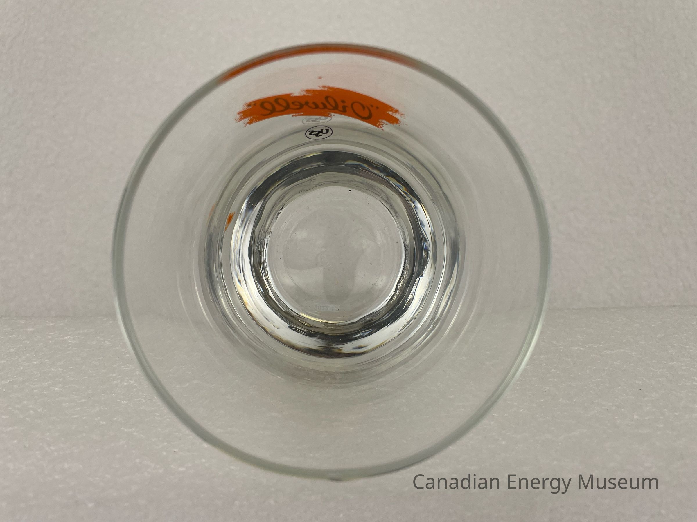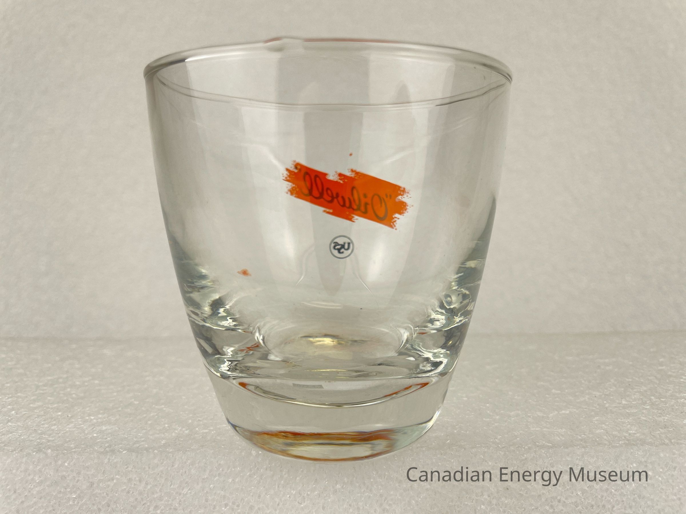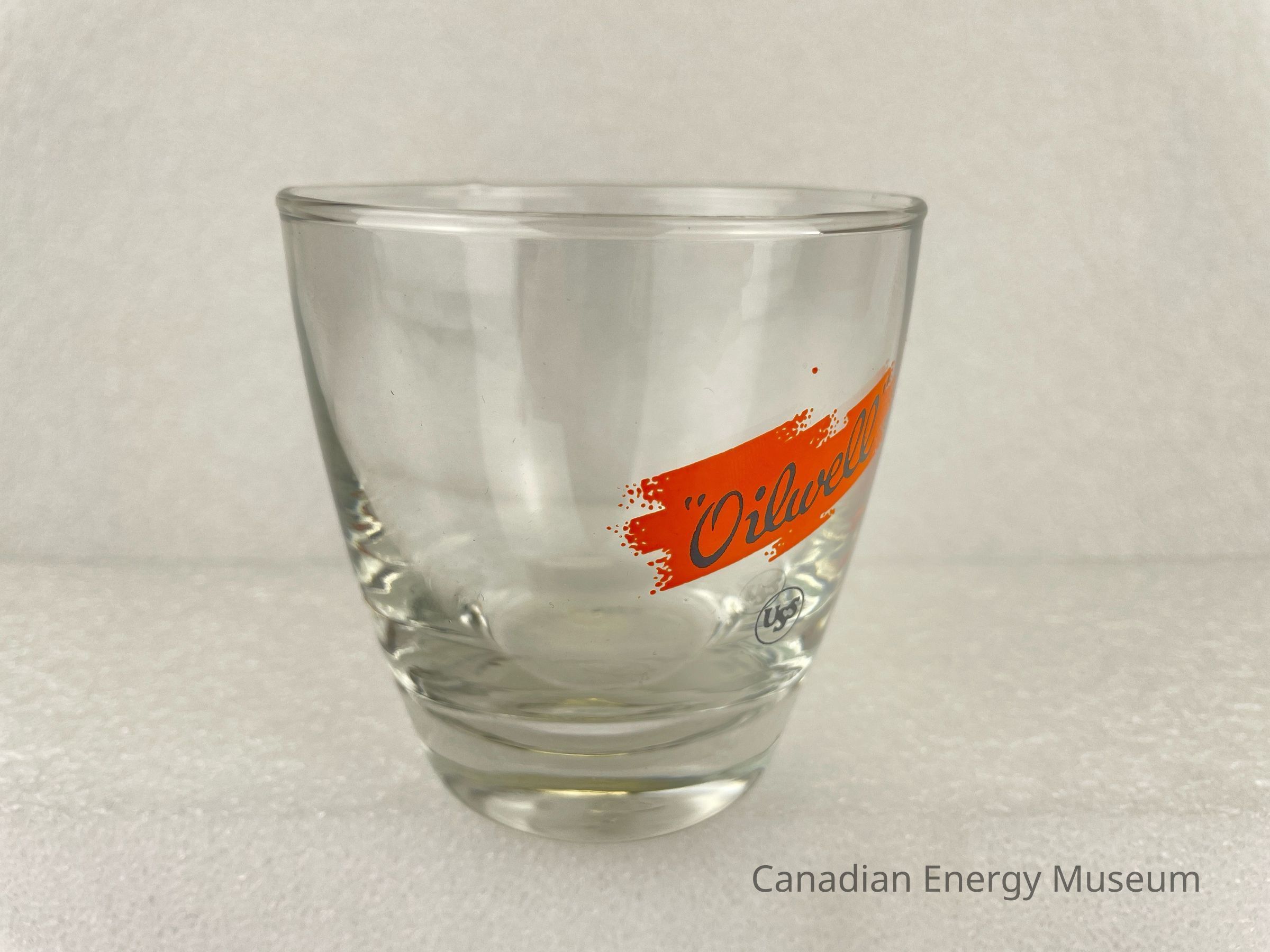 This glass is an angled rocks/old-fashioned drinking glass made from clear glass, with a printed design on one side. The heavy bottom is narrow, with the sides angling outward in a smooth curve, with a slight rounded lip at the top. The printed design consists of a stylized splash of orange, over which is the black script text "Oilwell", below is a smaller ring inside which is the stylized text "USS". The glasses likely date from the mid-1950s to the 1960s, based on the maker's mark ("L" within a circle, which began use in 1955) and dating of similar glasses.Collection