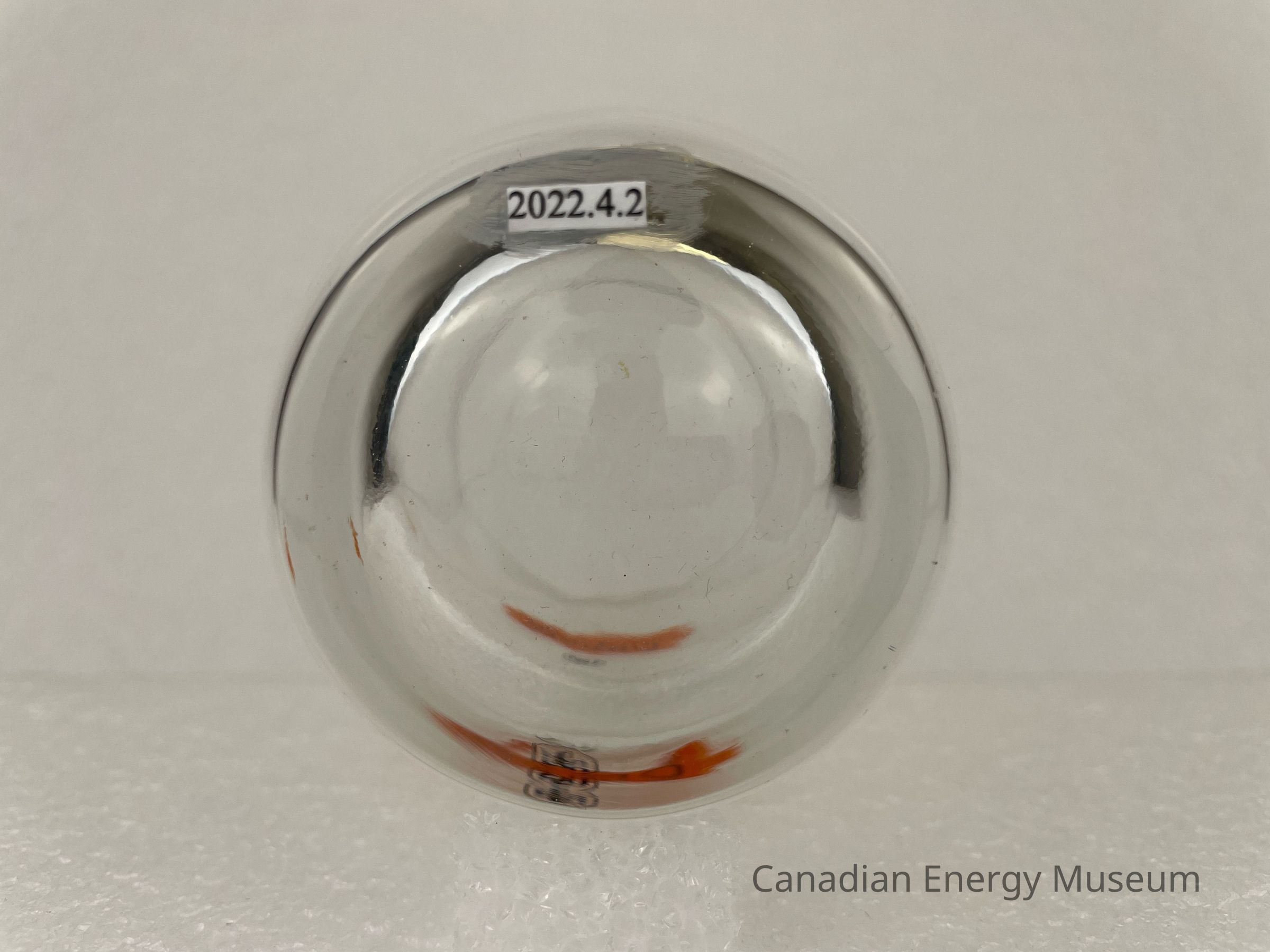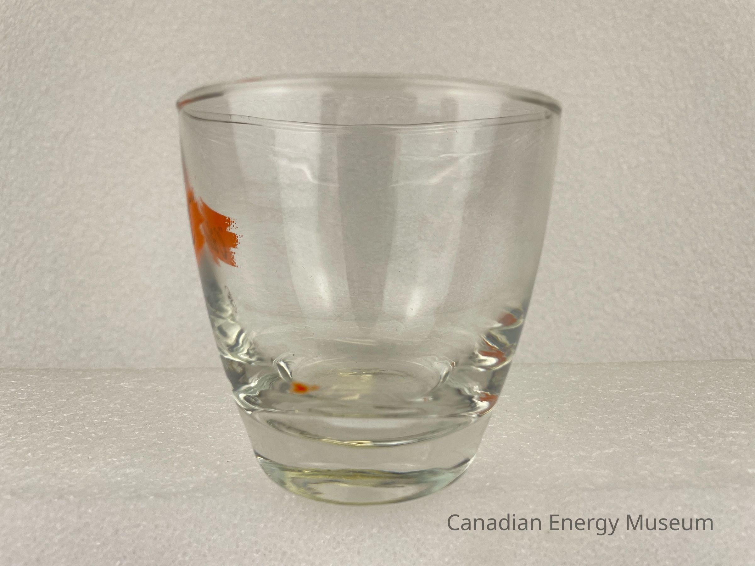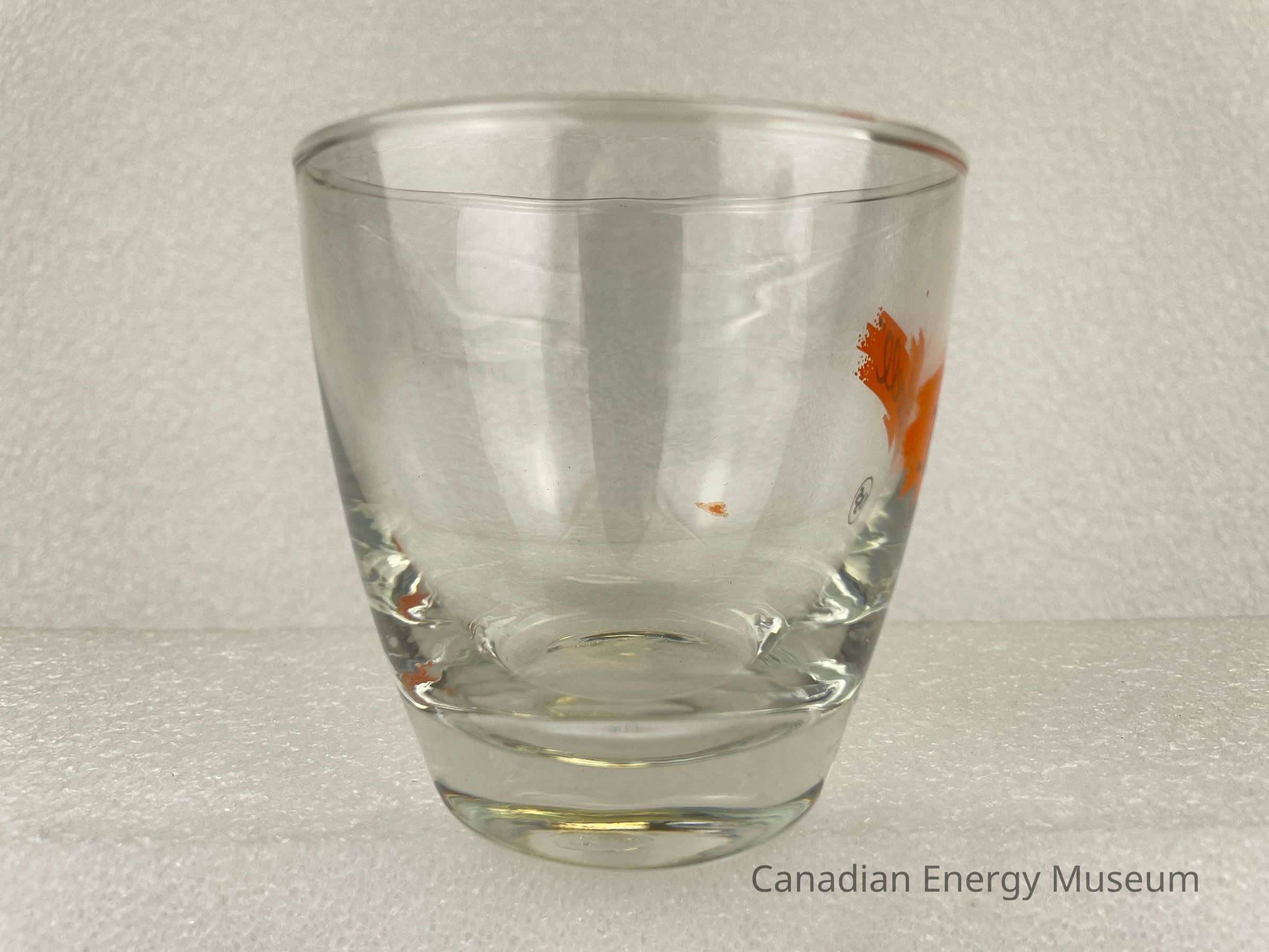 This glass is an angled rocks/old-fashioned drinking glass made from clear glass, with a printed design on one side. The heavy bottom is narrow, with the sides angling outward in a smooth curve, with a slight rounded lip at the top. The printed design consists of a stylized splash of orange, over which is the black script text "Oilwell", below is a smaller ring inside which is the stylized text "USS". The glasses likely date from the mid-1950s to the 1960s, based on the maker's mark ("L" within a circle, which began use in 1955) and dating of similar glasses.Collection