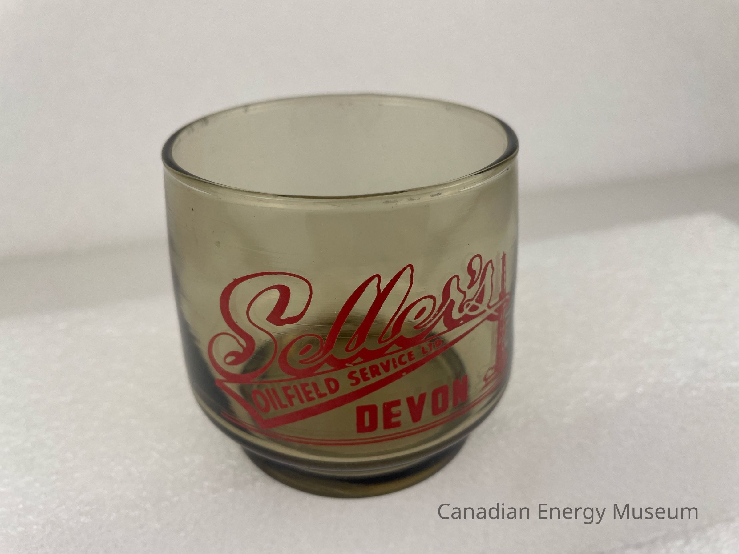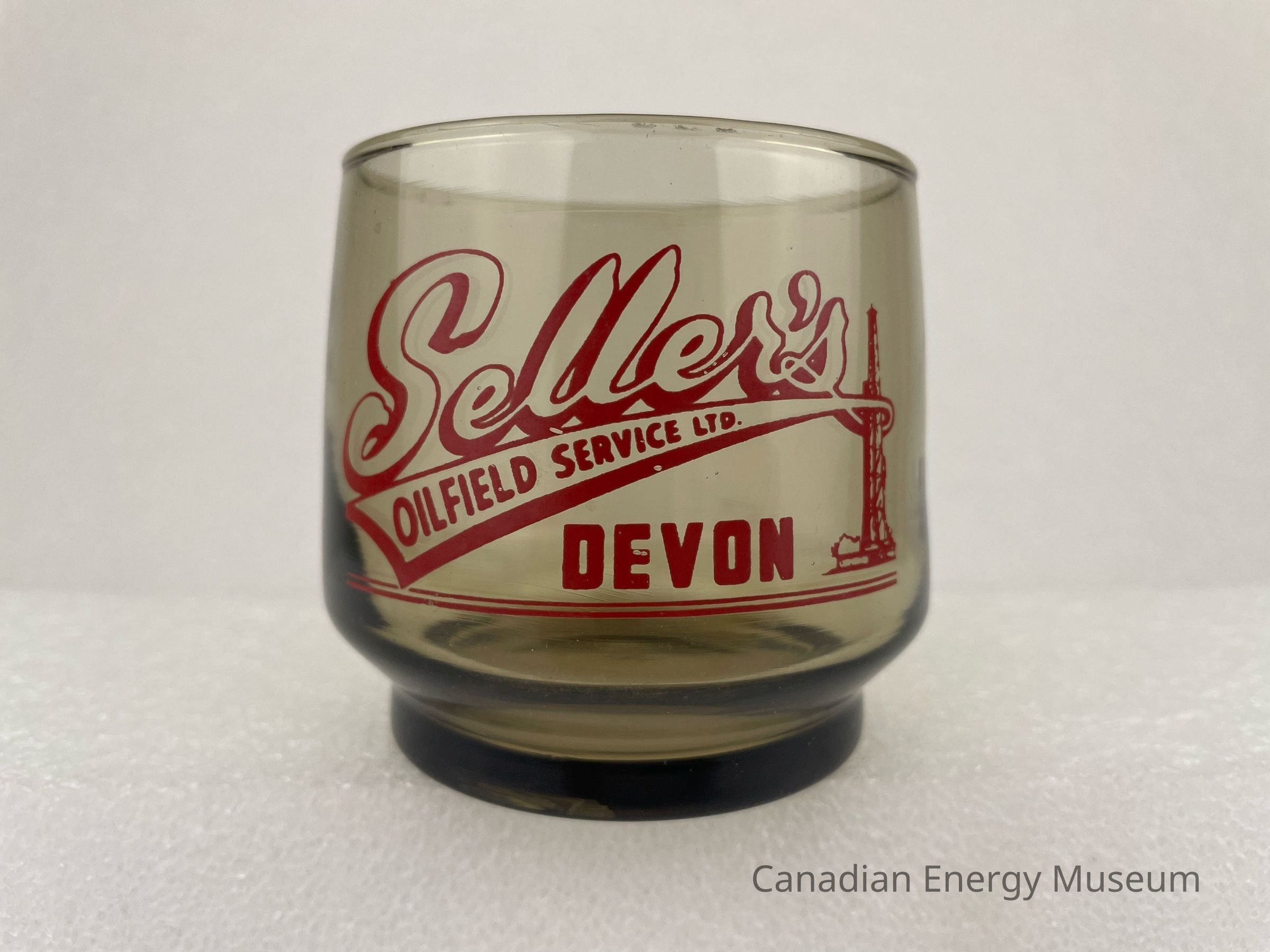 A brown-coloured whisky glass branded to Seller's Oilfield Service Ltd. The body of the glass is slightly curved and has a smaller footed base. The design features large, cursive, red, outlined text reading, "Seller's". Underneath, in a long, triangular, red-outlined banner, red text reads, "OILFIELD SERVICE LTD." Underneath and right-aligned is red text reading, "DEVON". To the right of the text is a red illustration of an oil derrick that is also being wrapped between the banner. At the bottom are two thin horizontal red lines.Collection
