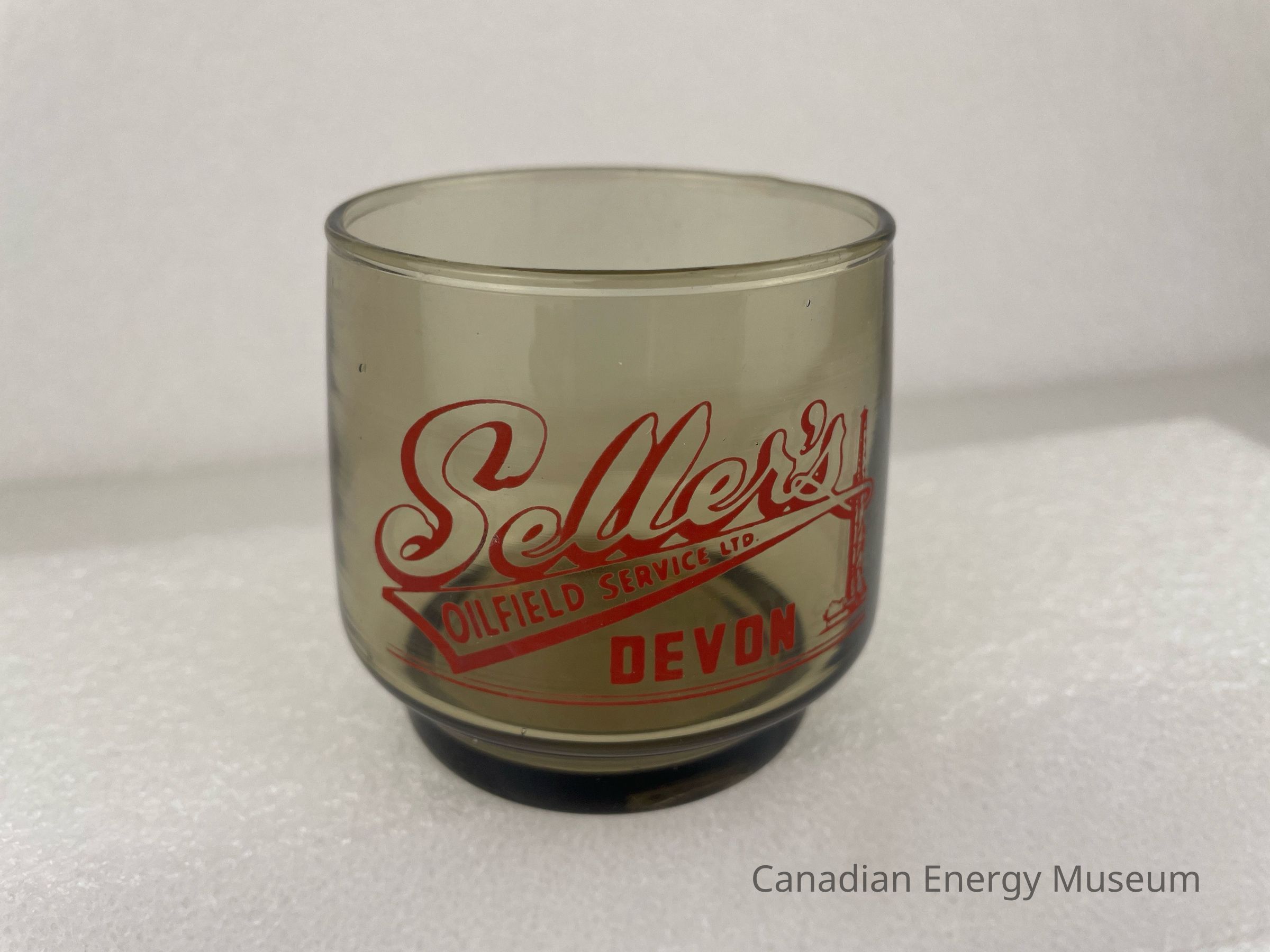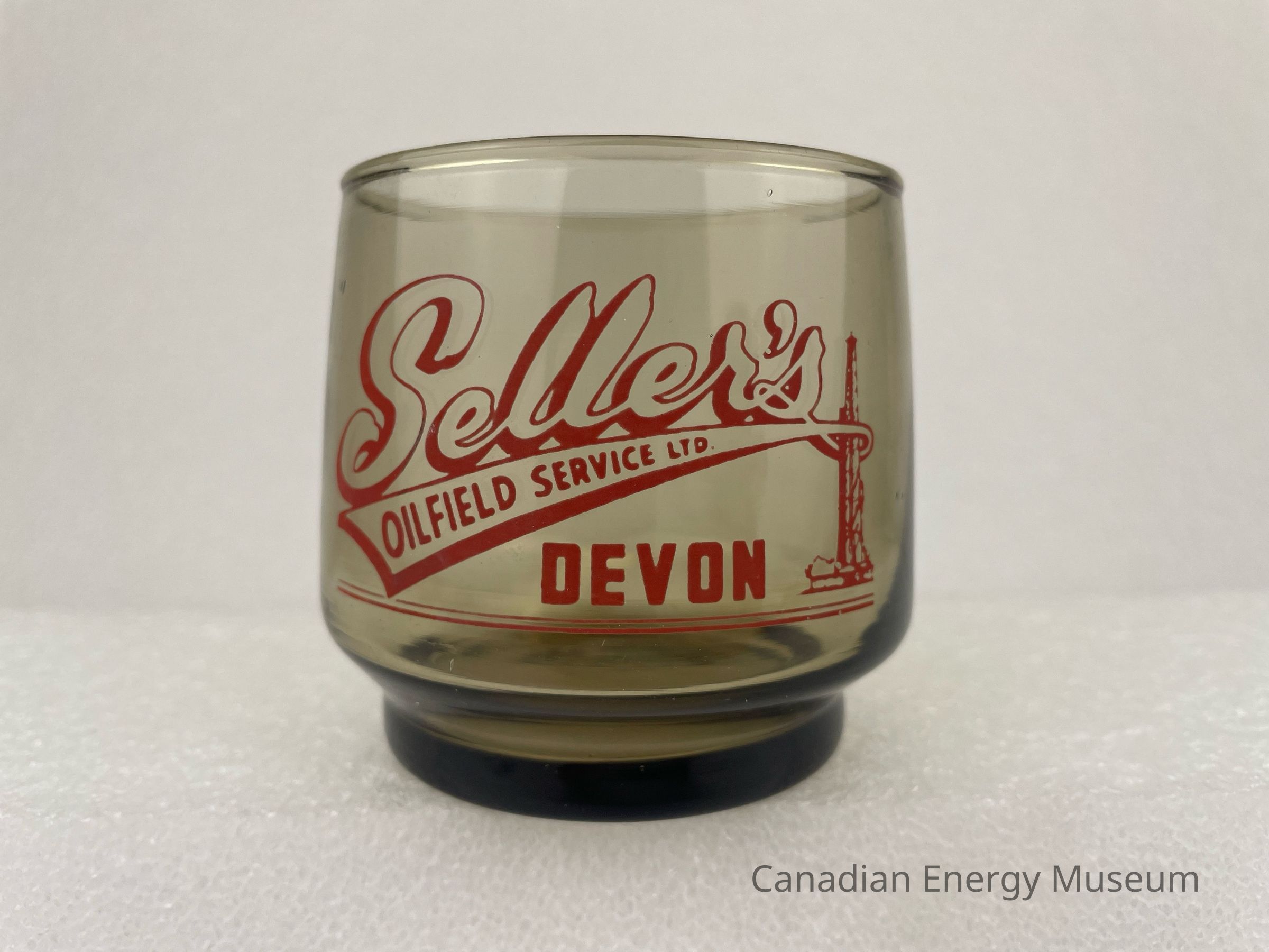 A brown-coloured whisky glass branded to Seller's Oilfield Service Ltd. The body of the glass is slightly curved and has a smaller footed base. The design features large, cursive, red, outlined text reading, "Seller's". Underneath, in a long, triangular, red-outlined banner, red text reads, "OILFIELD SERVICE LTD." Underneath and right-aligned is red text reading, "DEVON". To the right of the text is a red illustration of an oil derrick that is also being wrapped between the banner. At the bottom are two thin horizontal red lines.Collection