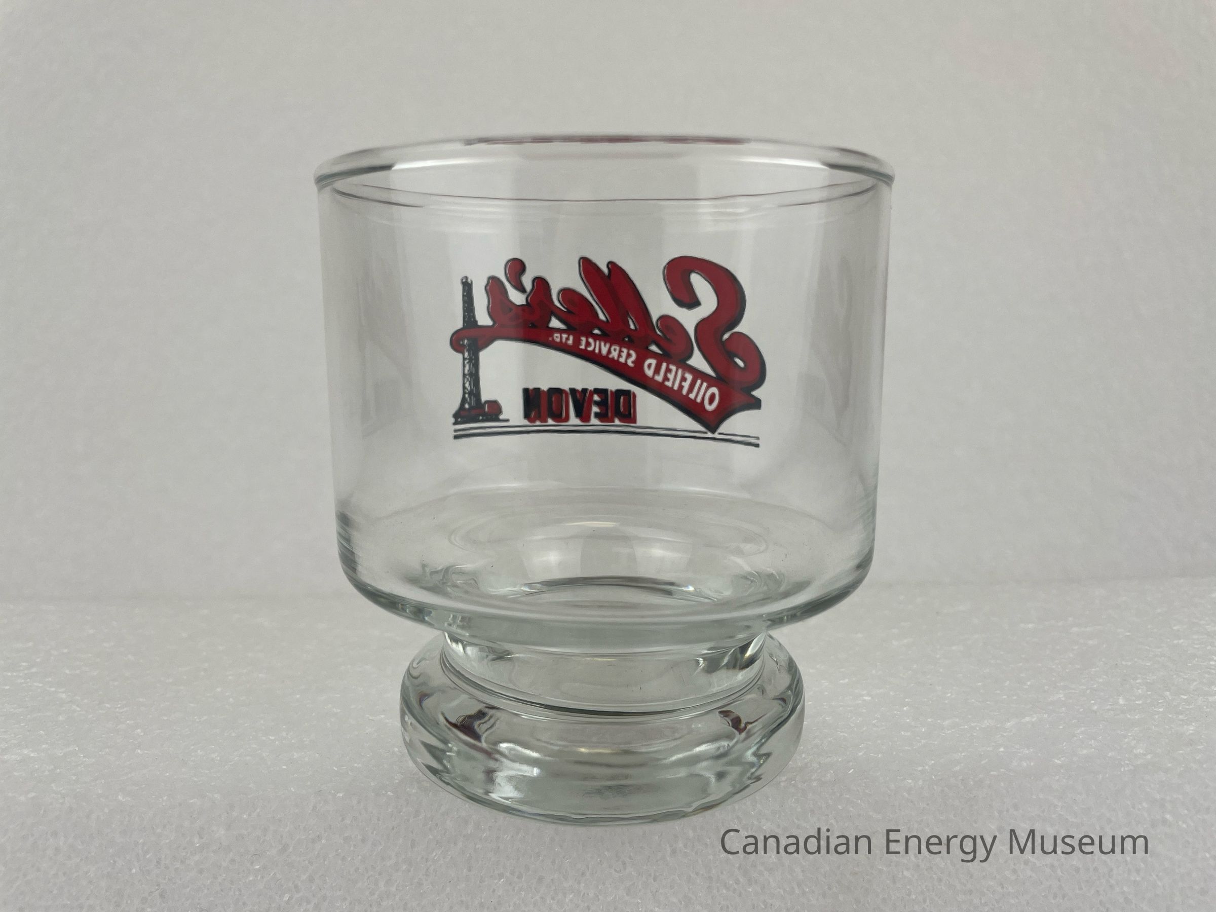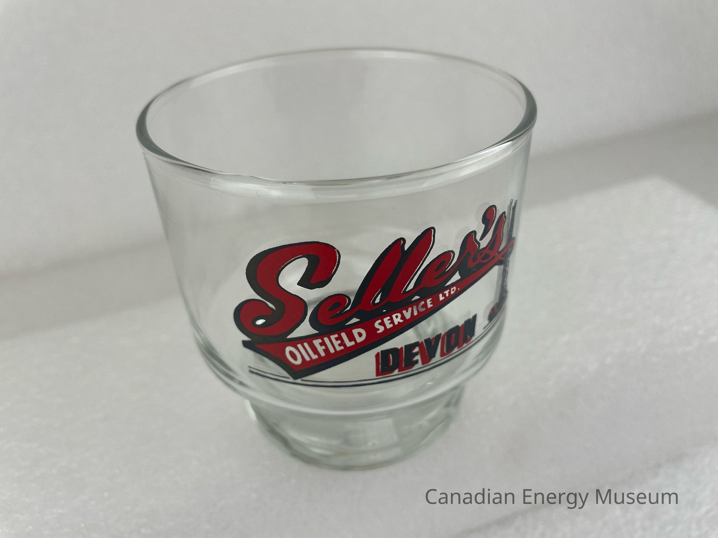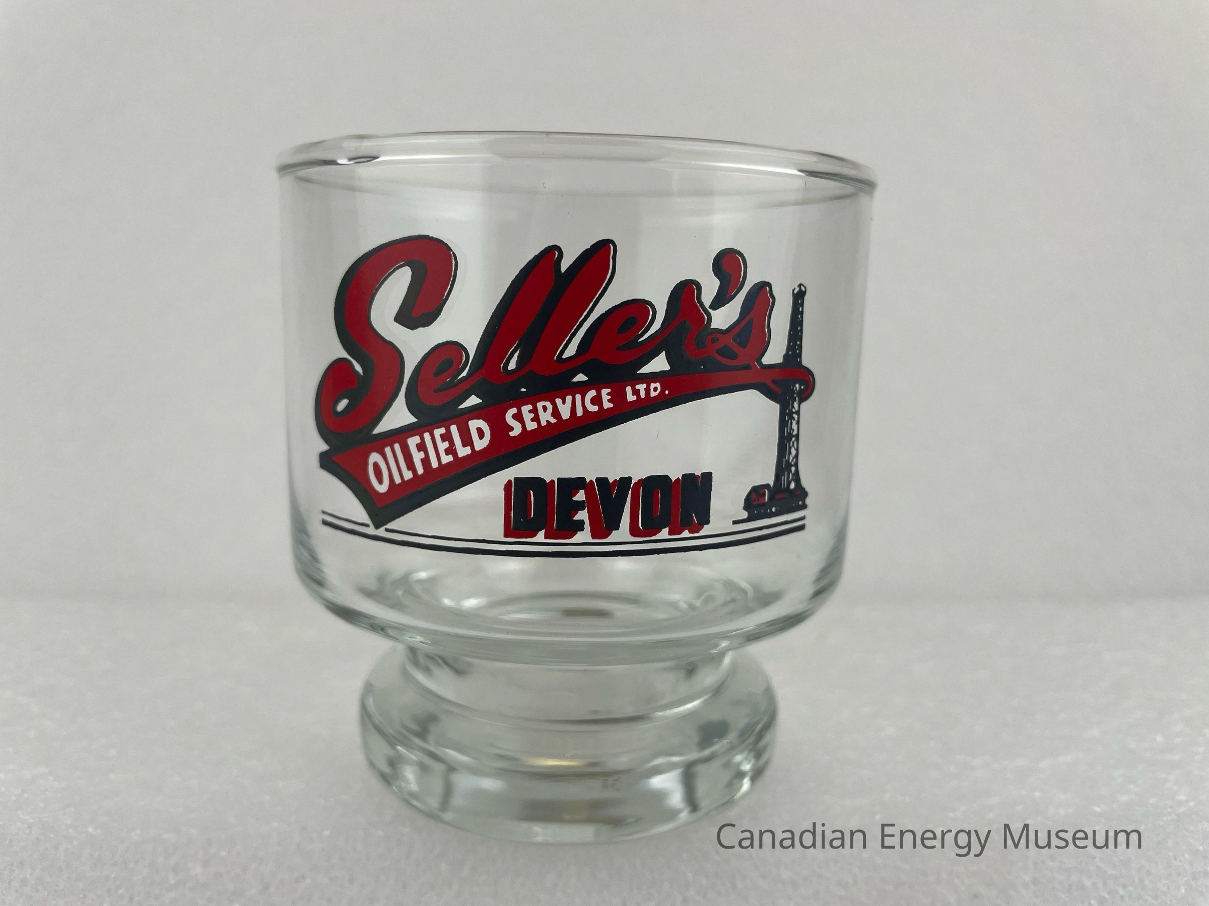 A clear whisky glass branded to Seller's Oilfield Service Ltd. The shape of the glass is straight, but it has a separate foot, which is smaller than the body of the glass. The design features large cursive text in red and black reading, "Seller's". Underneath, in a long triangular red and black banner, white text reads, "OILFIELD SERVICE LTD." Underneath and right-aligned is black text layered over red reading, "DEVON". To the right of the text is a black and red illustration of an oil derrick that is also being wrapped between the banner. At the bottom are two thin horizontal lines.Collection