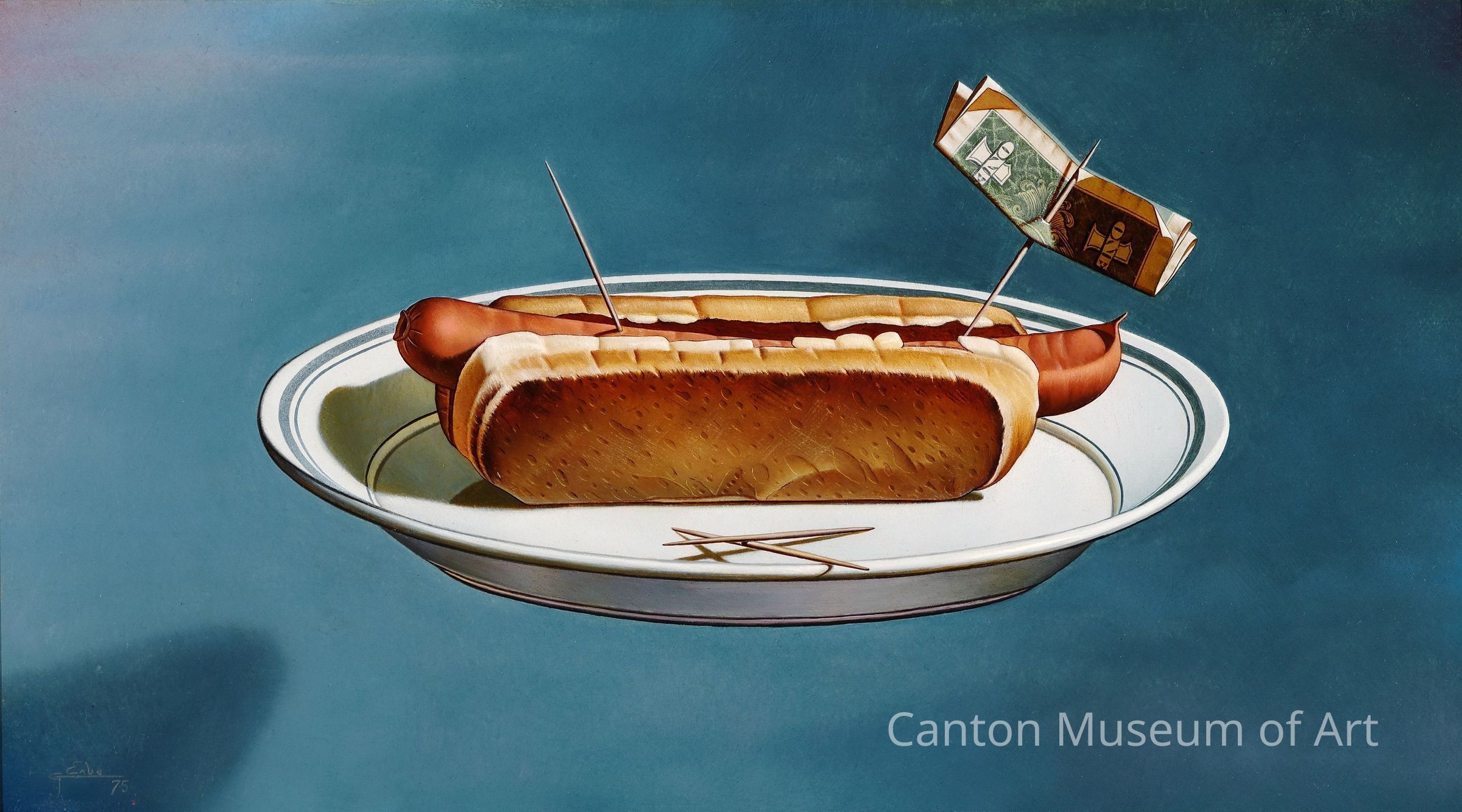 Erbe attached a dollar bill to this hot dog and titled this painting “76 Special” because hot dogs at hot dog stands increased in price to one dollar in the year 1976. Erbe was surprised that hot dogs were becoming so expensive, and used the dollar bill to convey that.