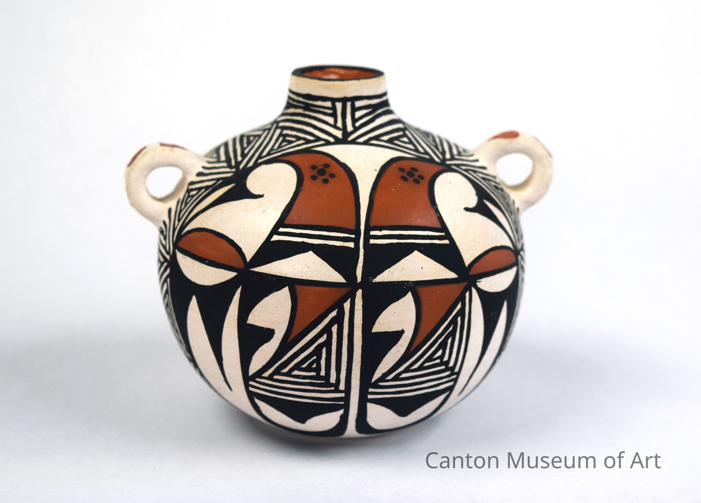 The pottery of Acoma (also known as Sky City), shows the history of the Acoma people, clanship and heritage, though influenced by the arrival of Spanish Conquistadors during the 16th century. Although this pottery is known to remain consistent in its making and decoration, many artists develop their own variations of this style, which show definitive and stylistic individuality. Highly traditional, this style of pottery demonstrates the unique character of the Pueblo of Acoma and its testimony to the continuing relationship between the Acoma and the world surrounding it.