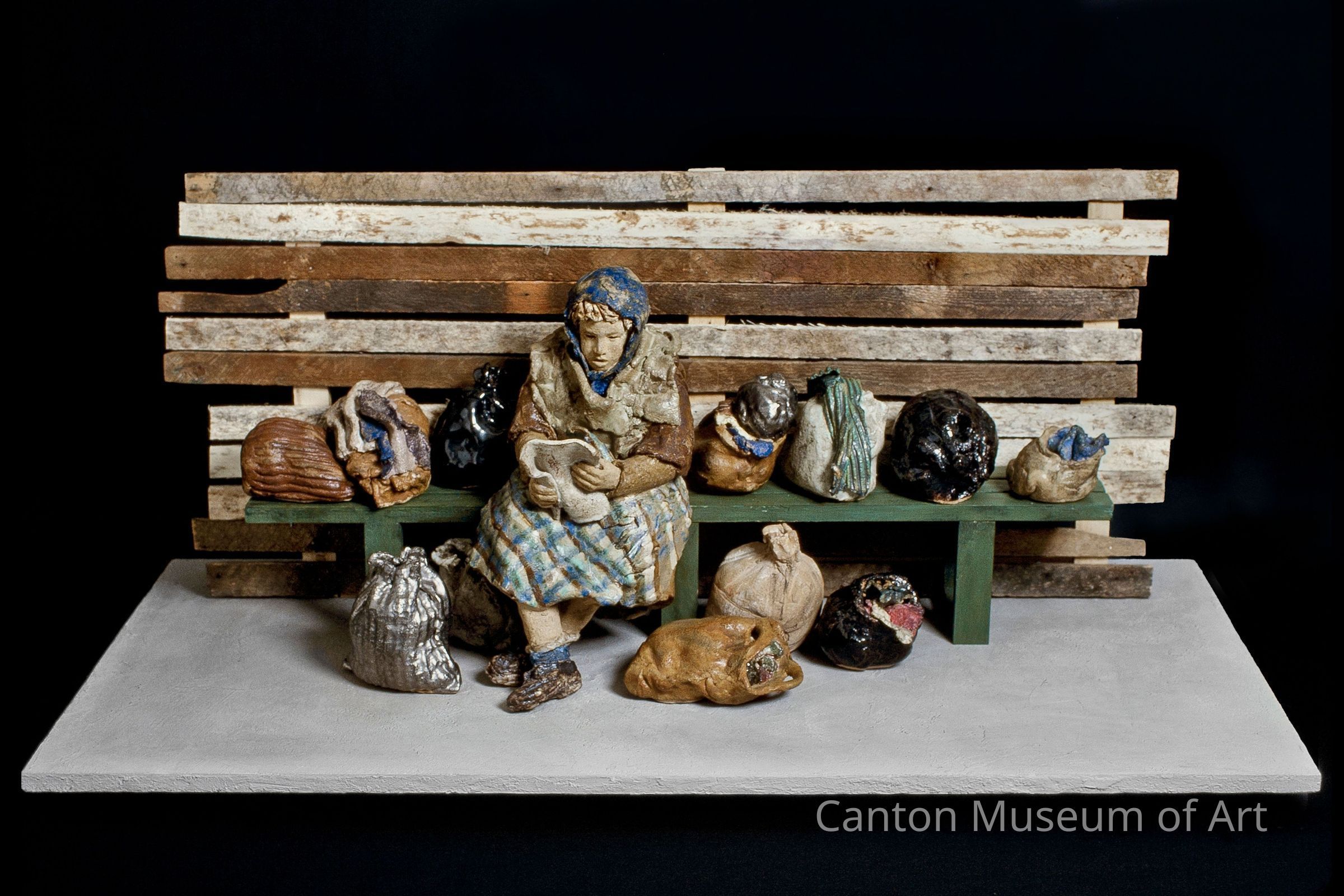 Susan Grabel is a New York sculptor, feminist, and social activist who explores the human dimension of social issues in her figurative sculptures. In this work, Grabel reflects on the urban environment: a place where on one block you’ll see boarded up buildings and the next, stretch limos. Commuting to Manhattan to her day job as a computer programmer and systems analyst in the early 1980’s she saw, daily, a homeless man in tattered dirty clothes huddled against a building next to an elegant store window. She was disturbed by the juxtaposition and made a series of works in clay and mixed media on homelessness. At the same time she became involved with Project Hospitality, an organization on Staten Island that provides services to the homeless. She organized and ran workshops for children in the shelter and was part of “Taking Art to Heart," an organization that produced exhibitions and performances to bring awareness of the issues of homelessness to the public. We usually ignore homeless people; they represent the failures of our society and we pass them by as if they were invisible. Using clay and wood in narrative sculptural environments, Grabel captures the desolation and humanity of the homeless, living on the edge of society, surviving as best they can on the streets.