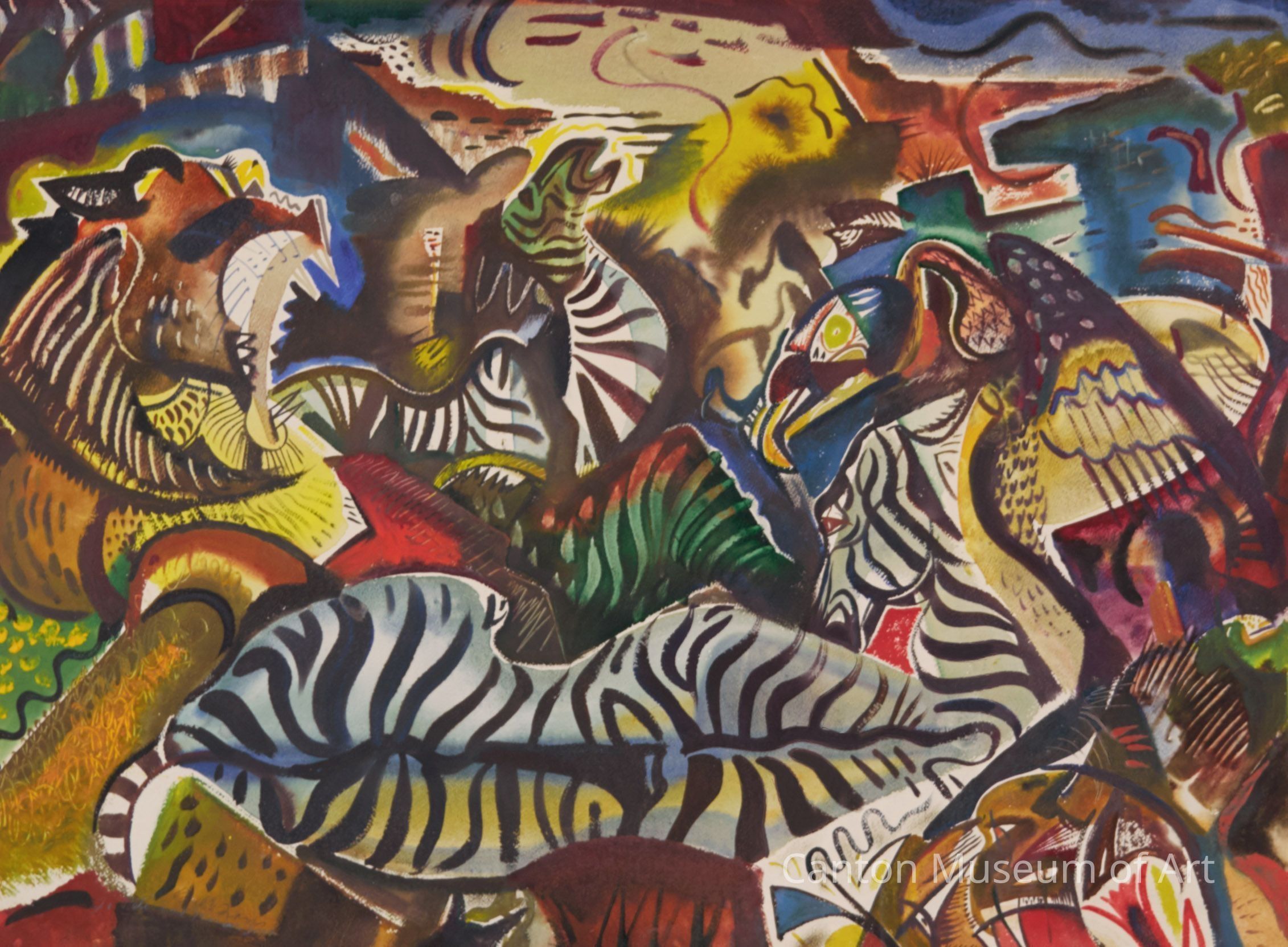 Travis' style is instantly recognizable for its bold, contrasting colors, geometric patterns, and stylized, abstract figures, all traits reminiscent of African art and textiles. In contrast to the many American artists of the period who painted regional scenes, Travis’ art often expressed emotion and the concerns of the 20th century — global colonization and exploitation, racism and inhumanity, and global apocalypse. Travis often used symbolic elements in his work to convey deeper meanings. This particular African scene, though done in bright colors, has a somber mood from the expressions of the animals depicted, possibly referring to global exploitation of natural resources.