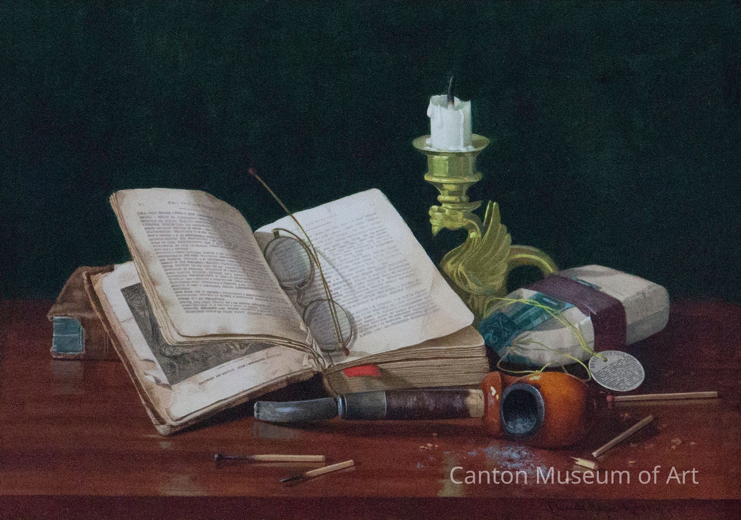 The hyperrealistic style in "An Interesting Book" exemplifies the traditional technique of trompe l’oeil, French for “deceives the eye.” Hirst’s skill in rendering tight contours, tonal values, reflections, and textures resulted in successful illusionistic images. At the time, trompe l’oeil works were typically