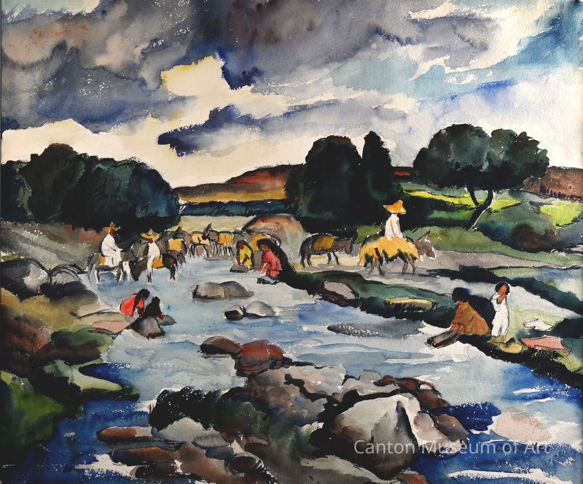 On all of these trips she taught and lectured almost every day, to audiences that ranged from university students to primary school children. In many places, art materials were scarce due to a lack of funds. Bradley was known to take students up into the hills to dig their own clay to use for paint pigment, as captured here in this work. She also brought many art supplies with her to donate to her students. She found plenty of time and inspiration to create her own art during these times, and returned to the U.S. with more than 60 paintings, as well as the nickname "the paintbrush ambassador."