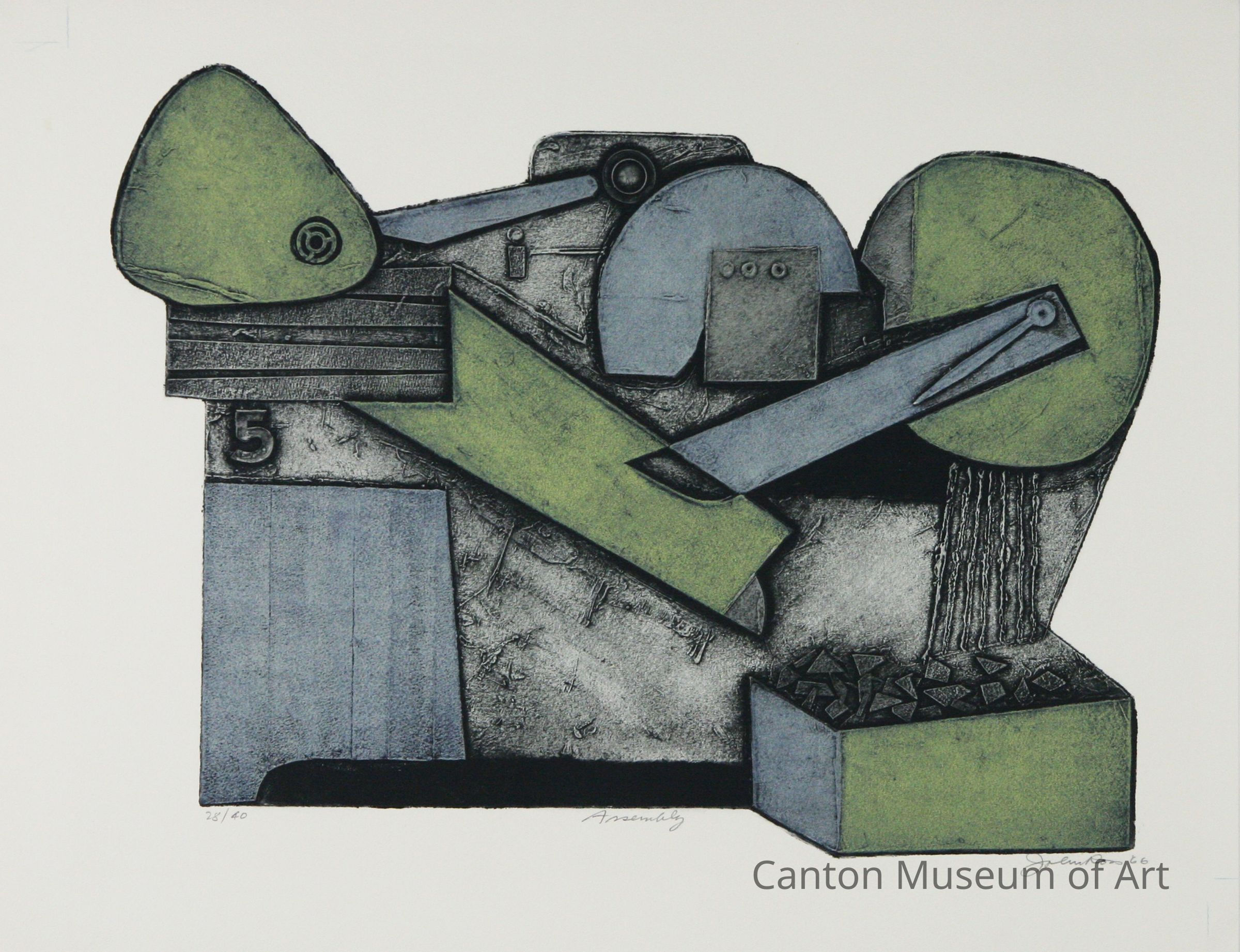 “One of the most useful printmaking techniques for my images,” said Ross, “is the collagraph, which I helped to develop. The plates for this method are generally made of mat board with gesso adhering paper, fabrics, cardboard, and found objects to the mat board base. Razor blades can cut lines and other shapes to place on the base. From these ordinary materials, I can create city streets, mountains, canyons, oil refineries, skyscrapers, and other constructions, either realistic or visionary.”