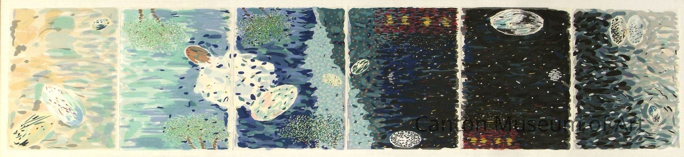 In 1980, Bartlett embarked on a collaboration with master printers of the Simca group in Japan. The monumental result was At Sea, Japan, an 8-foot long composition comprised of 96 screenprints and 86 color woodcuts printed on six sheets of Japanese paper hung horizontally, side by side.