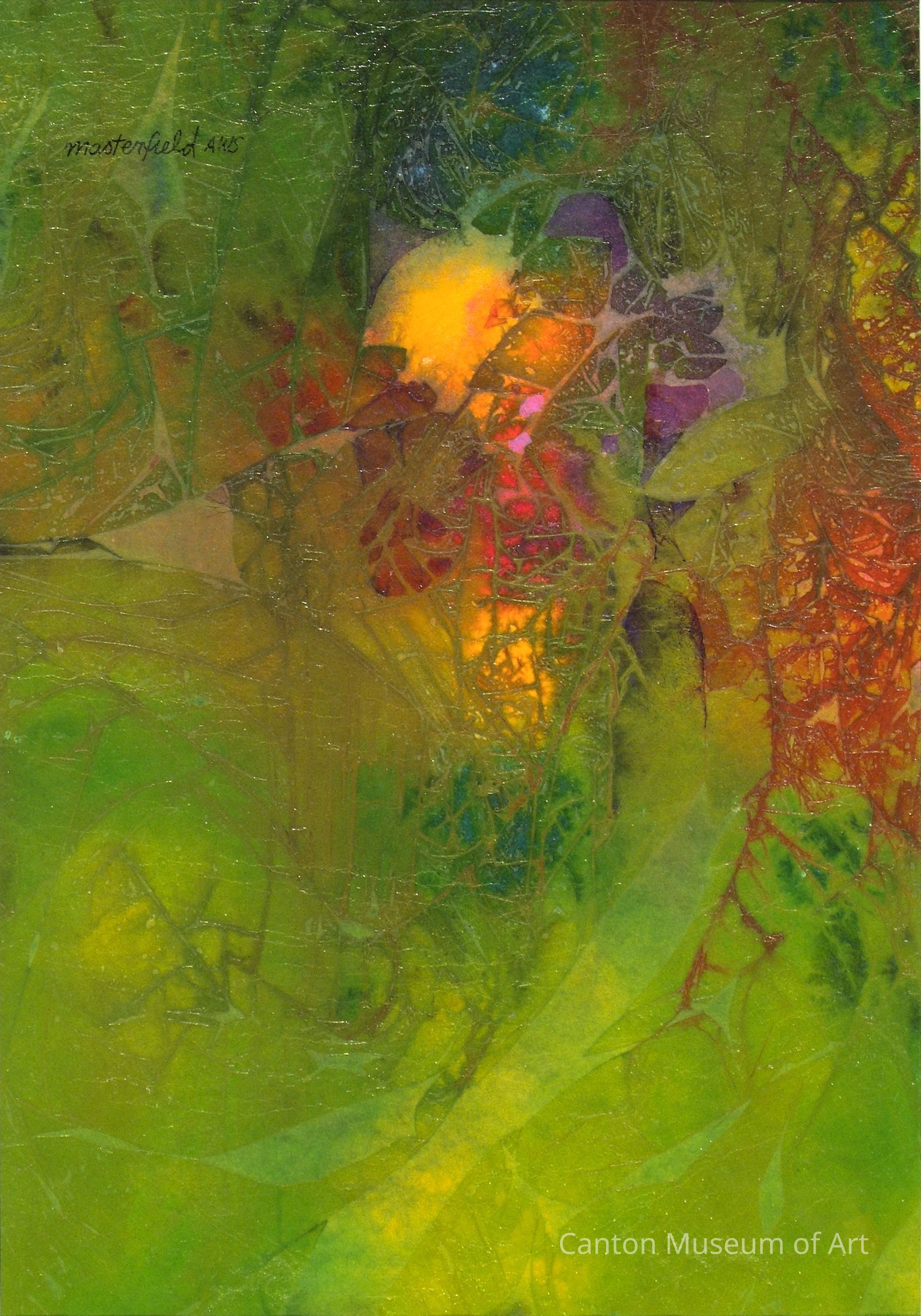 Masterfield finds her inspiration in nature - her studio is filled with collections of found rocks, geodes, fossils, and skeletons that she studies to find abstract images. She describes herself as an abstract naturalist painter: “The abstract naturalist artist knows that no one scene can capture the essential reality because nature is always in a state of flux…in the end; it is the mind, not the eye, that controls our vision.”