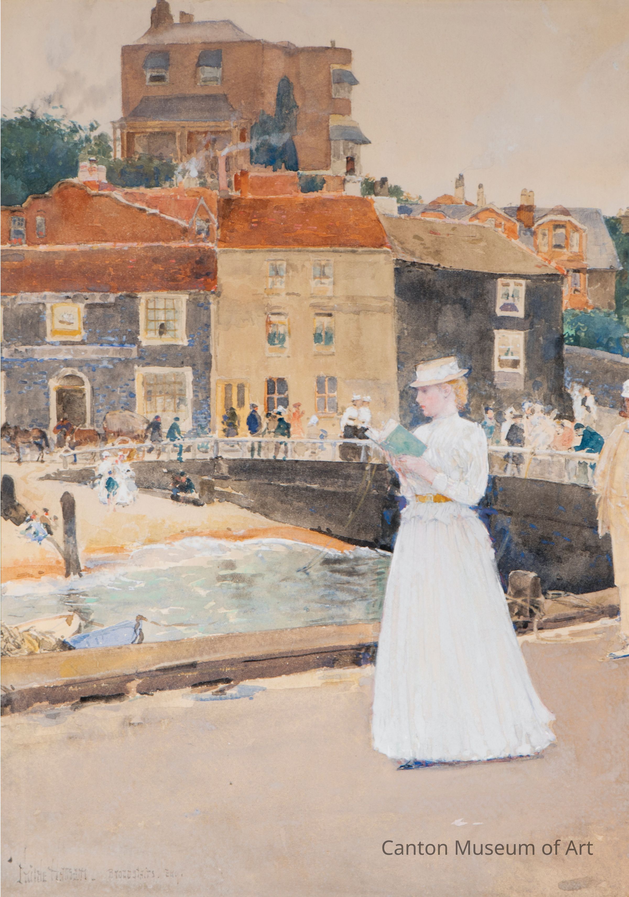 In the very background of this watercolor, slightly left of center, is Bleak House (formerly named Fort House). Bleak House is a prominent house in the United Kingdom on the cliff overlooking the North Foreland and Viking Bay in Broadstairs, Kent. It was built around 1801. Charles Dickens spent summer holidays at Bleak House in the 1850s and 1860s, and it was there that he wrote David Copperfield. It's fitting that the main subject of this piece - the woman in white in the foreground - is reading a book.