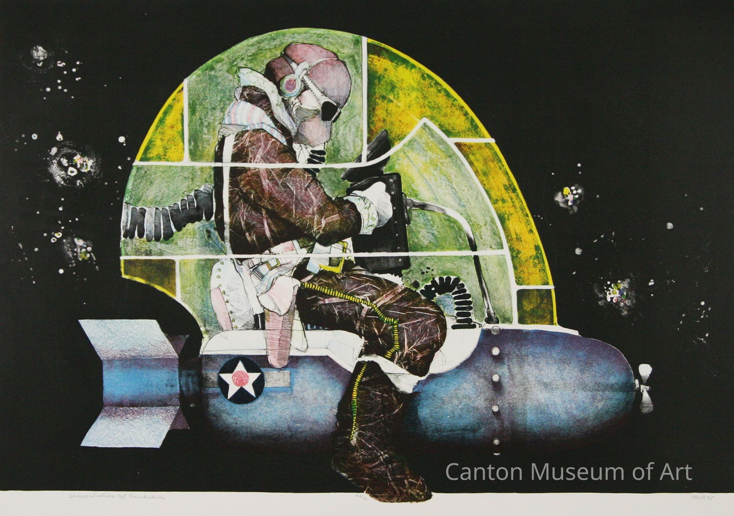 From World War II is "Bombardier," a U.S. B-29 bomber, recognizable as such through the windows we look through to view the bomber. The Boeing B-29 was the most capable bomber of WWII, flying faster and at higher altitudes than other bombers, enabling long-range systematic bombing. Doyle's "Bombardier" rides on a bomb through the night sky, looking down at his bombsight device. Through this work, Doyle hints at the dehumanizing impact of technology in war and how it enables indiscriminate killing at great distances on anonymous "targets."