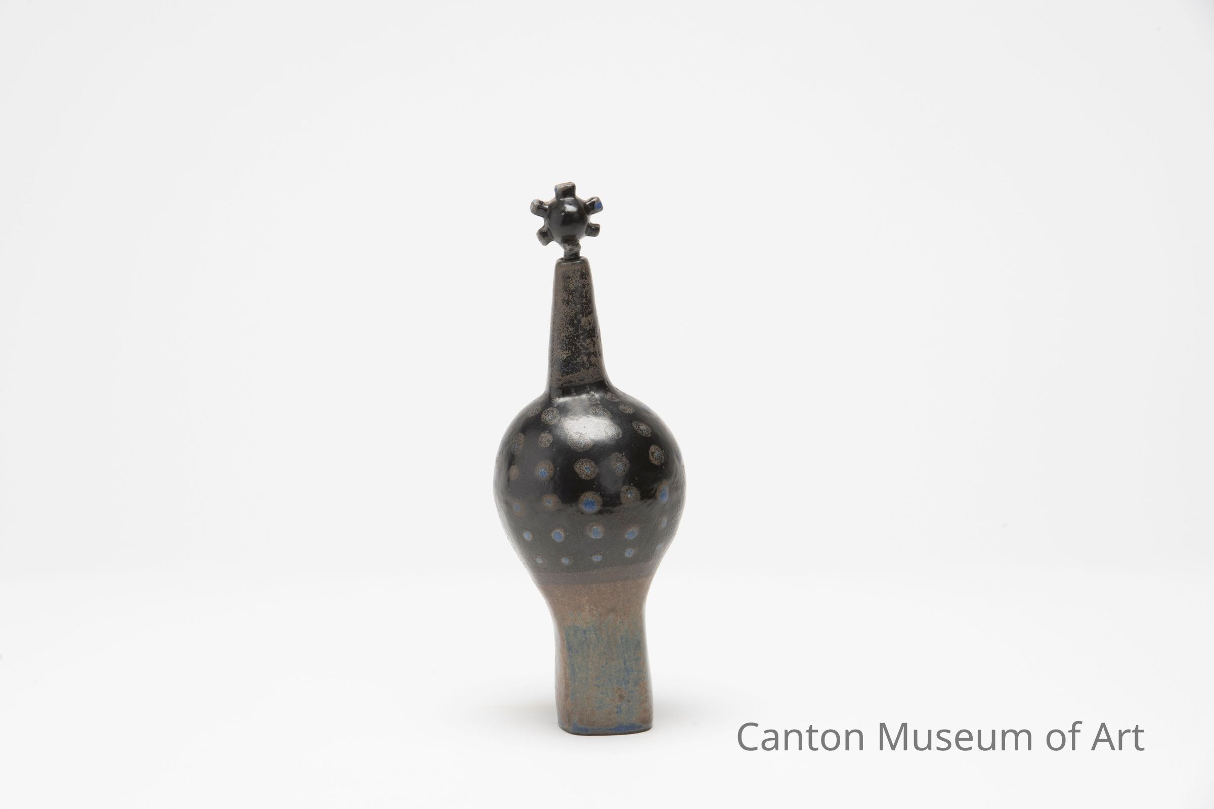 Many of Leza's works, like this one, feature a bottle shape with a stopper at the end. The stoppers often took on an element of the surreal in their shapes that looked like abstracted animal heads—cats or chickens, or in this case maybe a lion, though she once said "I'm not thinking of animals when I do them, they go ahead and do themselves."