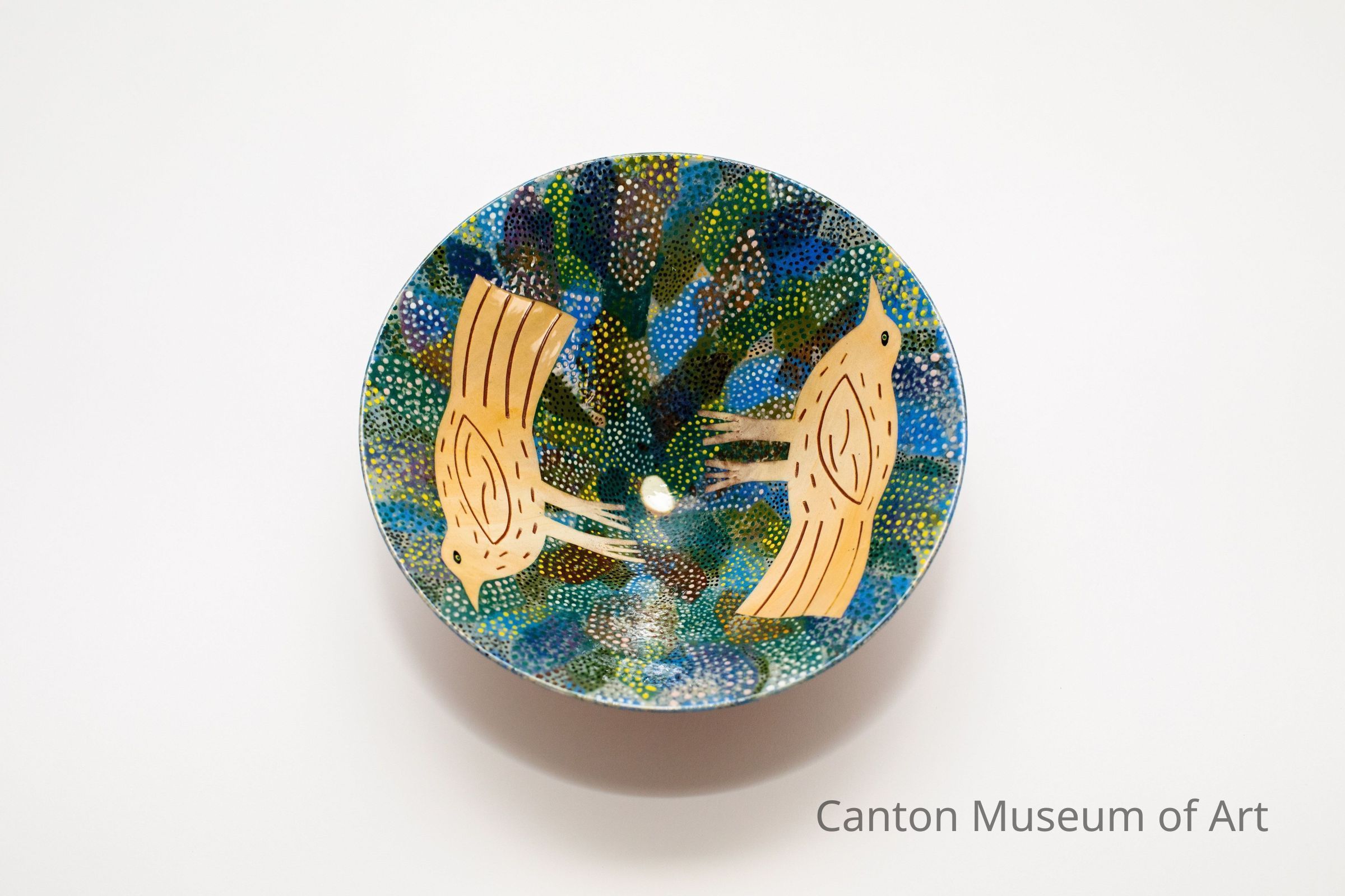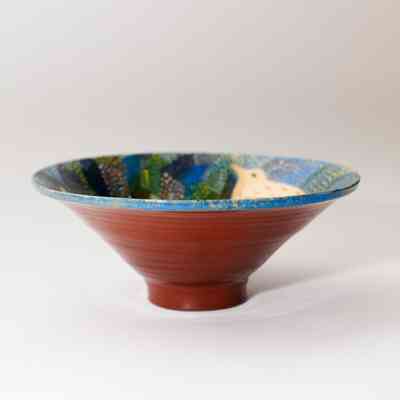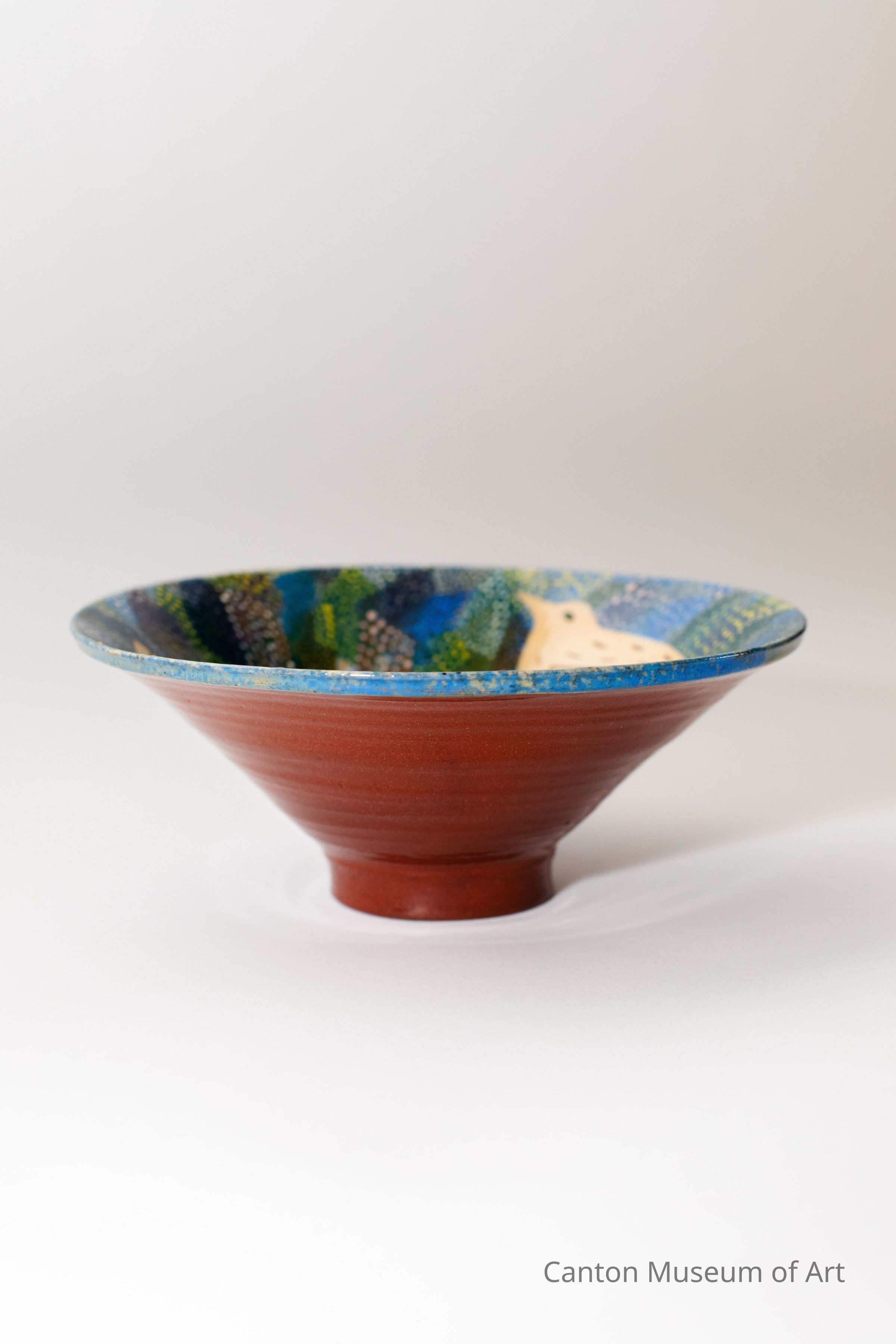 This piece was created by Jackie Cohen in collaboration with Vaugh Smith. Jackie Cohen and Vaughn Smith are co-owners of Westcote Bell Ceramics, located in Mansfield, Ohio. Jackie is originally from Michigan and Vaugh is from England. They met during an exchange course at Aix-en-Provence, France in 1977 and started Westcote Bell Ceramics in England, moving to Mansfield in the early 80s.