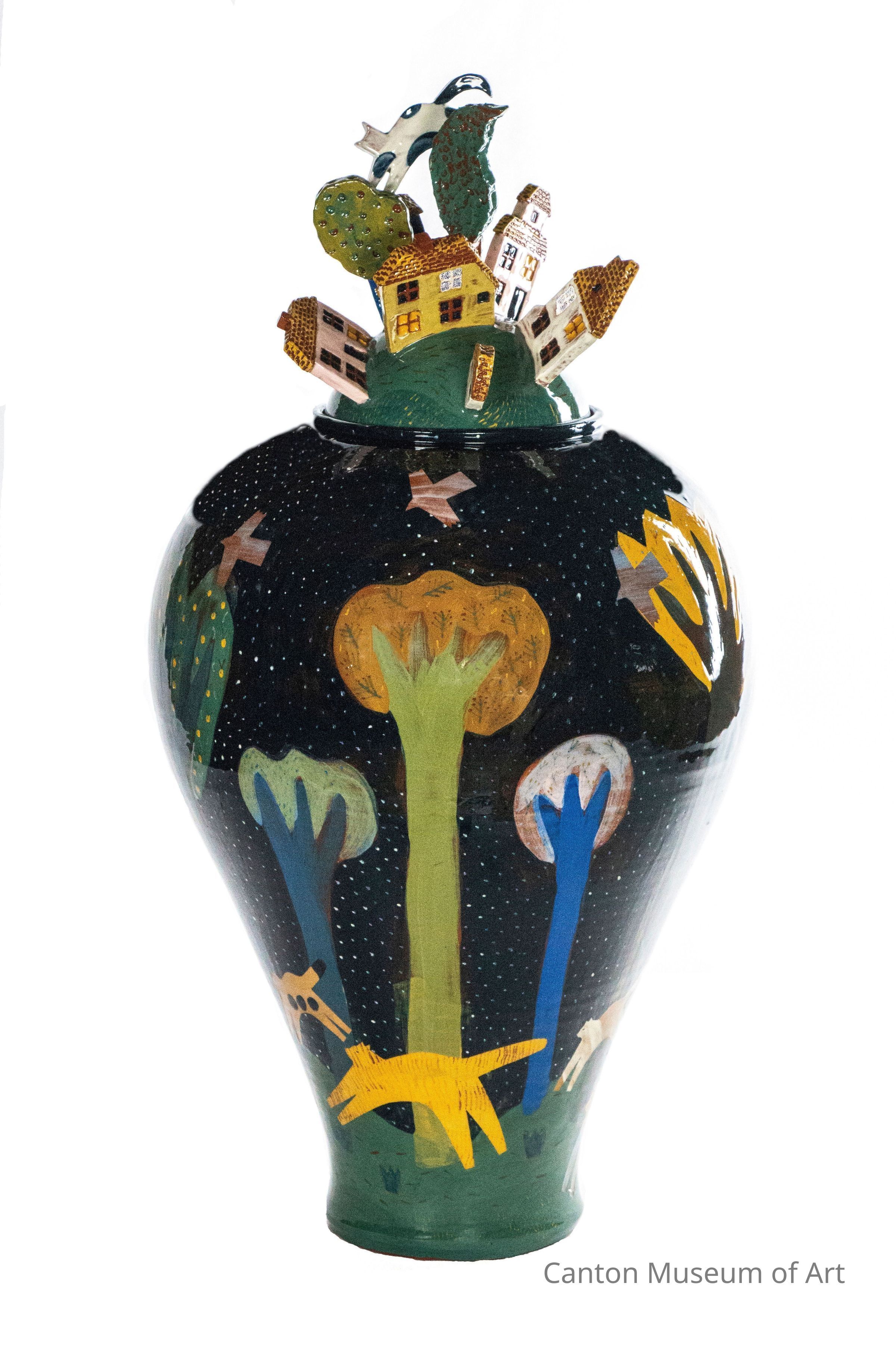 “Cats in a Dangerous Land” - what story can you create about it? This piece was created by Jackie Cohen in collaboration with Vaugh Smith. Jackie Cohen and Vaughn Smith are co-owners of Westcote Bell Ceramics, located in Mansfield, Ohio. Jackie is originally from Michigan and Vaugh is from England. They met during an exchange course at Aix-en-Provence, France in 1977 and started Westcote Bell Ceramics in England, moving to Mansfield in the early 80s.