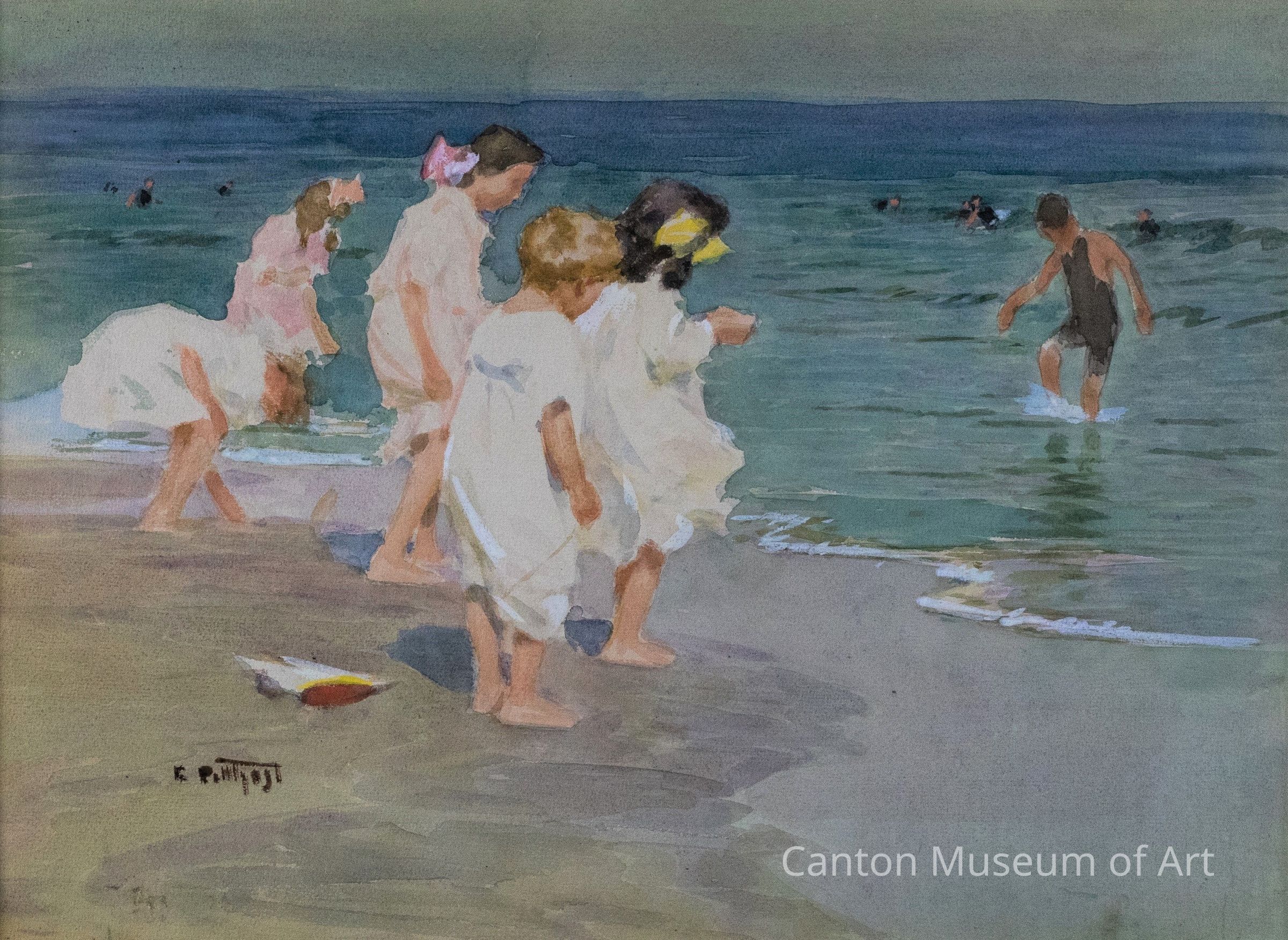 Potthast's paintings portray mostly women and children for whom the steamer, railroad, electric trolley car, and subway made the beach more accessible. The man of the family, working five and a half or six days a week, seldom appears in Potthast's works, which were more likely painted during the less crowded weekdays to allow the artist some privacy. In those days, when the weather was fair, Potthast could be seen journeying out to the beach with his easel, paint box, and panels. "Children Playing at the Beach" was most likely painted on Coney Island, Rockaway, Manhattan Beach, or Brighton Beach, the spots in New York where Potthast was active c. 1915 to 1920.