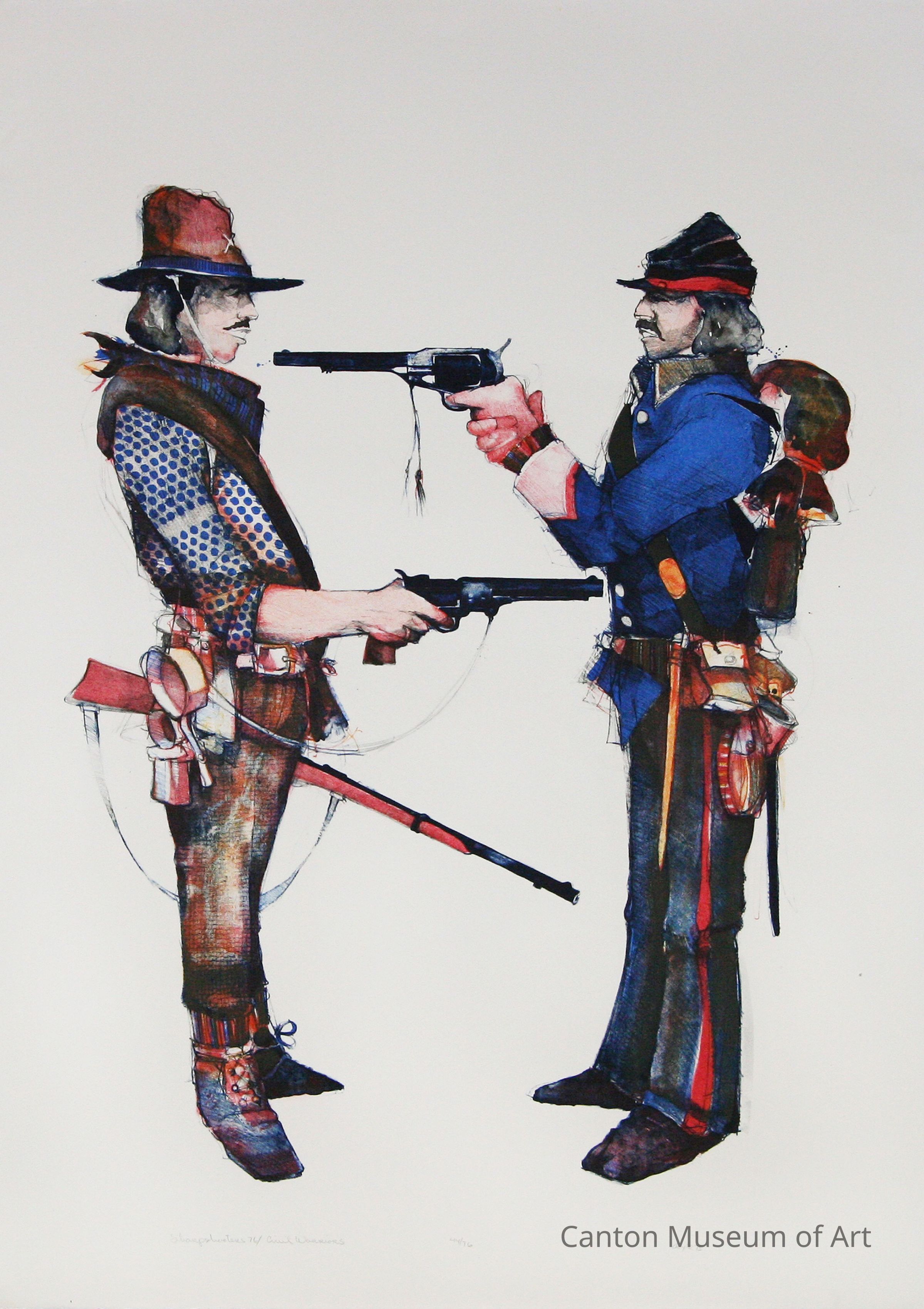 John Lawrence Doyle was known for his lithographs reflecting his fascination with the human condition. For over a decade, Doyle studied ethnology and anthropology. Directly after the end of the Vietnam War, and in anticipation of the U.S. Bicentennial in 1976, Doyle created a series of 11 lithographs - "Sharpshooters 76;" which presented soldiers from wars of America’s past in chronological order. “I wanted to do something that people at the time didn’t particularly want to deal with — war. Particularly, coming so close to the end of the Vietnam era. Folks just sort of wanted to forget it. I also wanted to show that the history of this country is a rather bloody affair, a war every twenty years or so. Courageous no doubt, but dehumanizing nonetheless. This dehumanizing process is what I hoped to show through the evolution of the wars, from the somewhat gentlemanly conducted affair of the Revolution to the dehumanized slaughter of Vietnam.”