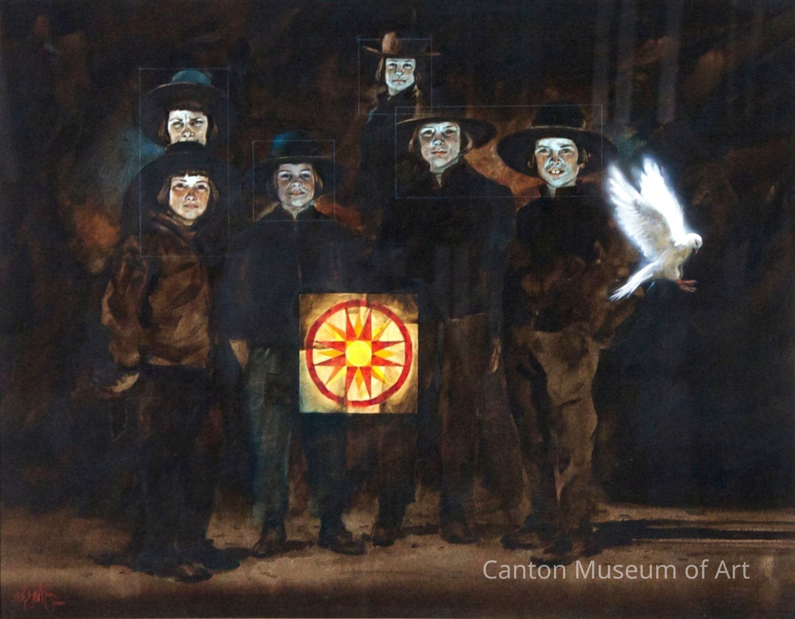 “My painting Contradictions? interprets the Amish lifestyle admittedly through the eyes of an outsider. The low-key somber mood and faint boxes around the heads of each of the boys depict a degree of isolation, symbolizing their separatist faith. The dark background is an excellent foil for the hex sign and the white dove. The dove represents the spirit and the hex sign superstition, hence the title Contradictions?”.