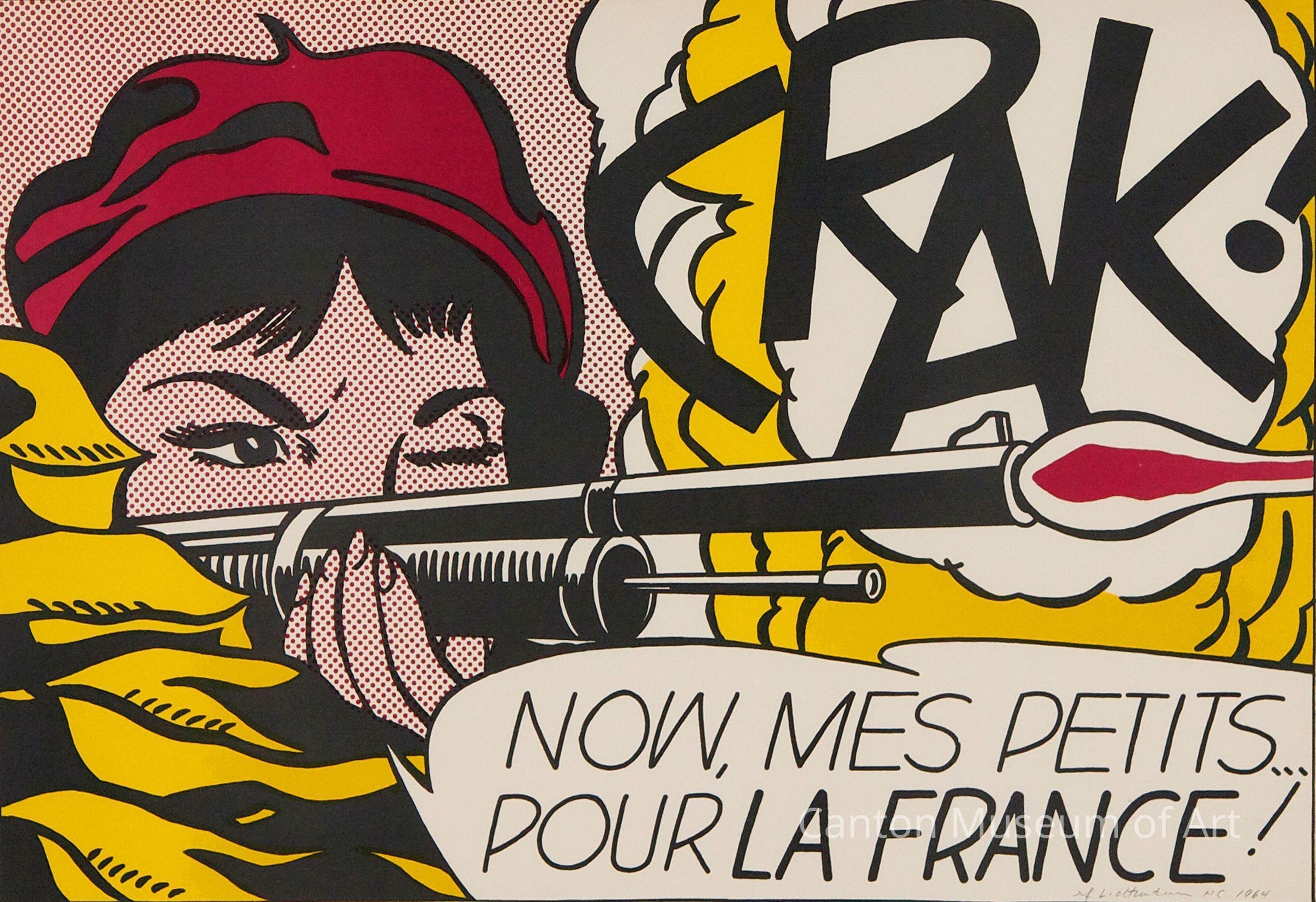 A leading figure in the Pop art movement, Lichtenstein's work was inspired by the comic strip and advertisements. "CRAK!" is considered one of Lichtenstein's first Pop prints that draws on comic strip imagery. The visuals used for "CRAK!" are from Bob Haney and Jack Abel's 1962 DC comic, "Star Spangled War Stories #102," and used as a marketing poster to announce Lichtenstein's 1963 exhibition at Leo Castelli Gallery in New York.