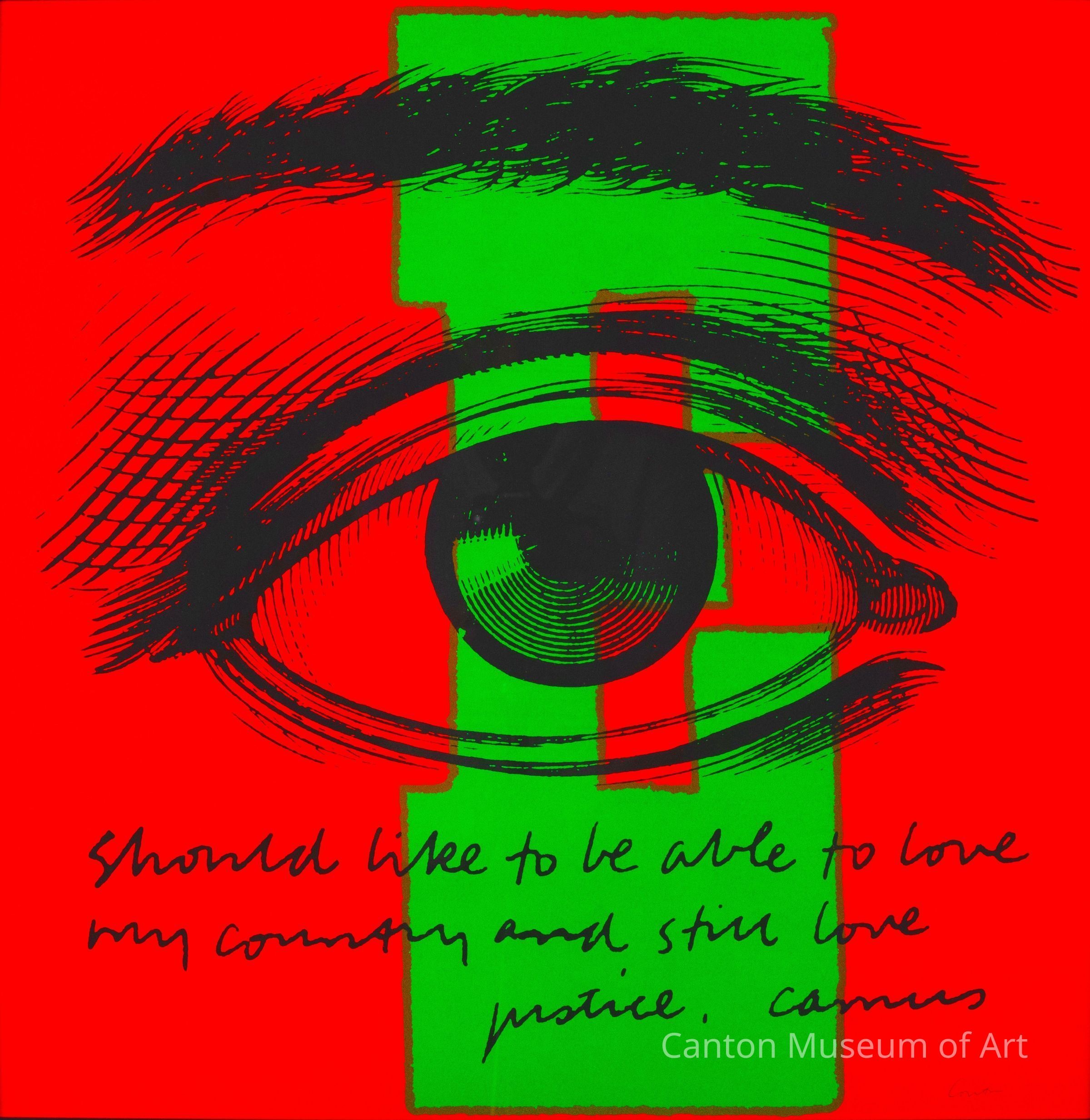 "e eye love" is one serigraph from a series of 30 made by Corita Kent titled "Circus Alphabet." With 26 letters of the alphabet and 4 serigraphs spelling out "DAMN" "EVERYTHING" "BUT THE" "CIRCUS," Kent created the series in Boston in 1968 while she was on a sabbatical from Immaculate Heart College, shortly before she would seek dispensation from her vows. In Kent's handwriting across the bottom of "e eye love" it reads "Should like to be able to love my country and still love justice. Camus" The letter e and the eye in front of it represent the "I" to start the quote in bold, bright colors. The quote is from Albert Camus, a French playwright, author, and journalist who was awarded the Nobel Prize in Literatuure in 1957.